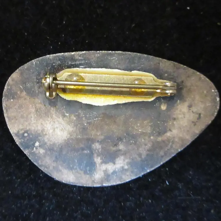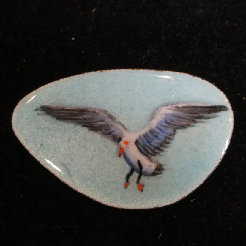 This is a BEAUTIFUL VINTAGE enamel on copper brooch. The brooch has the hand painted image of a seagull covered with a clear enamel coating. It has been backed to melt the clear coat over the hand painted bird. This brooch has an egg-like oval shape; more free-form. The blue sky background is BEAUTIFUL and perfectly matches the seagull image. This pin has some patina on the back, but the front is PERFECT! It has a pin back with a sliding C closure. It is about 1.5 inches wide.