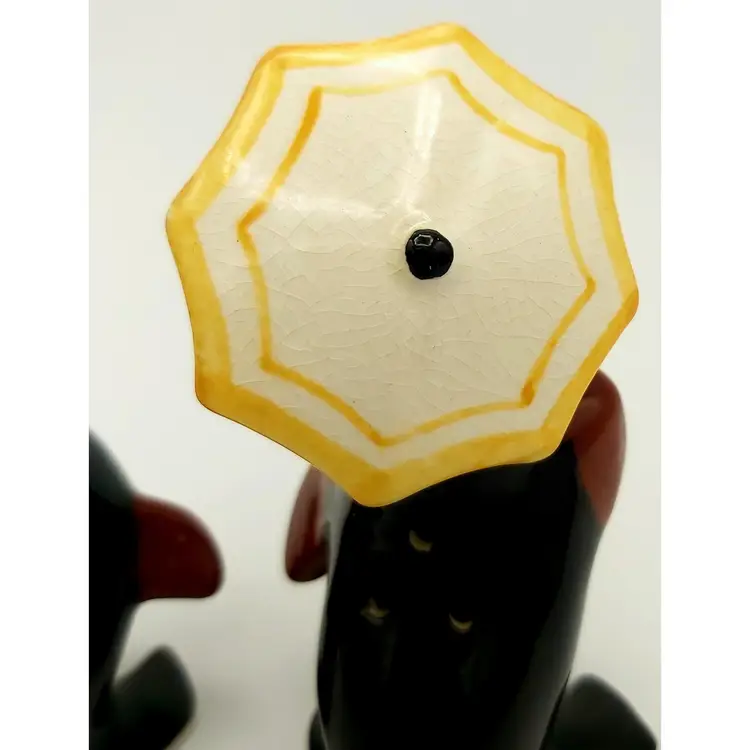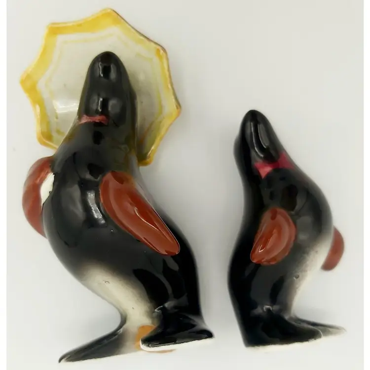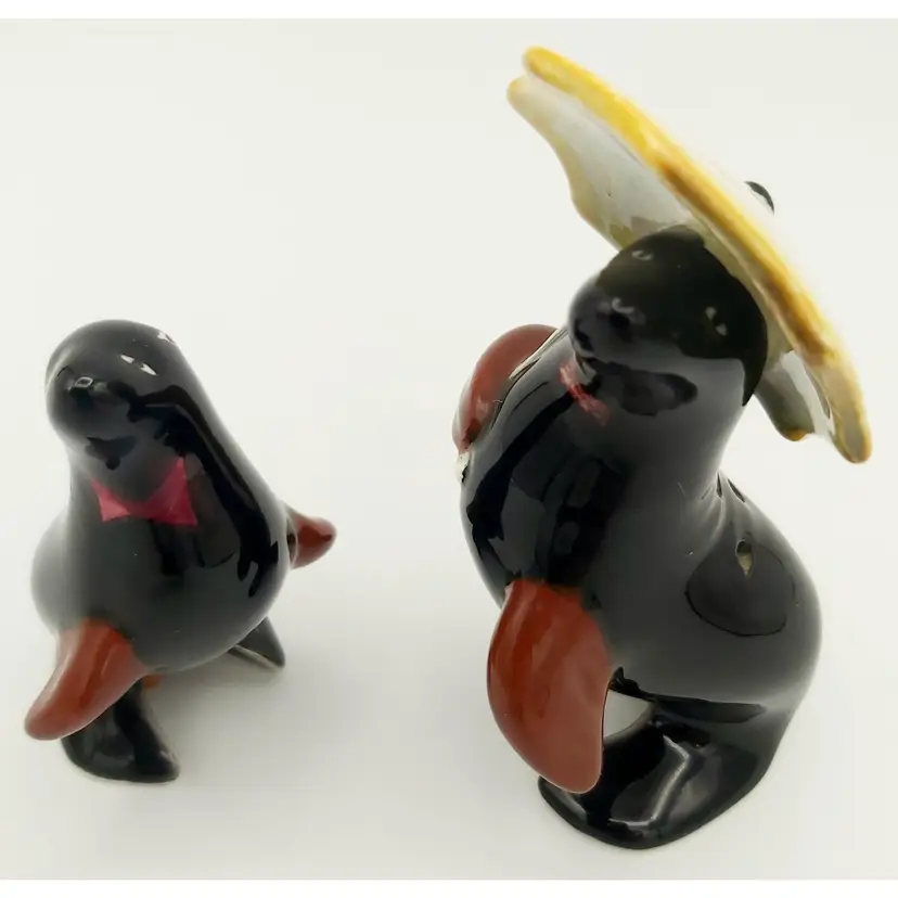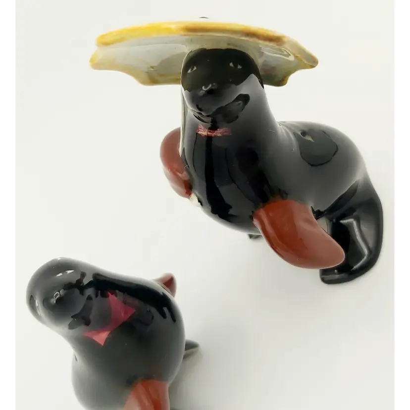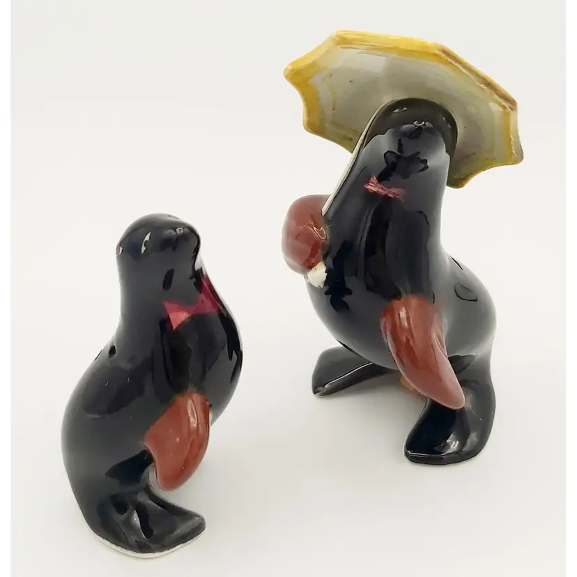 These dashing seals are hand painted, wearing bow ties, one is holding a parasol. No chips or crack, but do have natural crazing. See pictures for details. Unmarked but feel like Japan. Seal holding parasol measures approx. 3 1/2" high x 2 1/4" wide x 2" deep. The other seal measures approx. 2 3/4" high x 2" wide x 1 3/4" deep.
