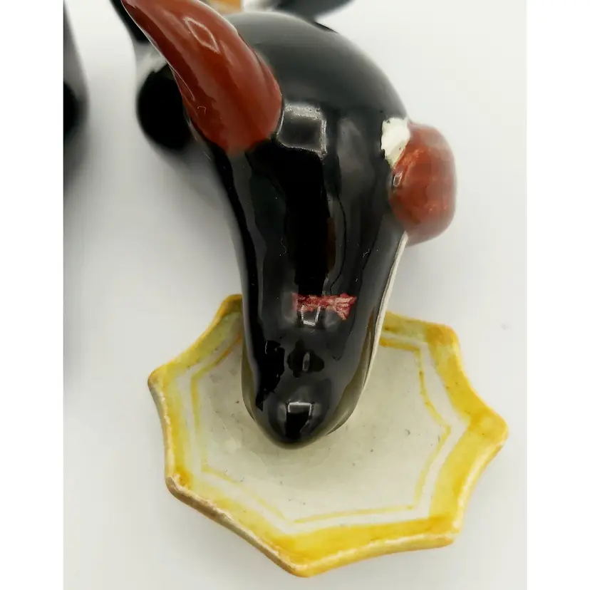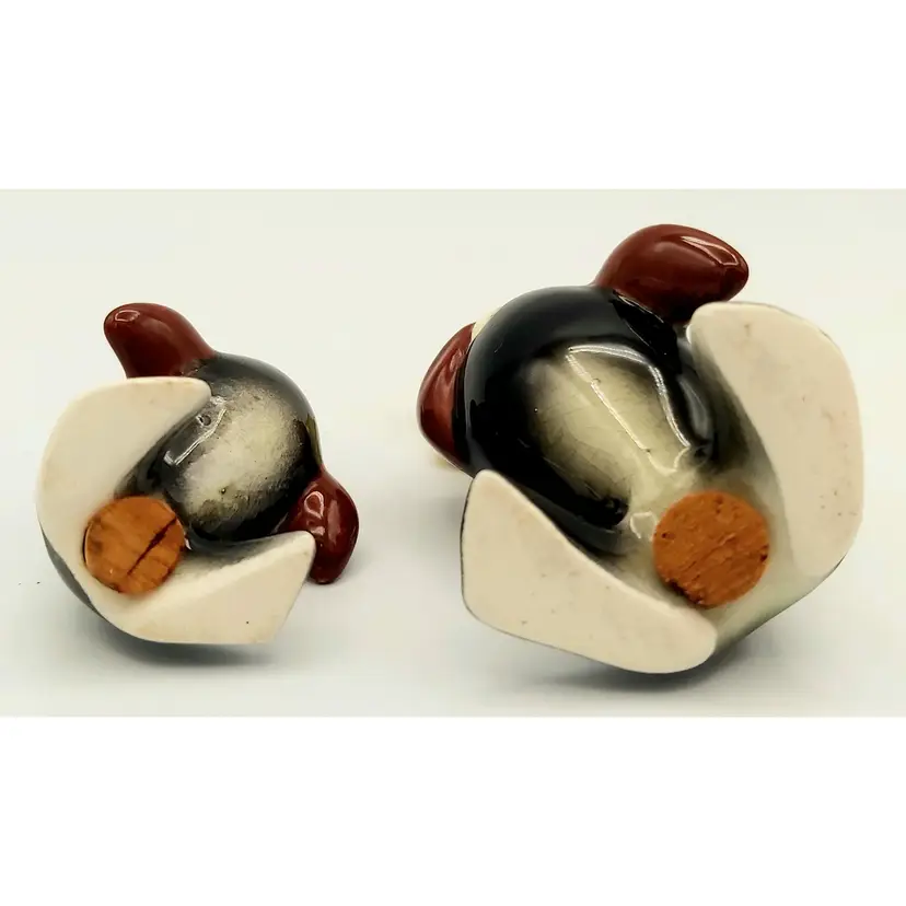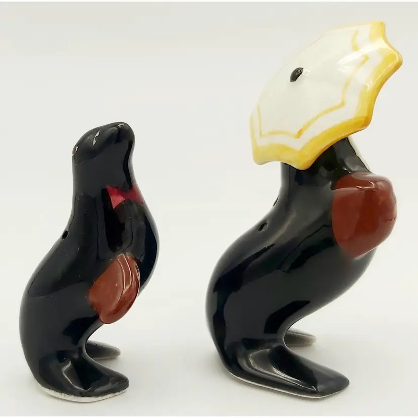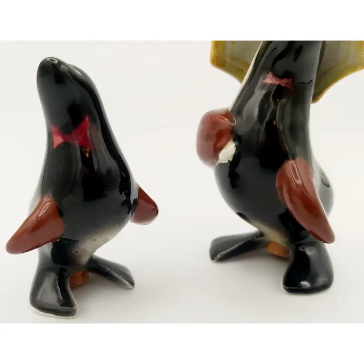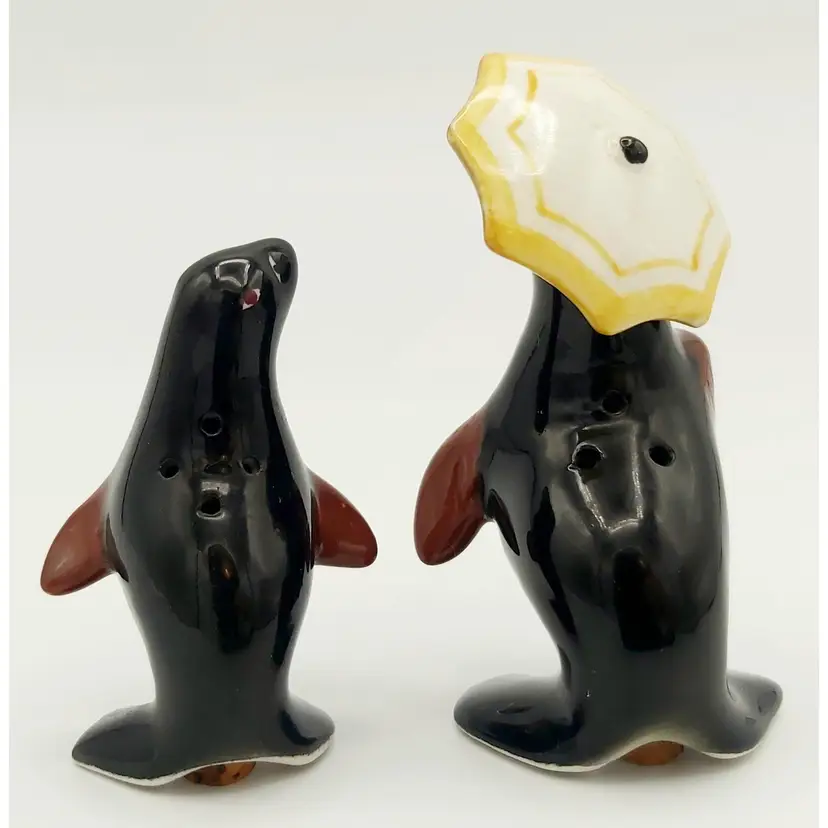 These dashing seals are hand painted, wearing bow ties, one is holding a parasol. No chips or crack, but do have natural crazing. See pictures for details. Unmarked but feel like Japan. Seal holding parasol measures approx. 3 1/2" high x 2 1/4" wide x 2" deep. The other seal measures approx. 2 3/4" high x 2" wide x 1 3/4" deep.