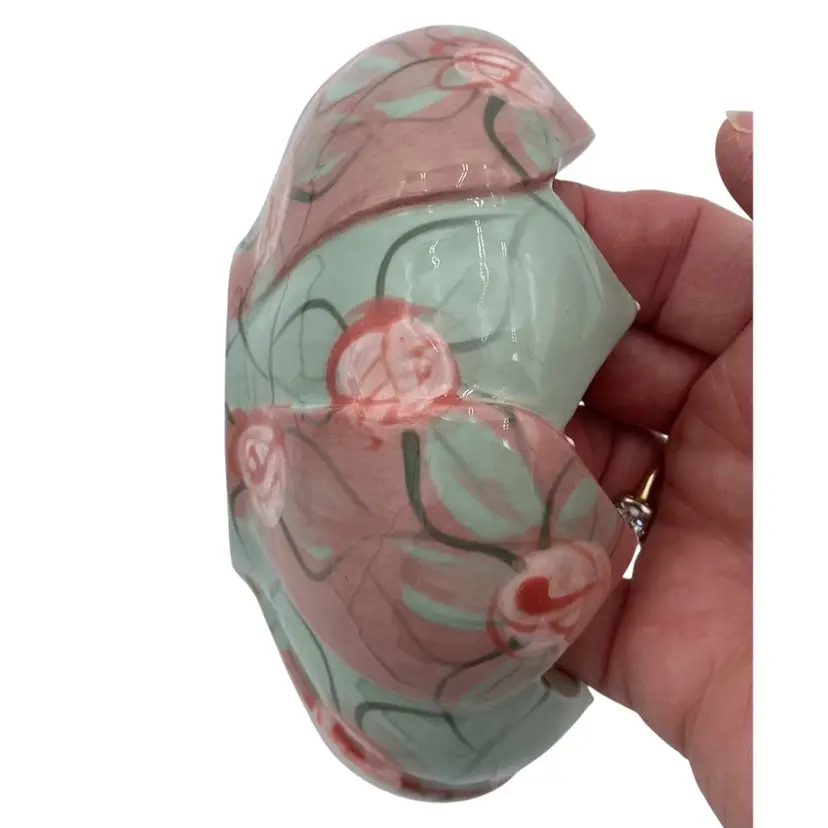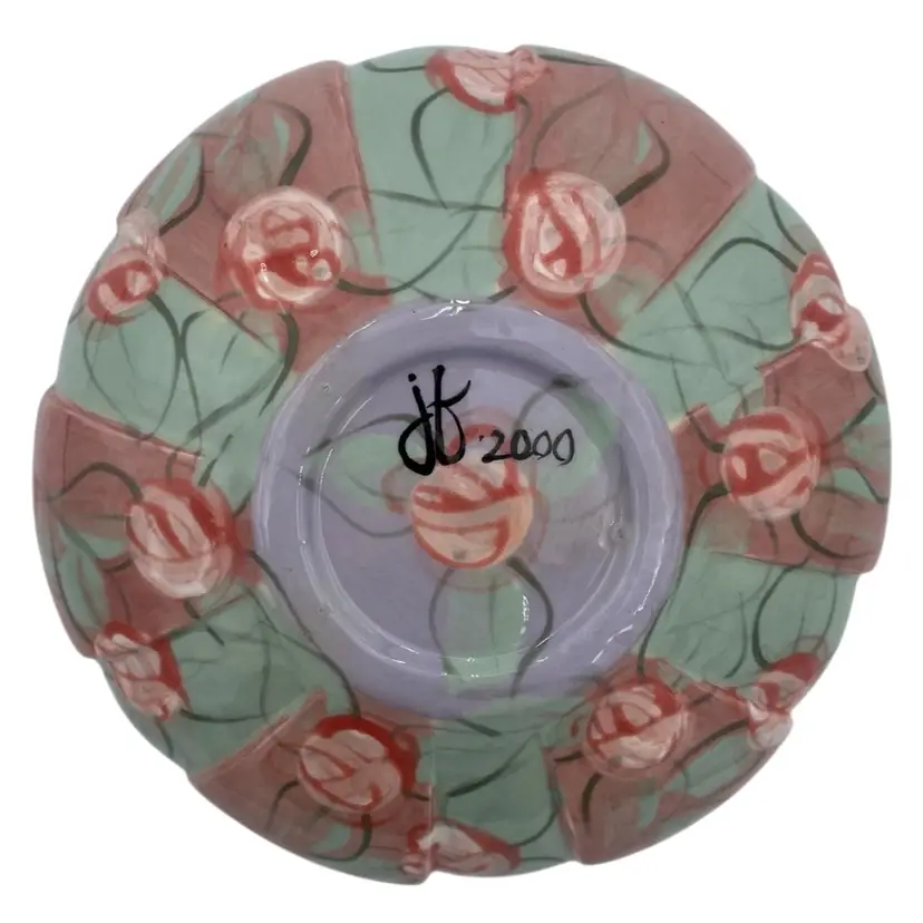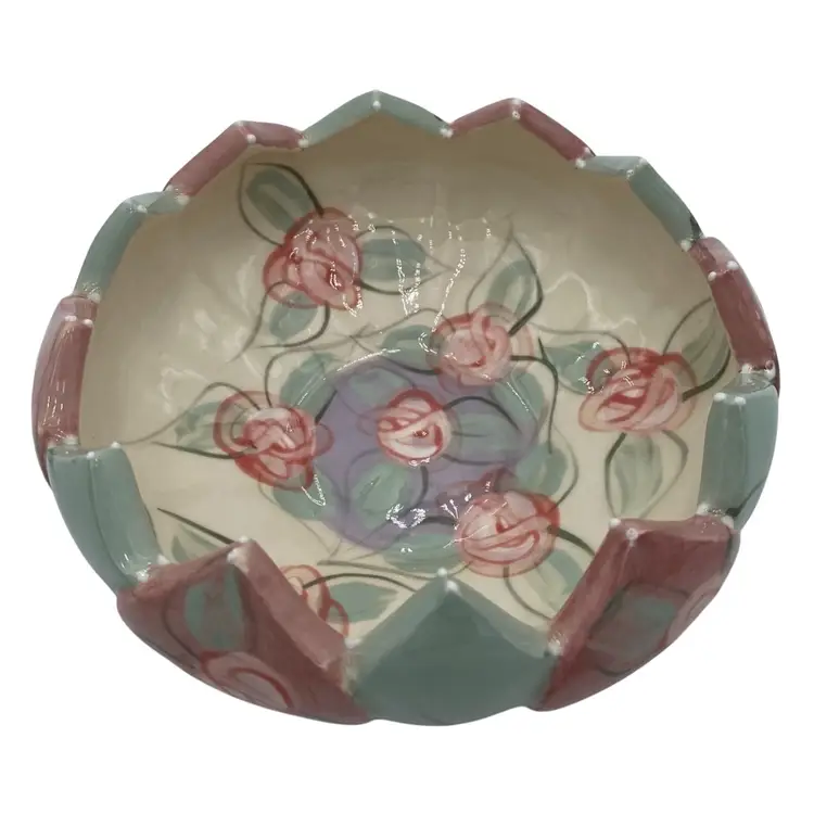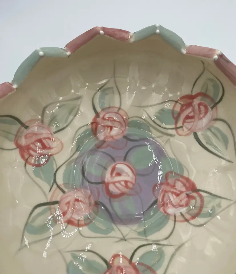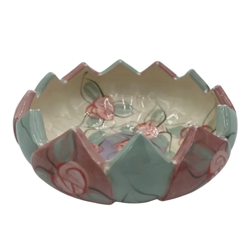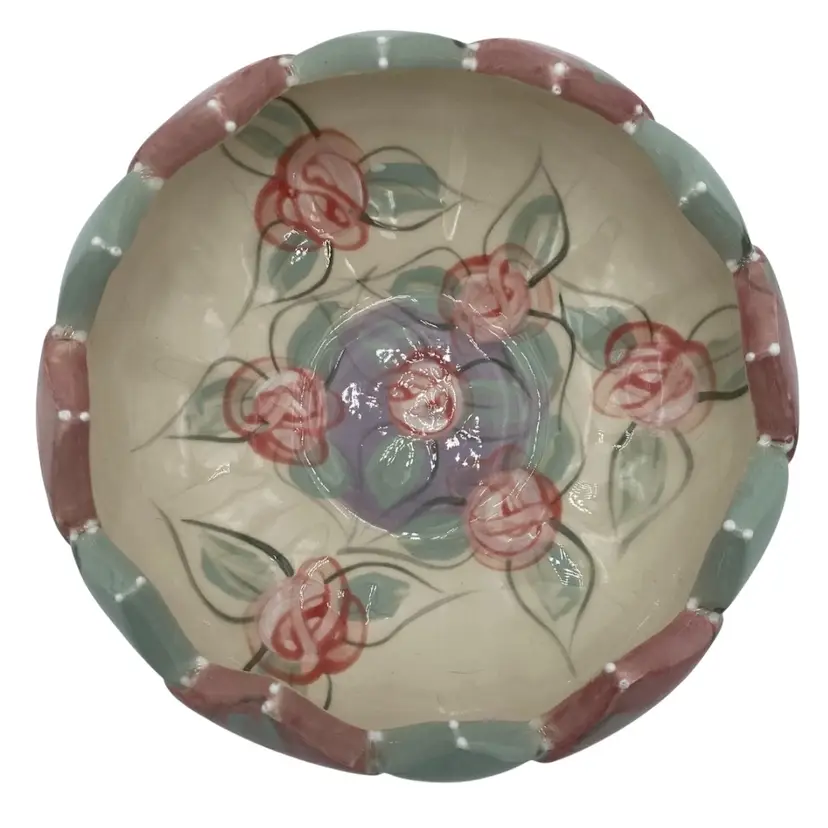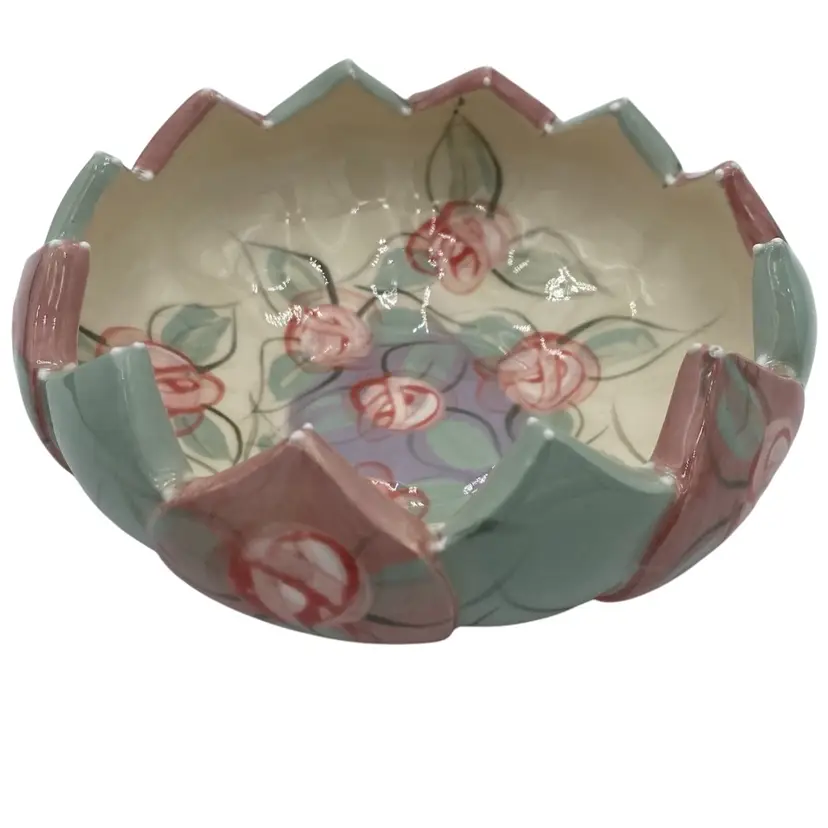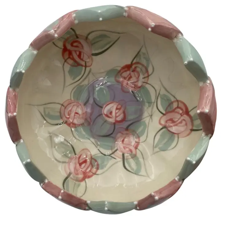 Add a touch of vintage charm to your table setting with this beautiful hand-painted ceramic bowl. The round shape and glossy finish give it a classic look, while the abstract rose theme against a cream background adds a lovely contemporary touch. The bowl is signed and dated by the artist and features a sawtooth rim and moriage white dots on each point, making it a one-of-a-kind piece. Perfect for all occasions, this mint green and rose-colored bowl is 5.5 inches in diameter and 2.4 inches in height. It weighs 10 ounces and is made in the United States. Whether you're using it as a candy dish, trinket dish, or as a decorative piece, this bowl is beautiful and unique!