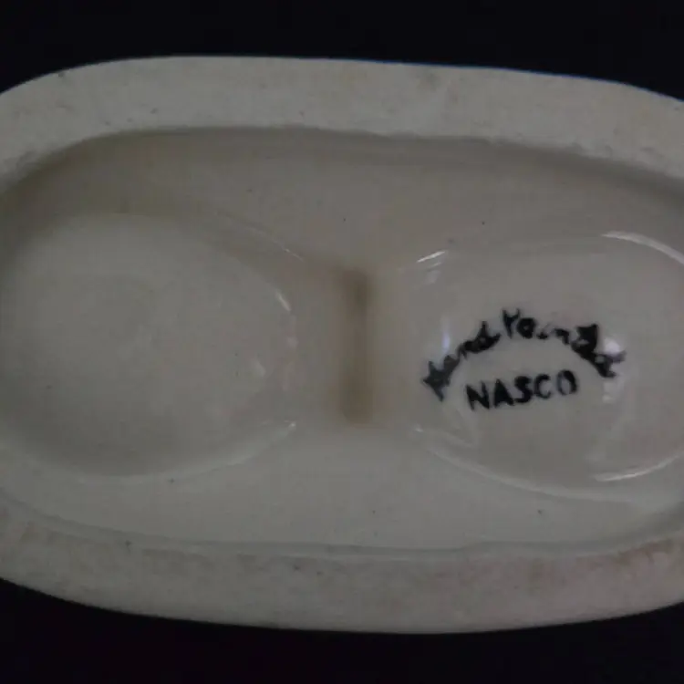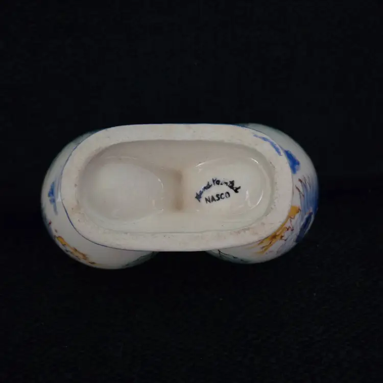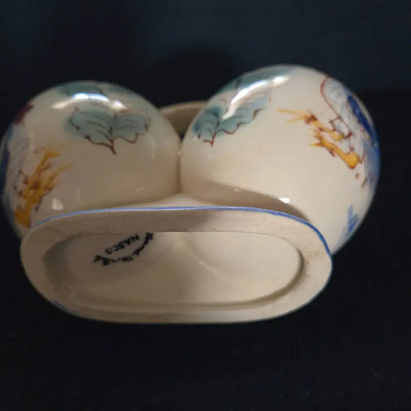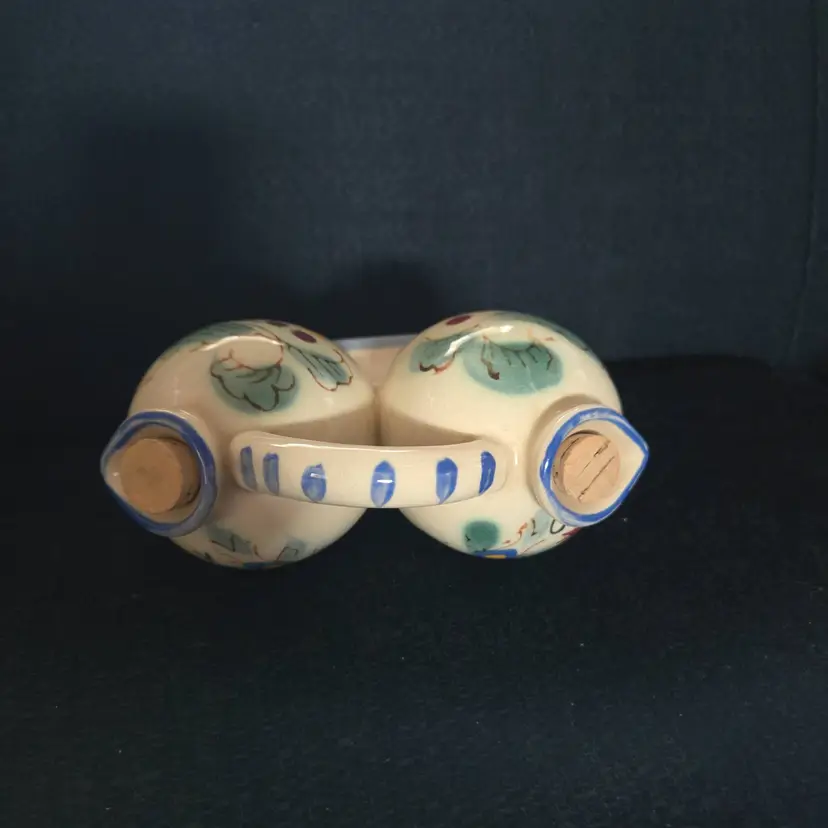 This little cutie has a rooster design in beautiful blues, greens, reds, and yellow colors. It has 2 spouts, 1 for oil and 1 for vinegar with a central handle. It has a cork for each spout. It is stamped Hand Painted Nasco on the bottom. Made in Japan. In great condition. No chips, cracks, or repairs. Has some crazing. It measures 4" tall and 6" wide.