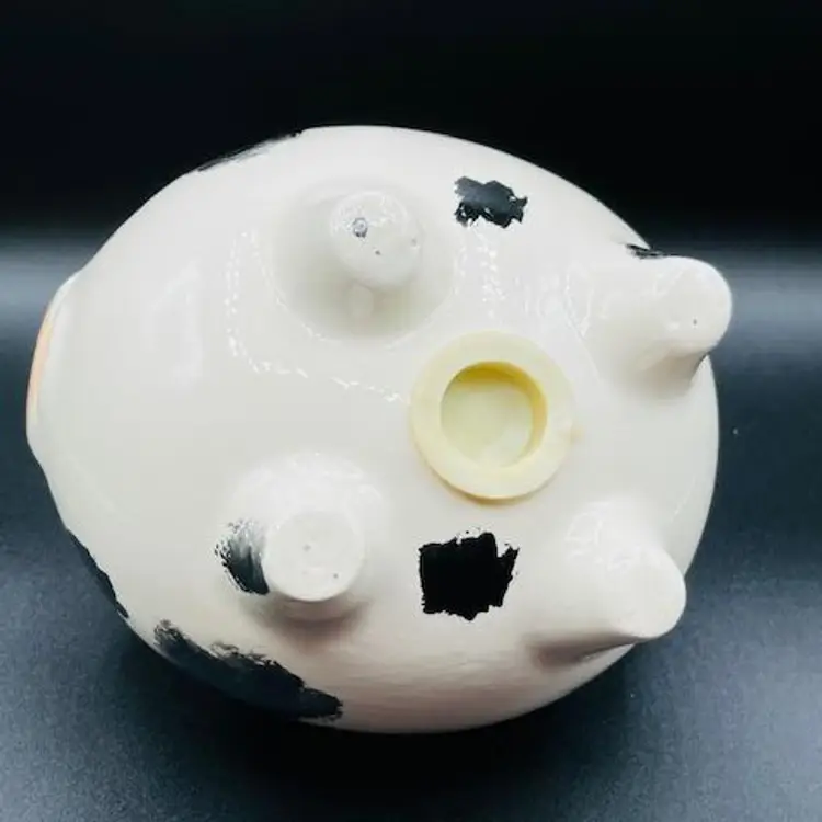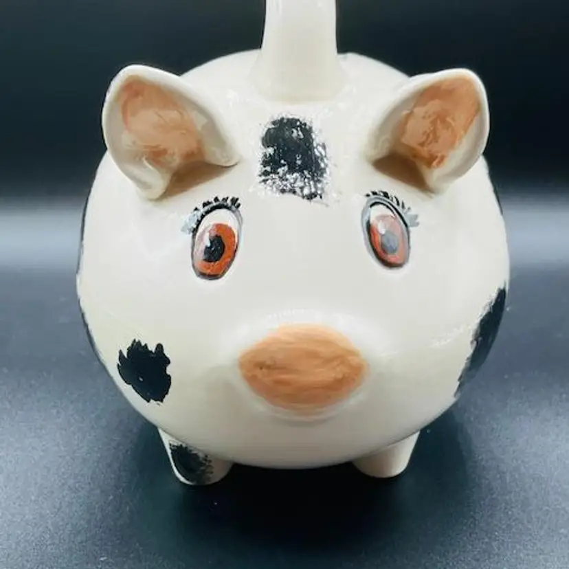 This vintage piggy bank is a unique addition to any collection. The hand-painted ceramic design features black spots and adorable big brown eyes with eyelashes. Perfect for animal lovers, this piggy bank is a great way to save money.