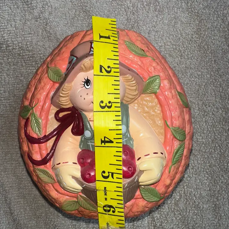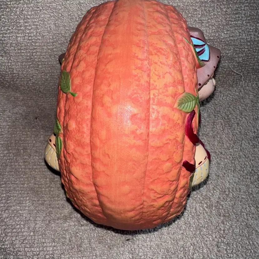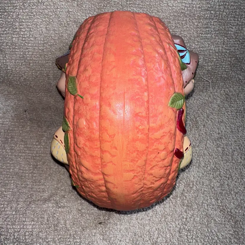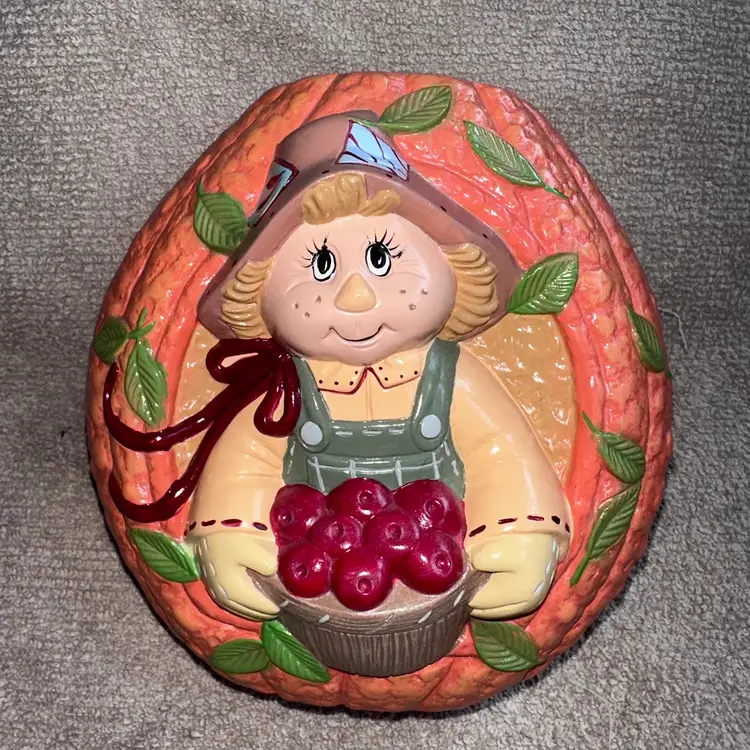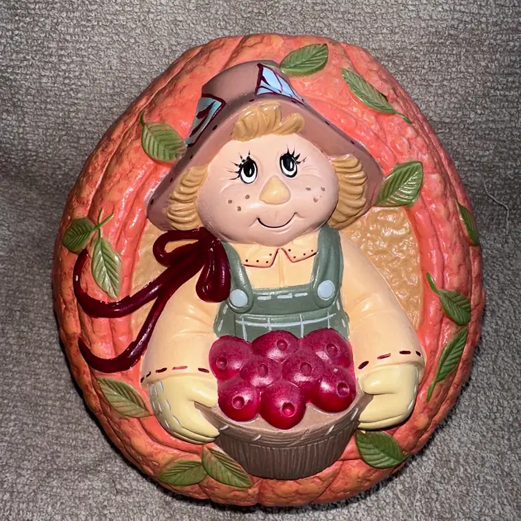 Vintage Hand Painted Ceramic Pumpkin Scarecrow Halloween Fall Tabletop Decor. Excellent Condition Free Of Chips, Cracks Or Repairs. Adorable Scarecrow Holding A Basket Of Apples set in Pumpkin. Could Be Used As A Vase For Dry Flowers. Smoke Free Home. #ceramic #handpainted #halloween #falldecor #autumn #scarecrow #pumpkin #fall