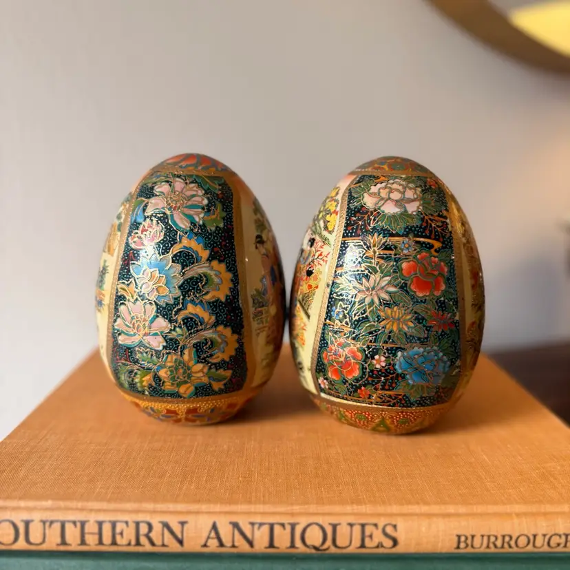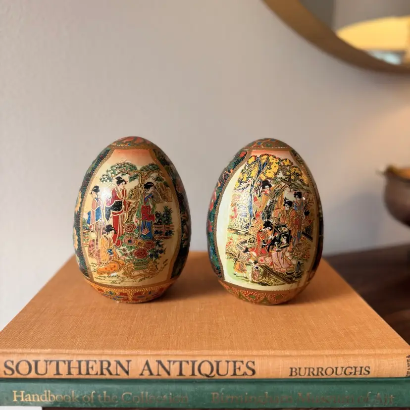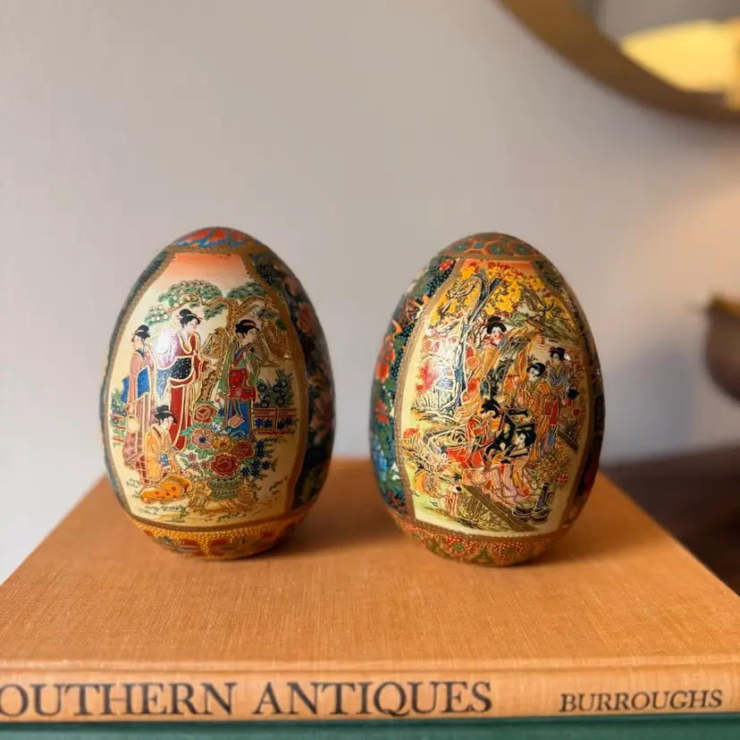This is a beautiful pair of vintage hand-painted porcelain eggs from China. Each egg features intricate, colorful enamel-style designs depicting traditional Chinese figures in garden and court scenes, surrounded by ornate floral borders and gilt detailing.
