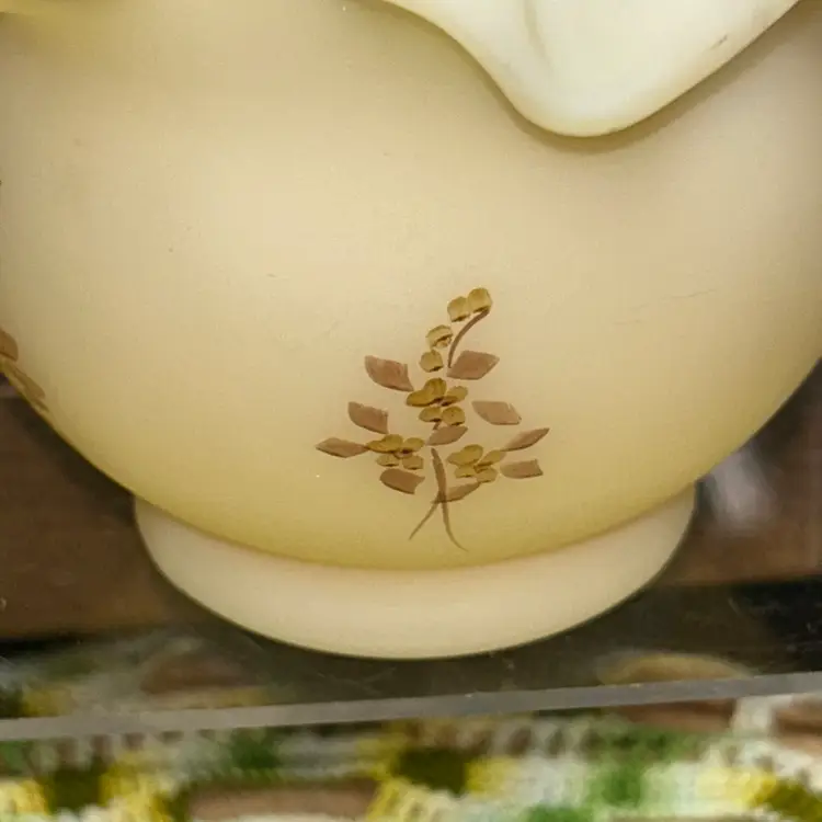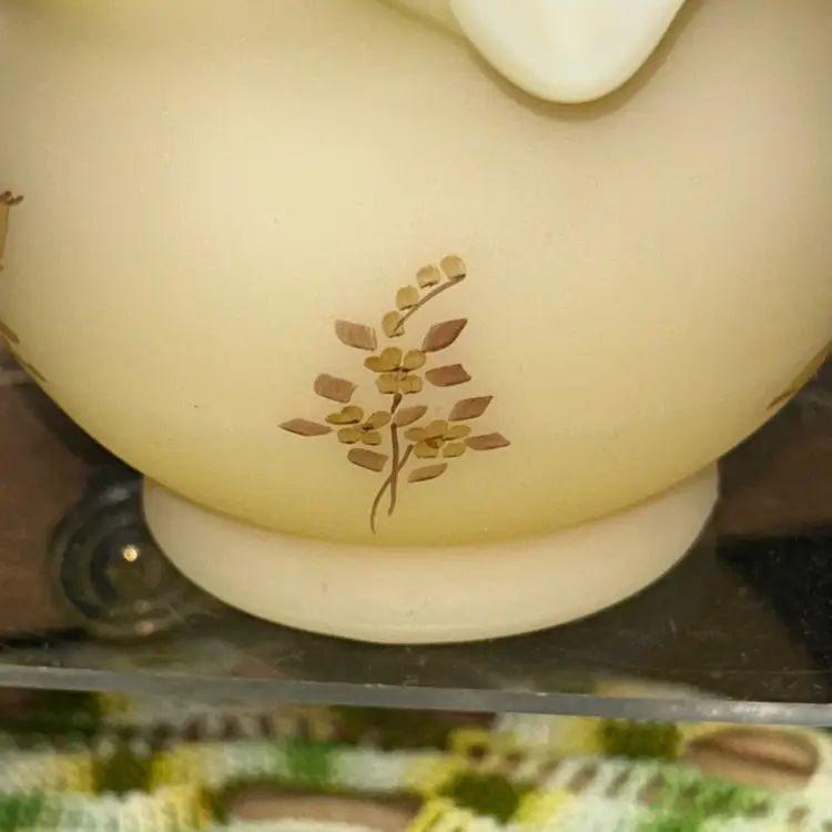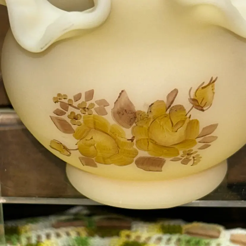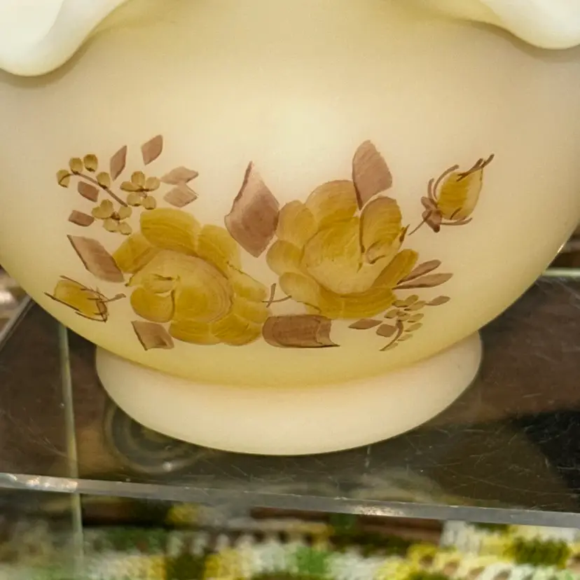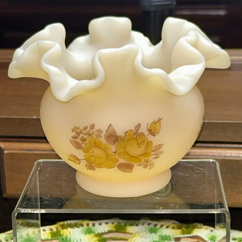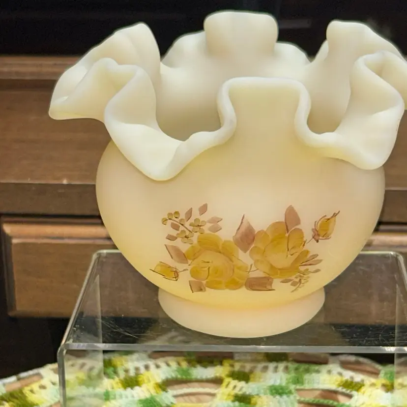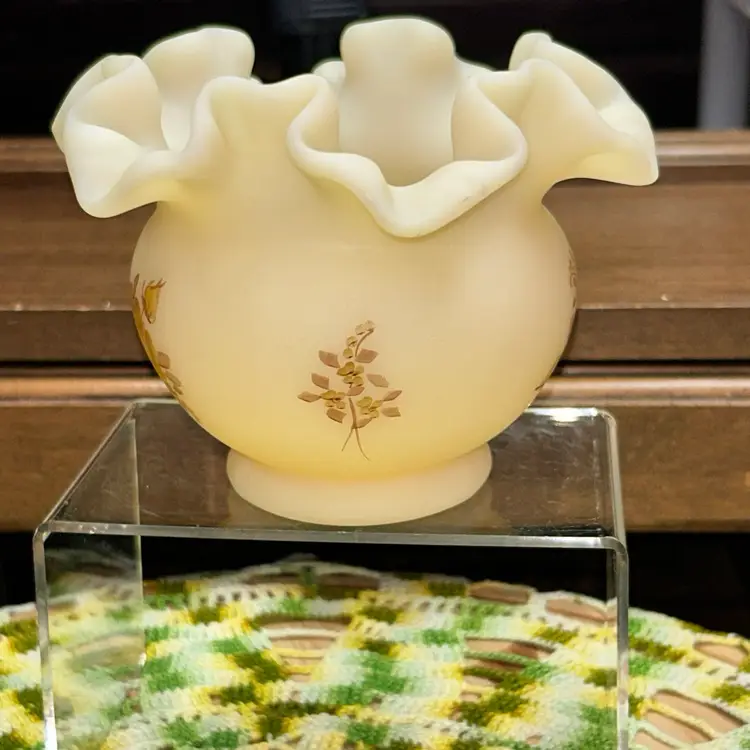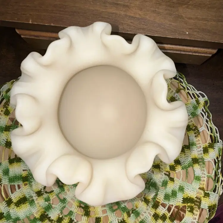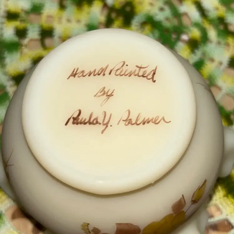 Excellent condition. No blemishes or marks. Dating to early 1979’s. Ruffled and crimped edge. Artist Paula Y. Palmer. 4” tall, 5” diameter opening.