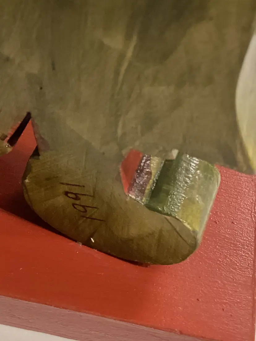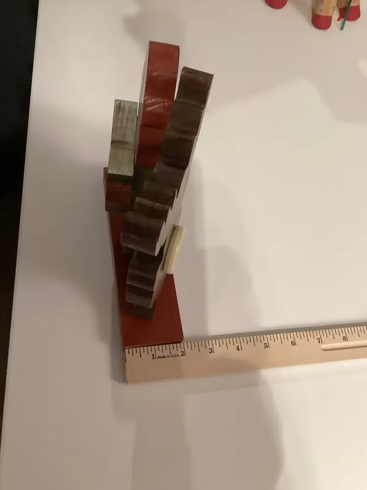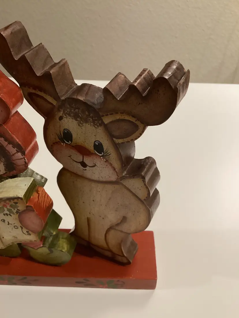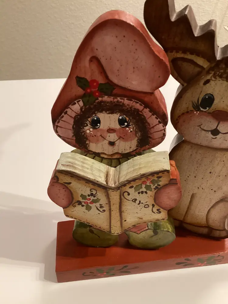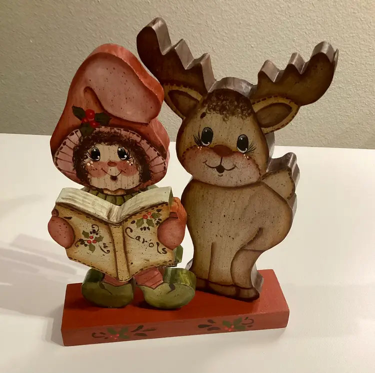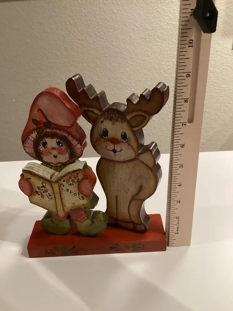 This vintage wooden hand-painted Christmas decoration in the shape of a reindeer and folk art caroler is a charming collectible from 1991. The asymmetrical figure features a traditional Christmas theme and is adorned with multicolor paint, making it a unique addition to any holiday decor collection. Handmade in the United States, this original reideer collection piece showcases intricate details and a festive design that captures the spirit of Christmas in a creative and nostalgic way. Perfect for adults looking to add a touch of seasonal artistry to their home during the holiday season. Item appears to be in good used condition. Item does not include battery. It was taken out due to it running out and barely playing, as well as not shipping it. The battery picture is only to show which type it contained. Item sold as is, where is, without the sound working and no battery.