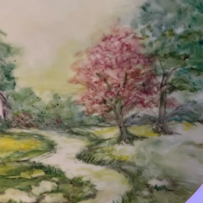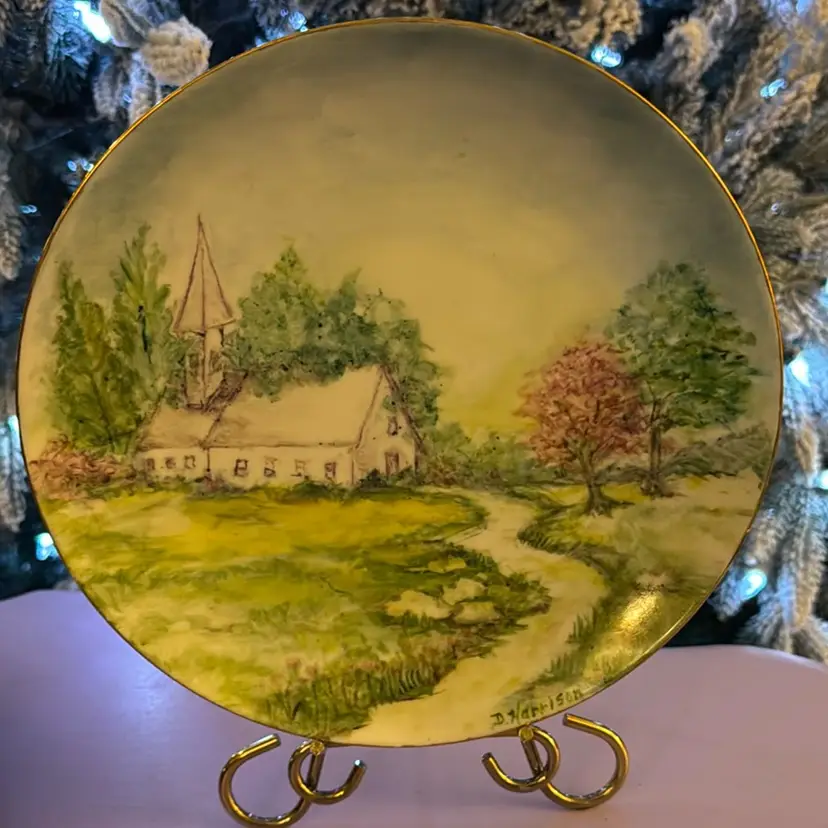 Really beautiful colors on this hand painted church scene plate. Amazing displayed on a stand or hung on your wall. Let me know and I will be glad to send along a plate hanger. Measures 9 inches across. No chips or cracks.