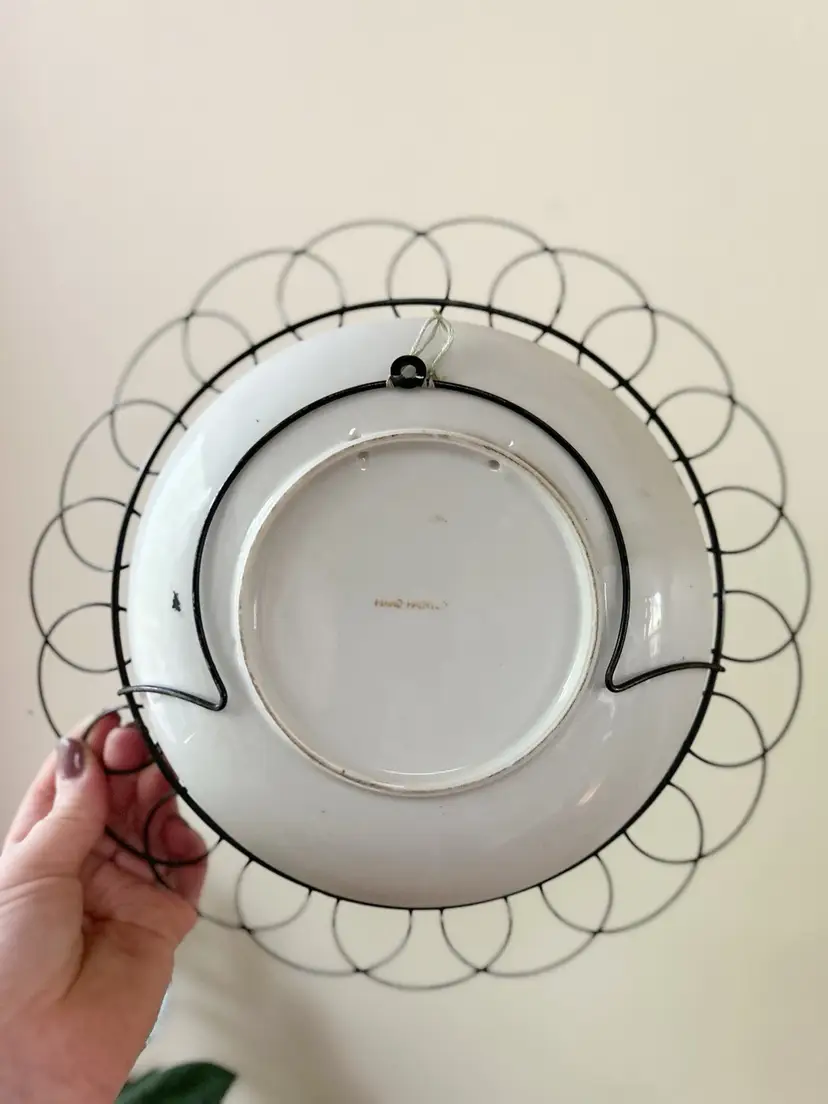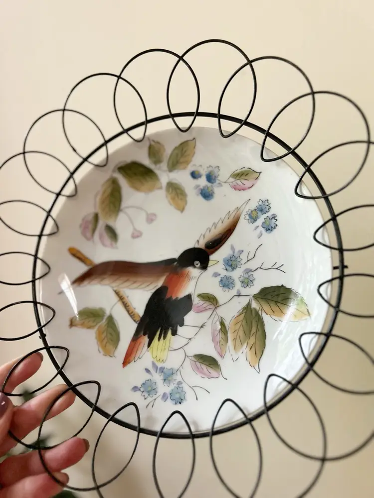 Vintage hand painted decorative wall bird plate in frame. Good condition. Measures 11.5 inches in diameter.