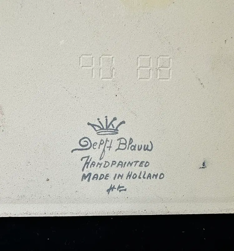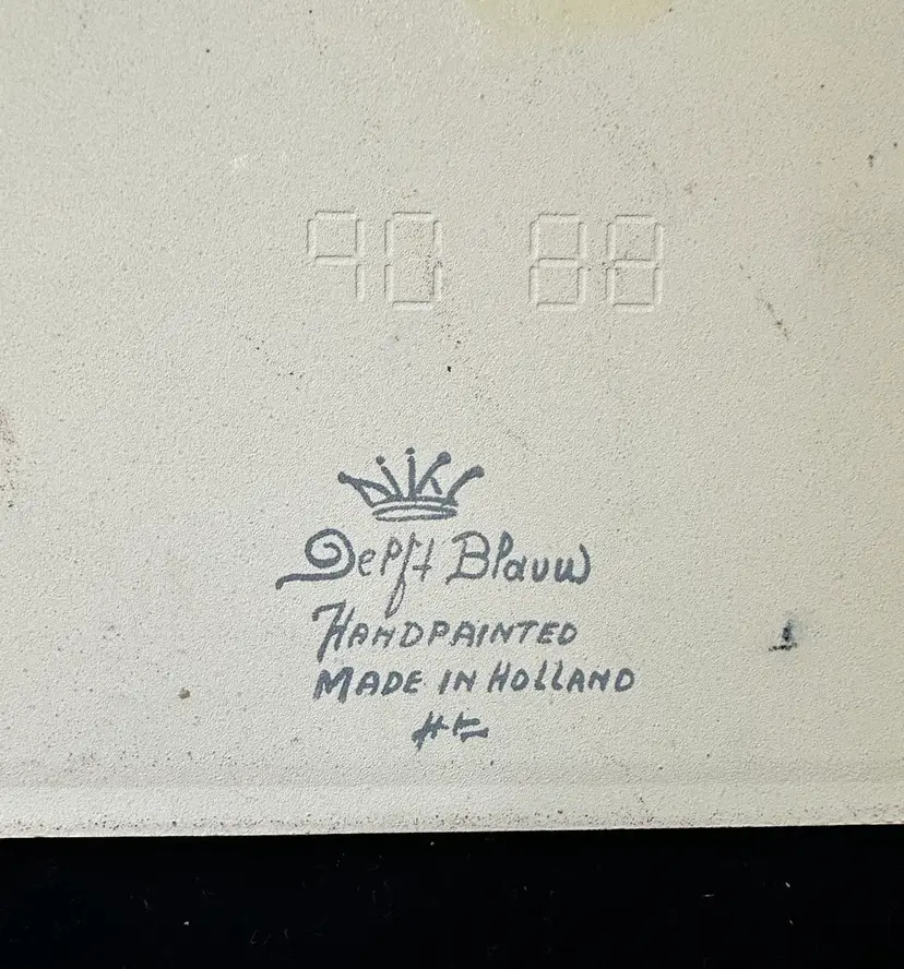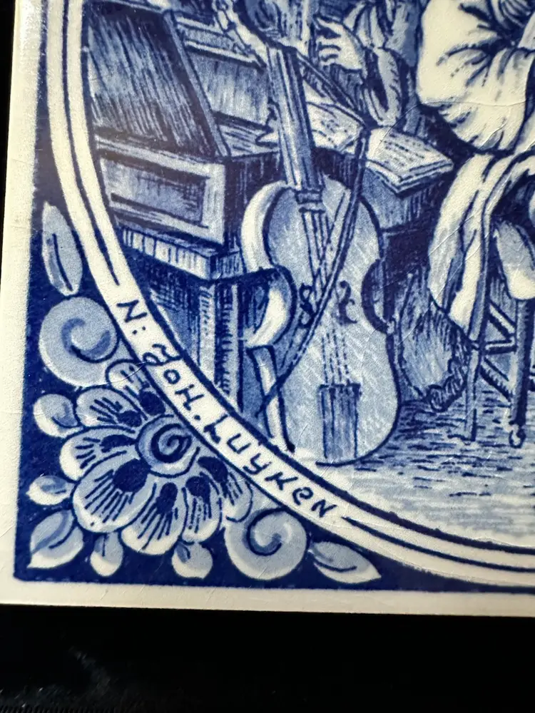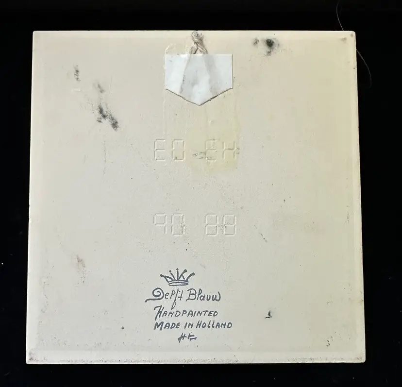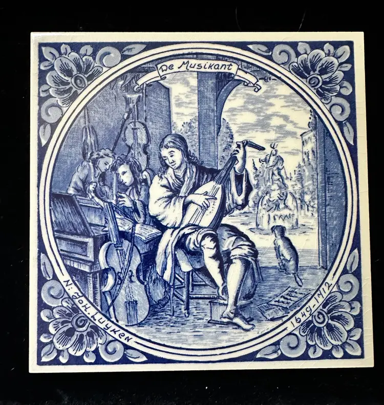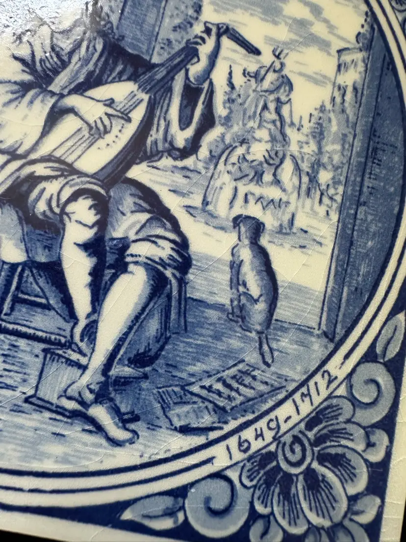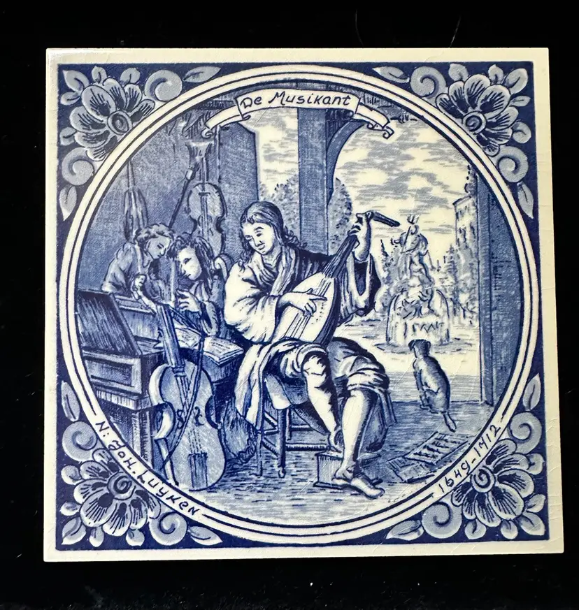 Reproduction of an early delft tile titled The Musician. It was made in Holland. Measures 6” x 6”. Very good condition.