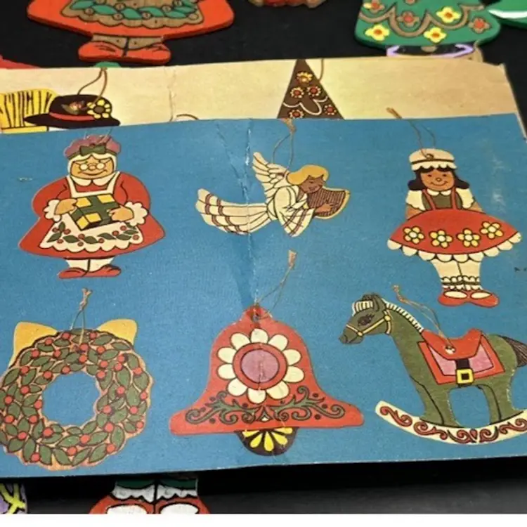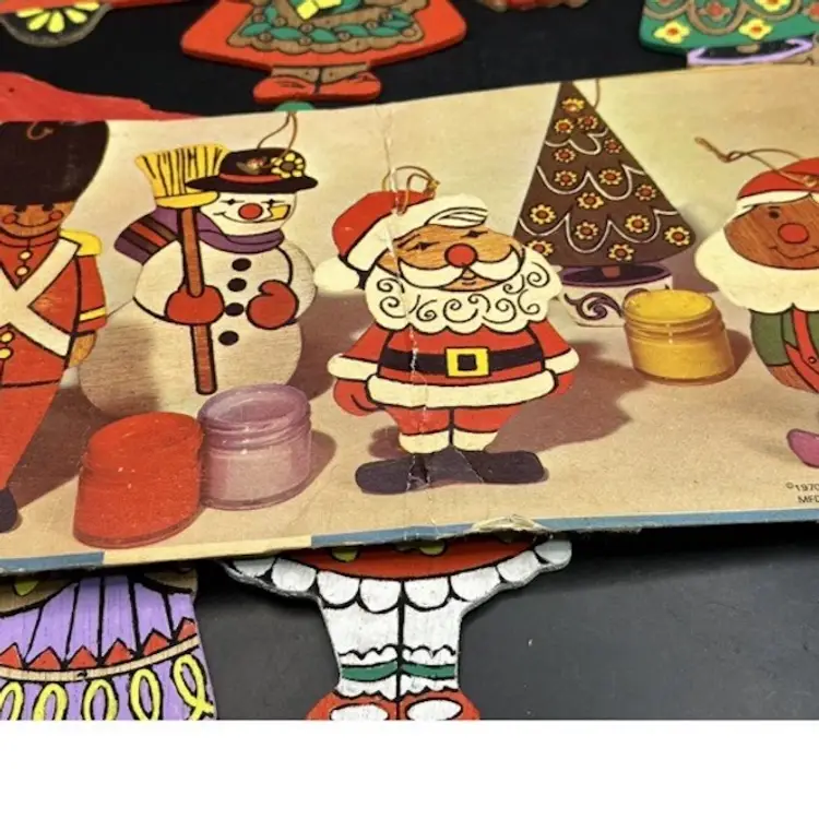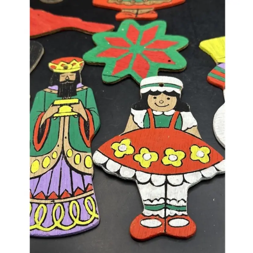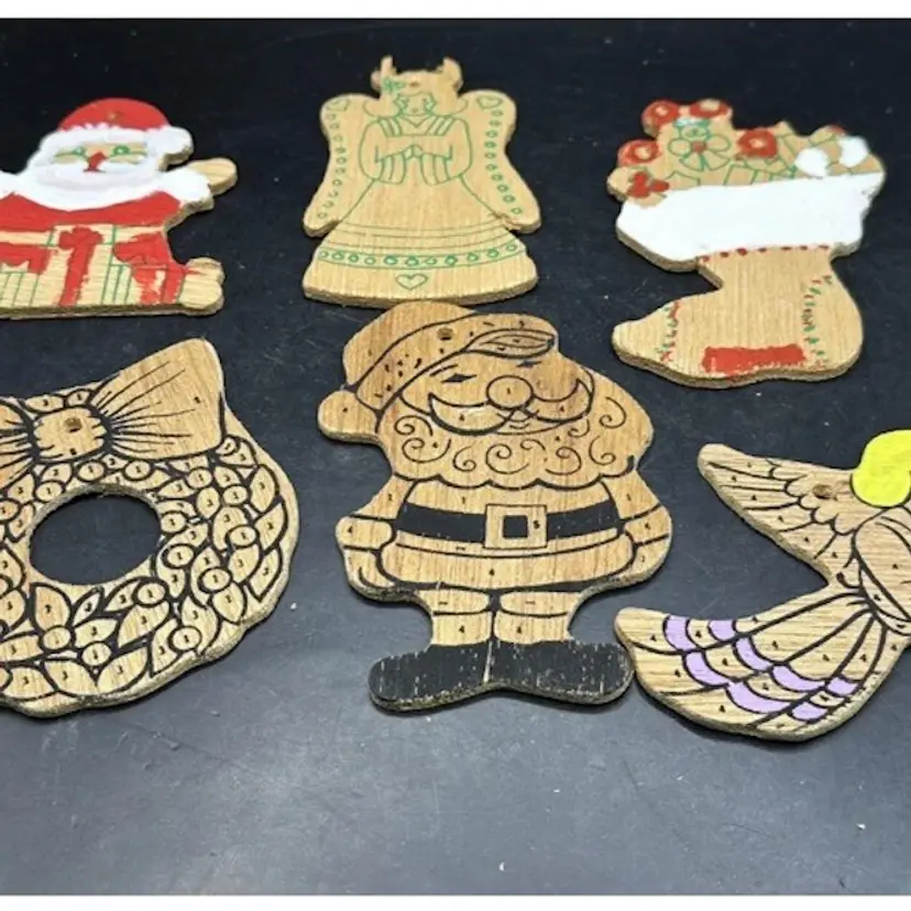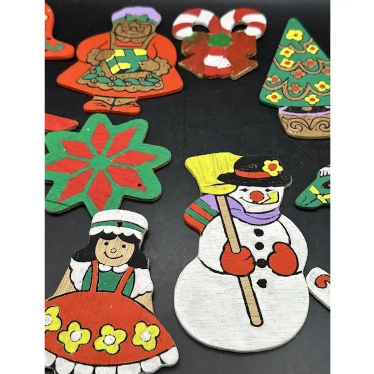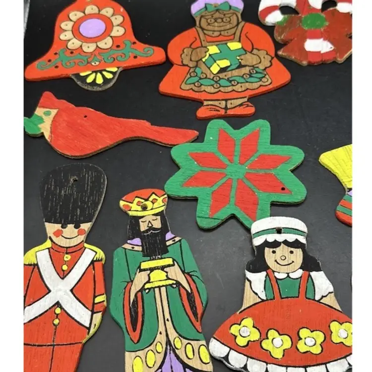 Add some vintage charm to your Christmas tree with this lot of 15 hand-painted wooden ornaments. Each ornament features a classic holiday character, including Santa Claus and angels, and is sure to bring back nostalgic memories. These ornaments are perfect for collectors and those who appreciate unique holiday decor.