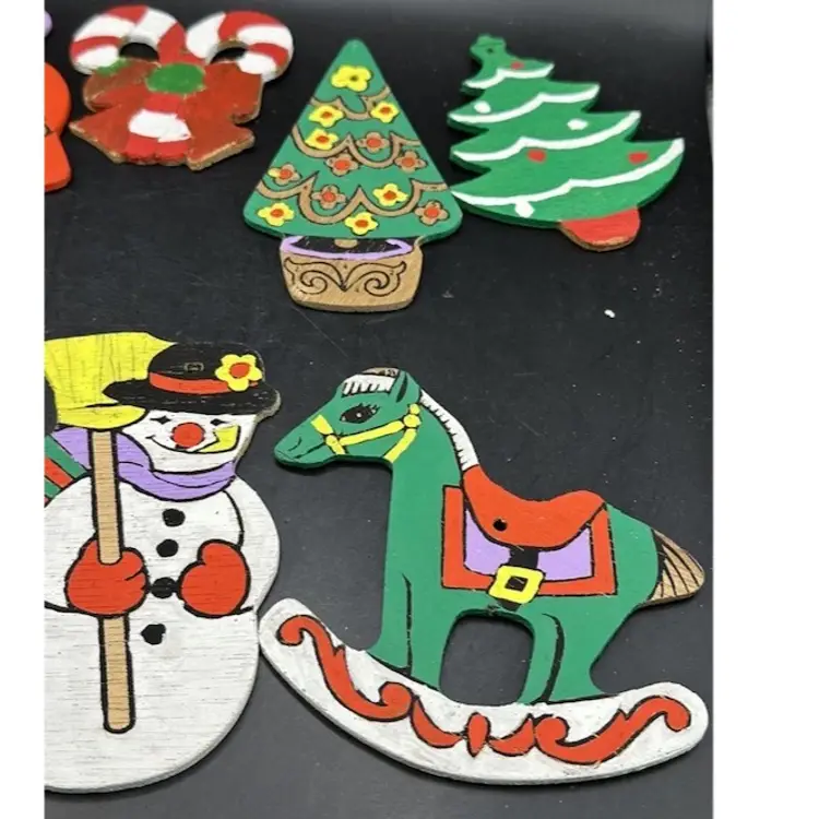 Celebrate the true spirit of Christmas with these vintage decorations that are both beautiful and timeless. The flat design of the ornaments makes them easy to store and display, and their durable wooden construction ensures that they will last for years to come. Add these to your collection or share them with loved ones to spread holiday joy.