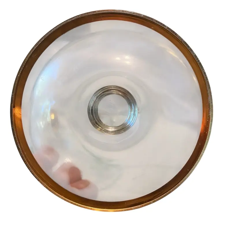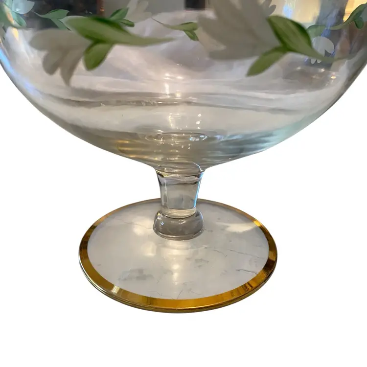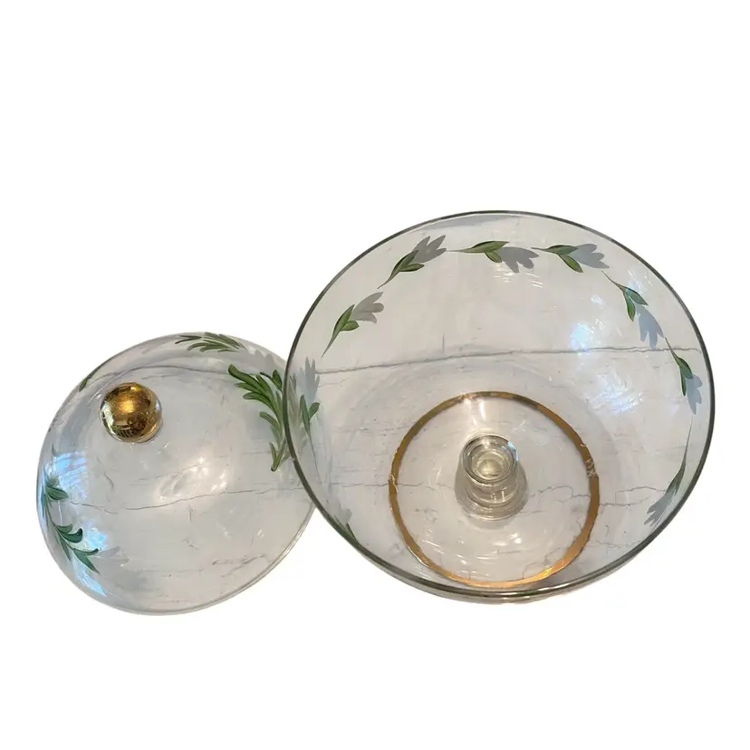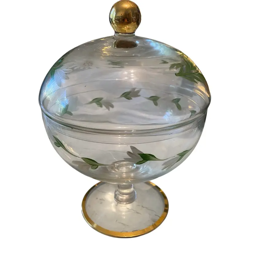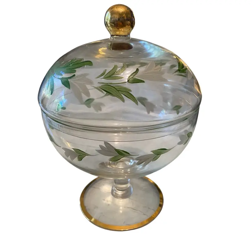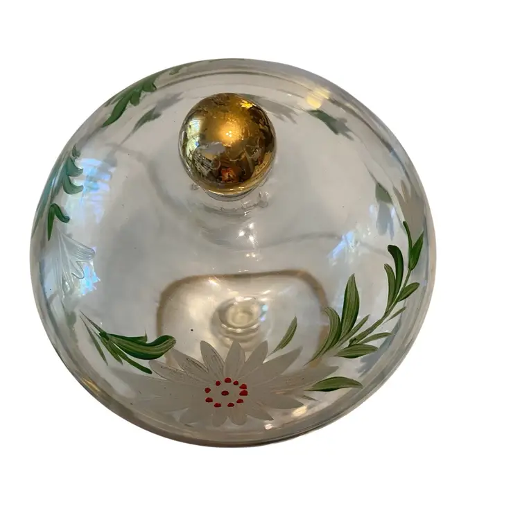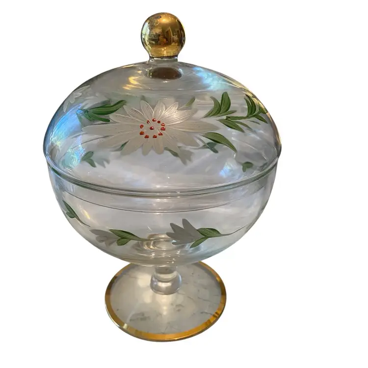 Vintage Hand painted Floral / Flowers on Glass Jar w/ Dome Lid - Round Candy Pedestal Dish w/ Gold Trim. Daisies 7.5in tall