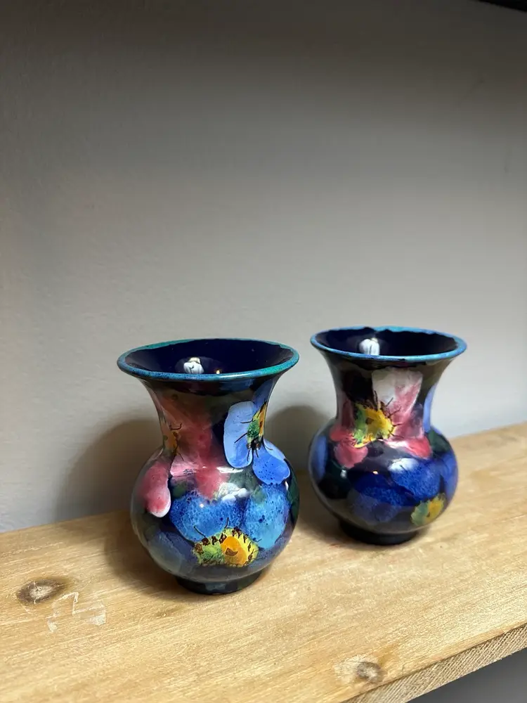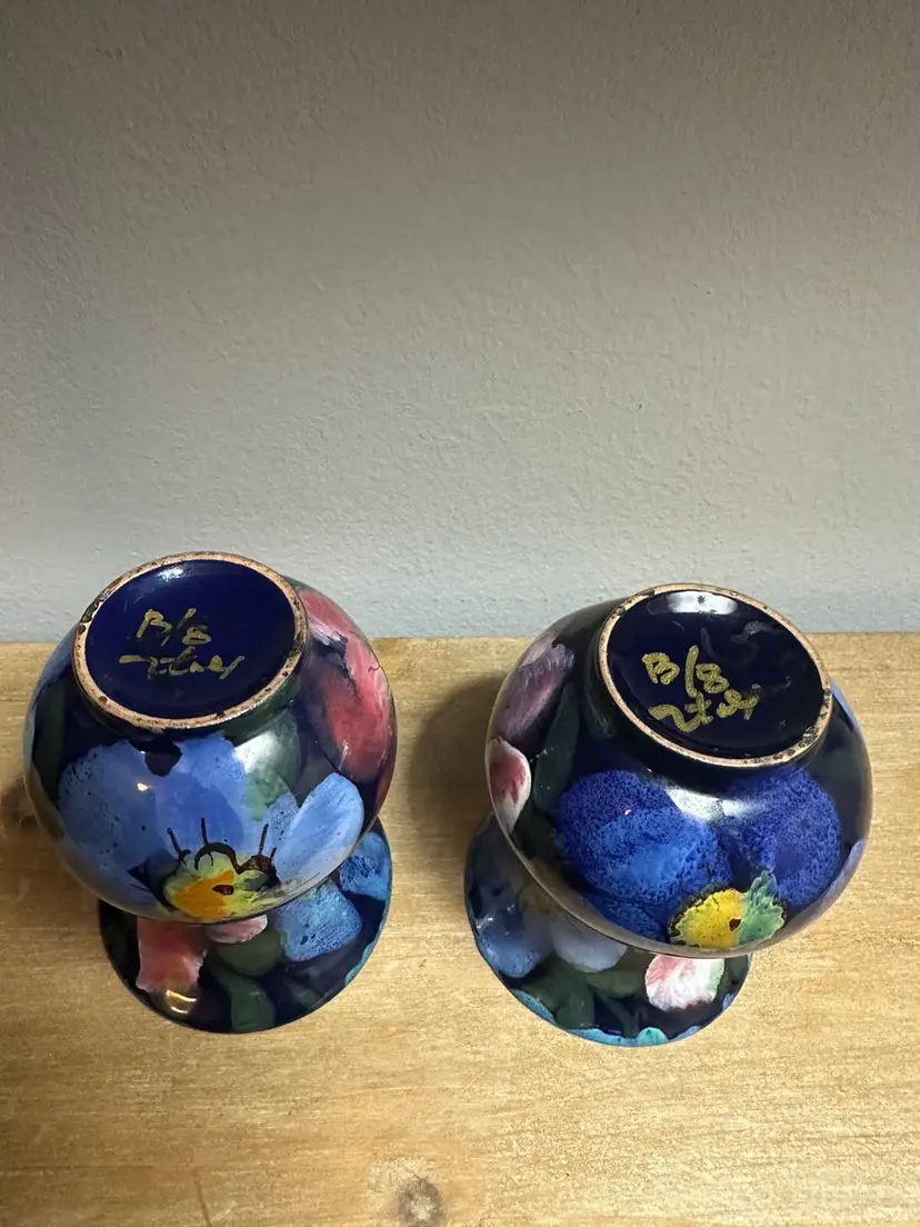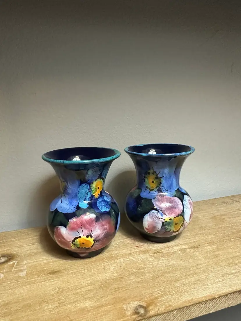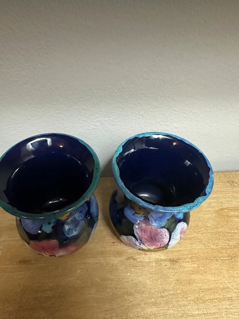 Vintage Hand Painted Italian Vases Each vase has a beautiful floral pattern and is glazed cobalt blue on the inside. Minor paint chip on rim of one vase which is unnoticeable (see pictures) Marked 13/8? Italy on bottom Each vase is 1 7/8" in diameter at base, 2 3/8" in diameter at rim , and is 3 3/4" high.