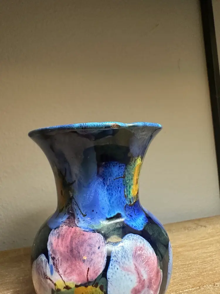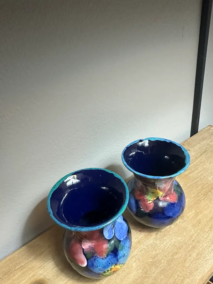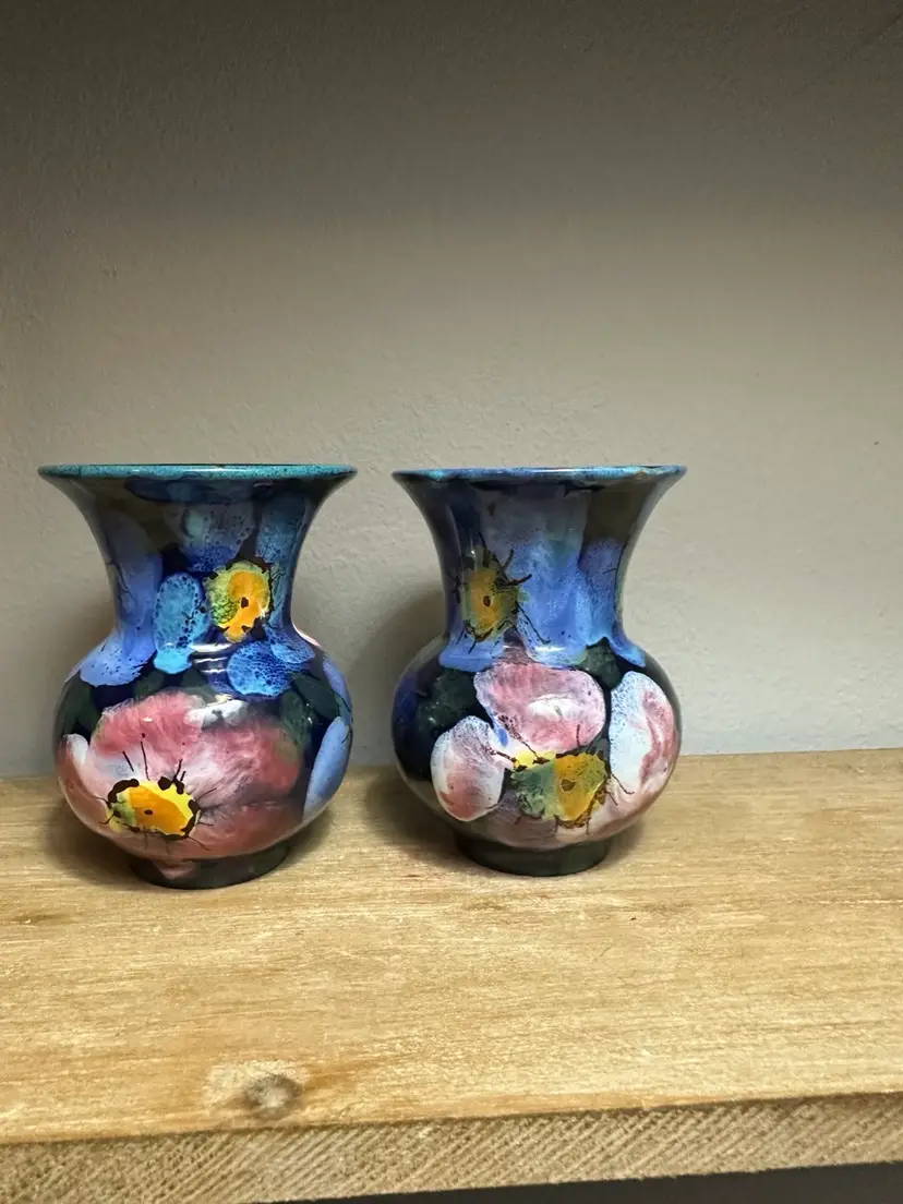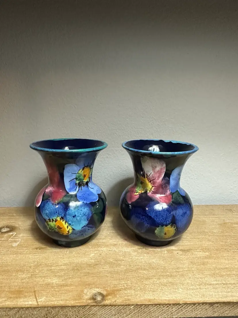 Vintage Hand Painted Italian Vases Each vase has a beautiful floral pattern and is glazed cobalt blue on the inside. Minor paint chip on rim of one vase which is unnoticeable (see pictures) Marked 13/8? Italy on bottom Each vase is 1 7/8" in diameter at base, 2 3/8" in diameter at rim , and is 3 3/4" high.