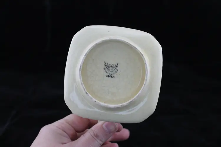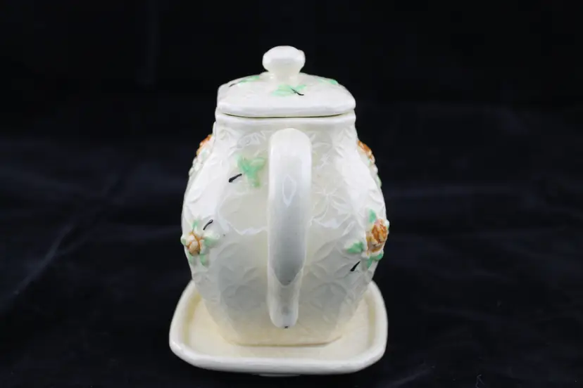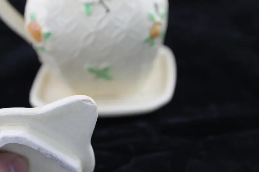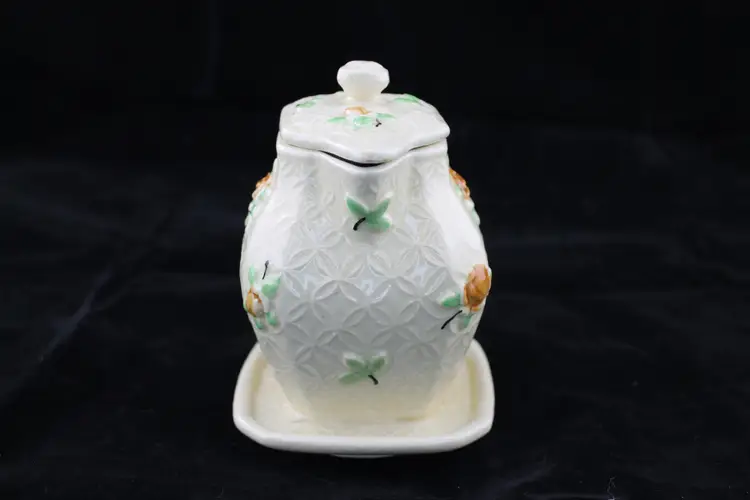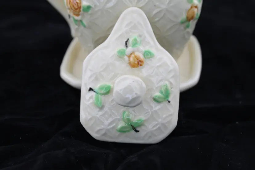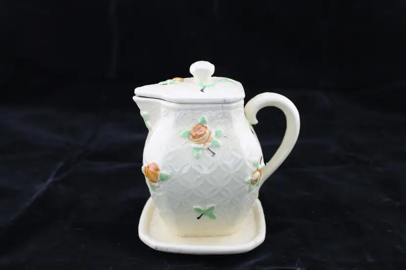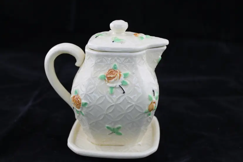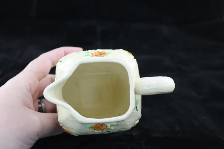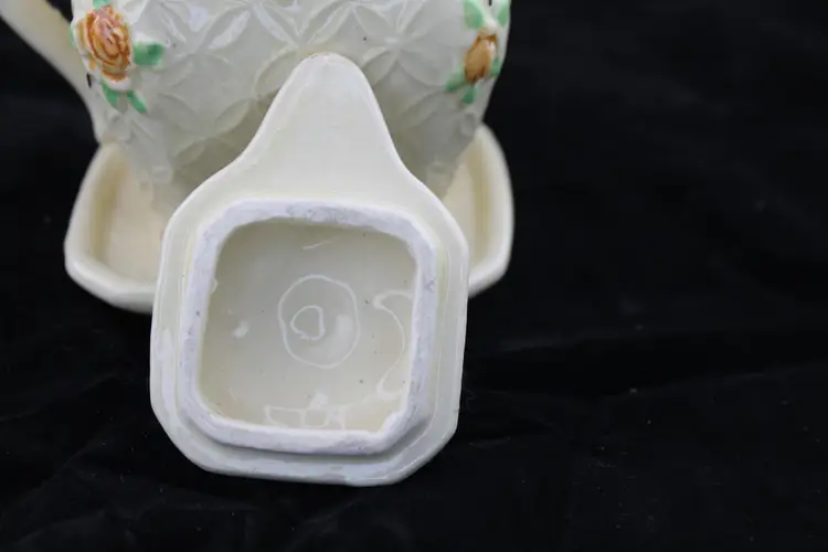 VINTAGE HAND PAINTED ROSE AND BASKET WEAVE CREAMER WITH LID. THE UNDER PLATE IS ATTACHED TO THE CREAMER. THIS IS DECENT CONDITION. NO MAJOR CHIPS OR CRACKS. IT IS HEAVILY CRAZED. THE LID HAS A SMALL CHIPS AT THE TIP. IT IS MARKED ON THE BOTTOM BUT I HAVE NOT BEEN ABLE TO ID IT. IT MEASURES APPROX 5" TALL INCLUDING THE LID. 4 1/2" ACROSS THE TOP INCLUDING THE SPOUT AND HANDLLE, 2 1/4" ACROSS THE TOP WITHOUT. THE BOTTOM IS 3 1/2" SQUARE.