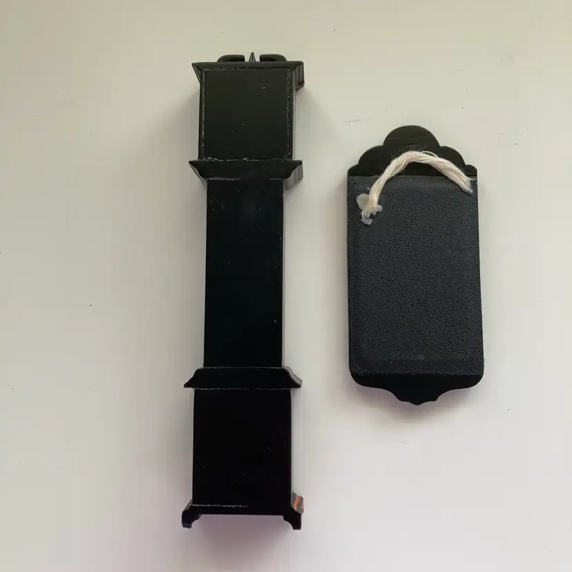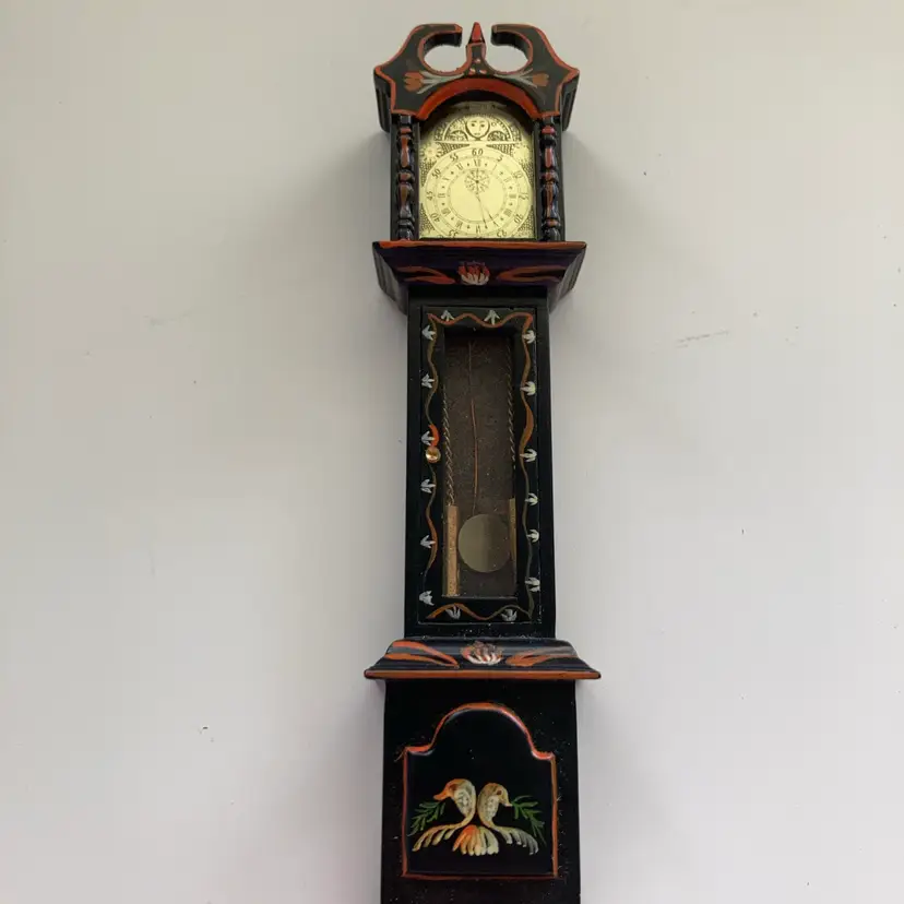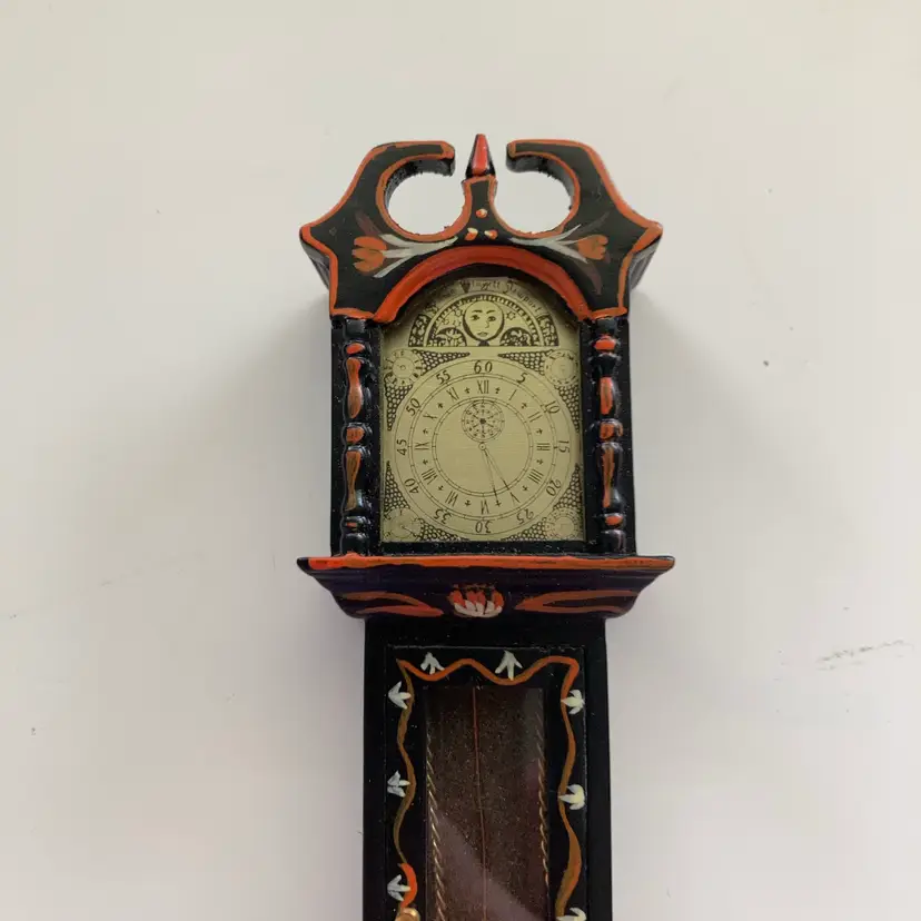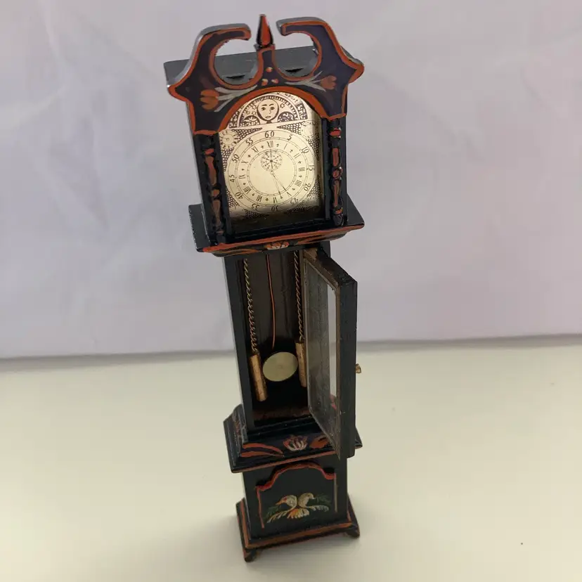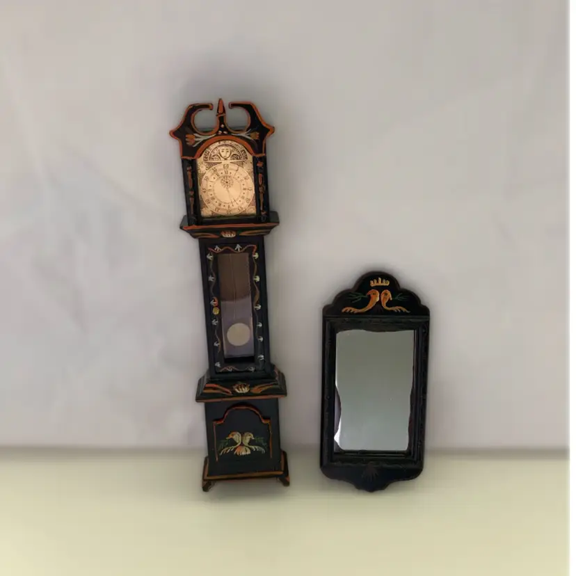Vintage hand painted wooden grandfather clock with matching wall mirror. Tge door of tge clock opens to the pendulum and weights. It measures 1 5/8” x 1” x 6 5/8” tall. The matching wall mirror measures 1 7/8” x 4”. In goodcondition.