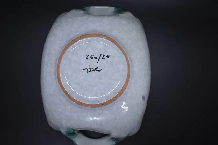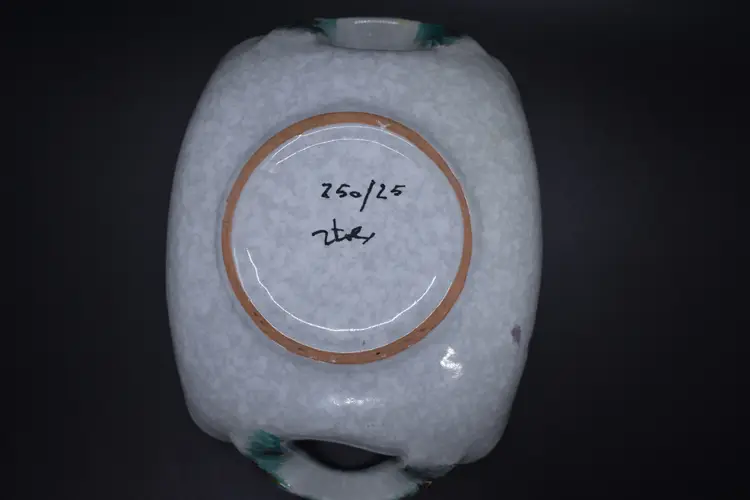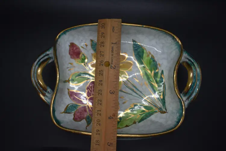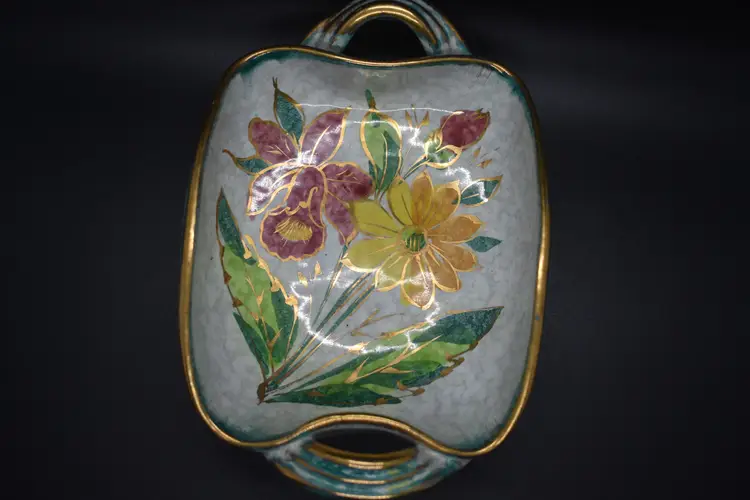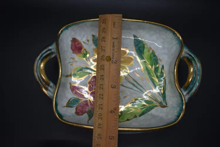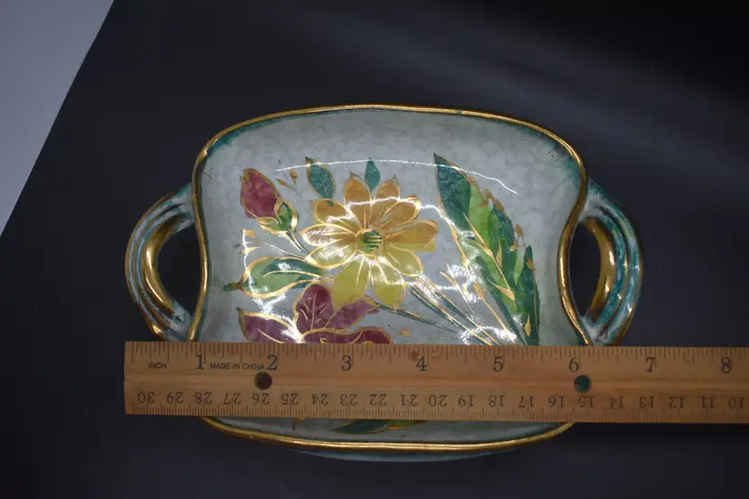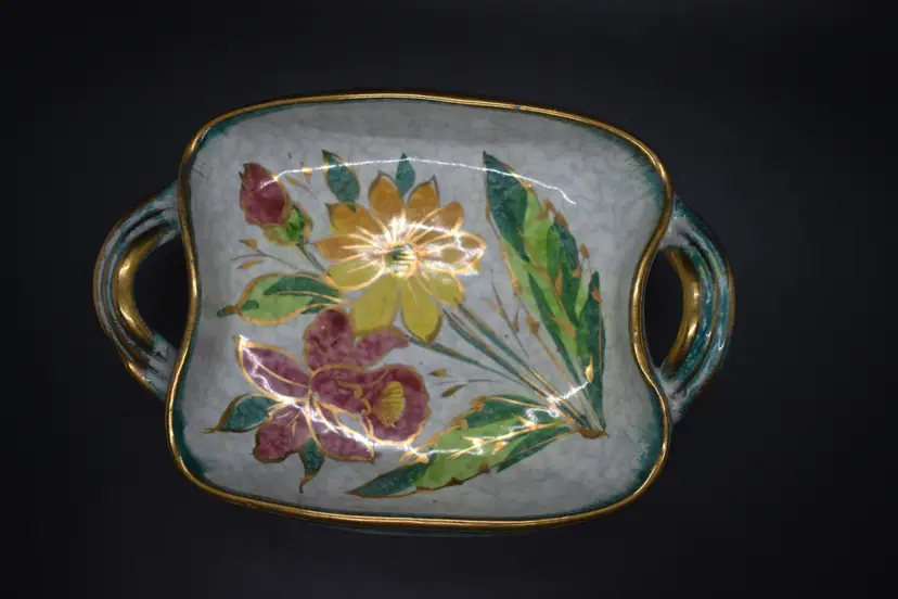 This vintage candy dish showcases a vibrant pattern of multicolored irises, complemented by a gold rim. Made from ceramic, the dish has a square shape and features a single compartment. It is an original piece from Italy, produced in the 1960s using art pottery techniques. With its glossy finish, this unique and unmarked item adds a touch of vintage charm to any room or occasion.