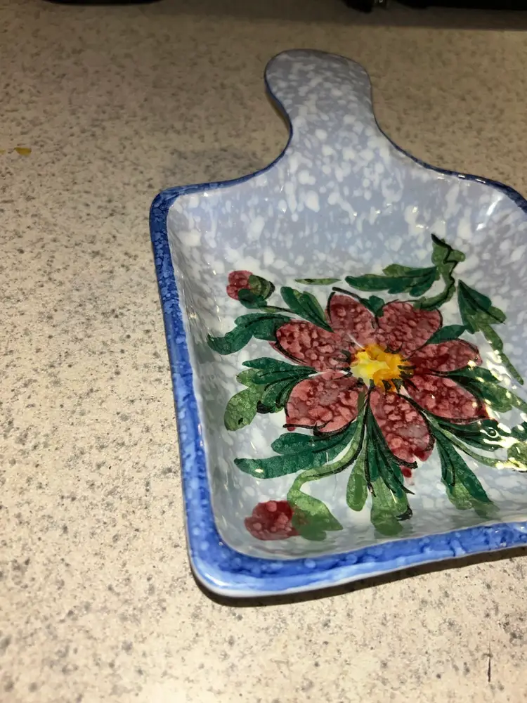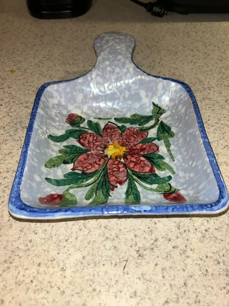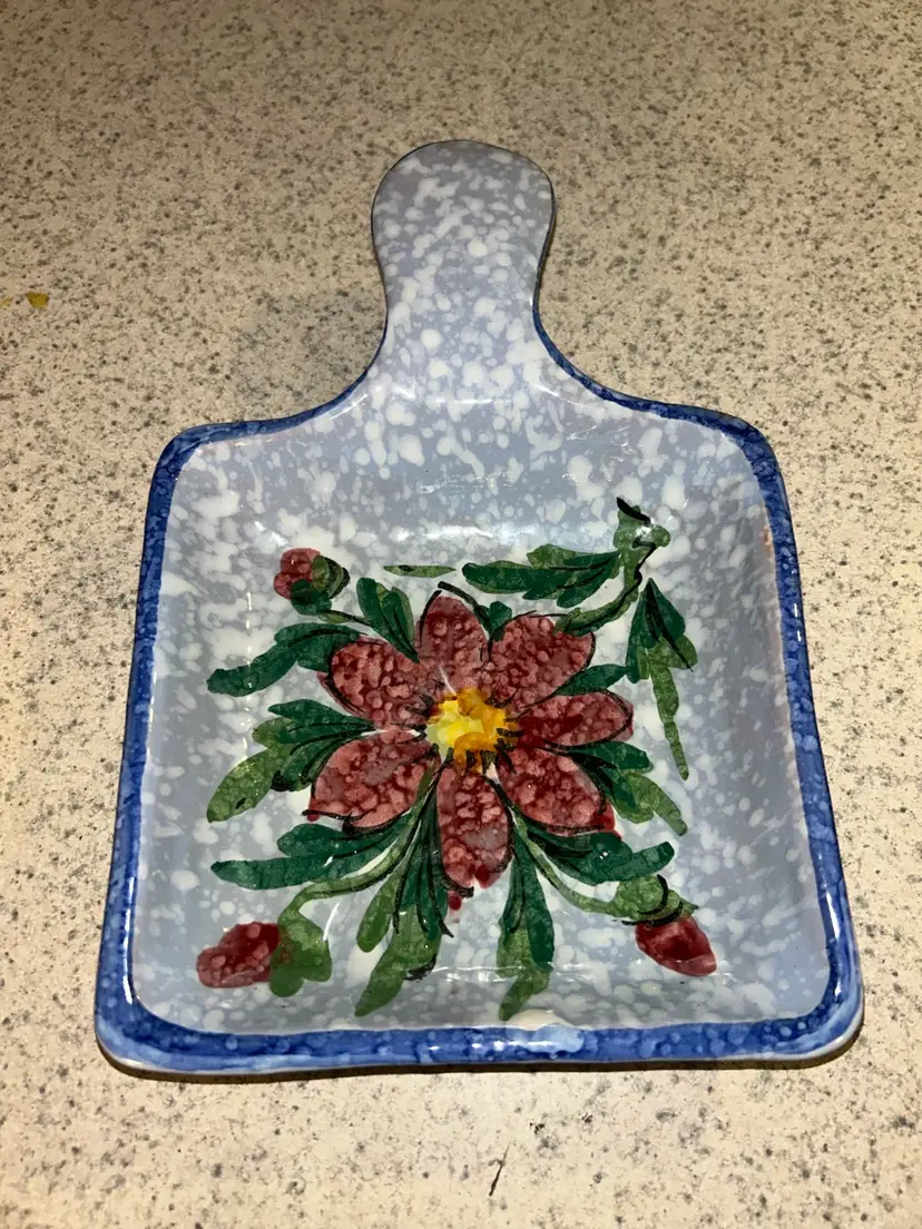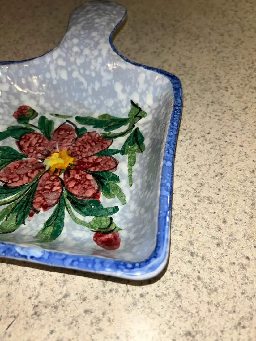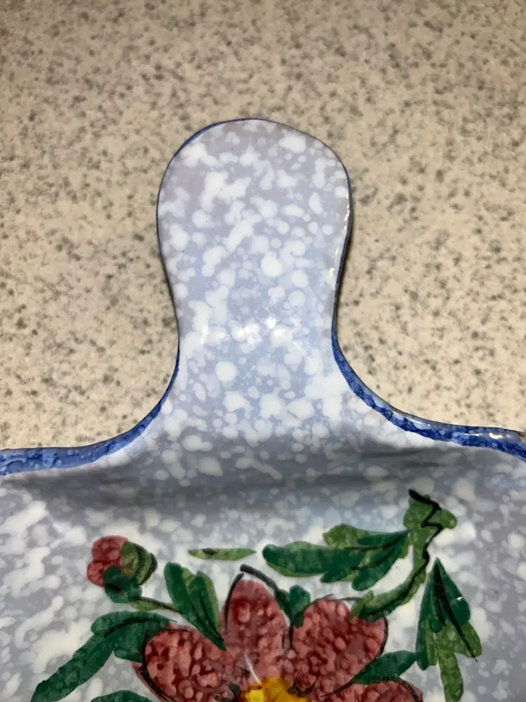 This is a vintage Italian hand-painted ceramic kitchen accessory, likely used as a sponge holder or spoon rest. It features a speckled blue and white background with a large, central red flower and green leaves, bordered by a blue rim. The item has a rustic, folk-art style and appears to be a piece of decorative yet functional kitchenware. Please see photos for condition details and any measurements. Please feel free to ask any question. All items sold in AS IS condition. Thank you 🦋 Monday-Friday shipping. Shipping: USPS, UPS, FedEx