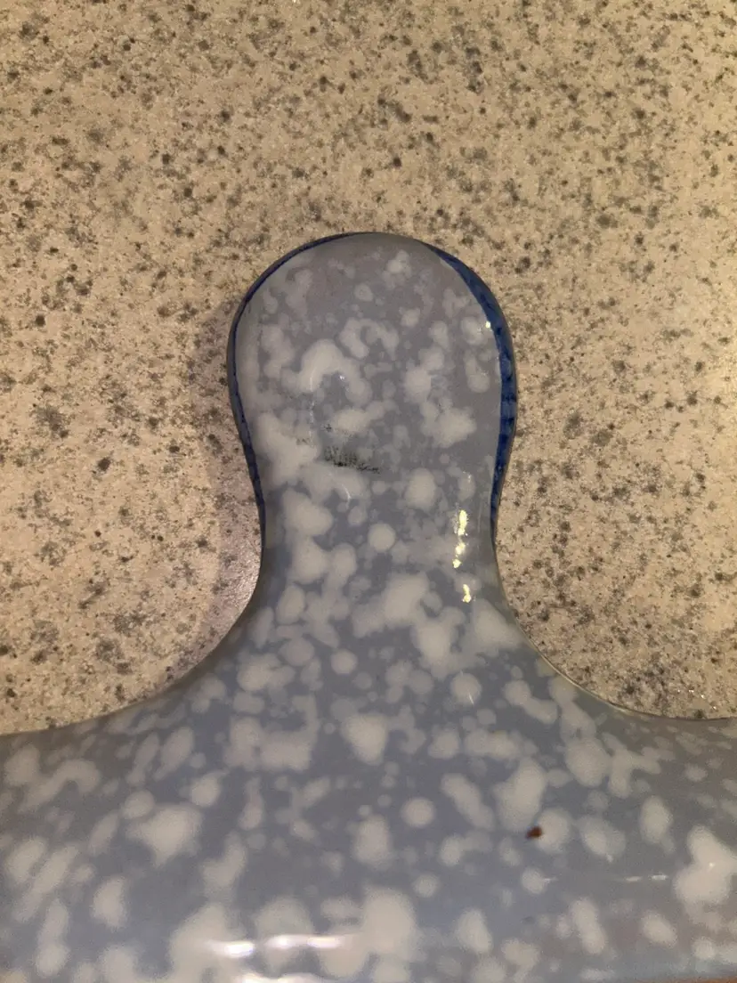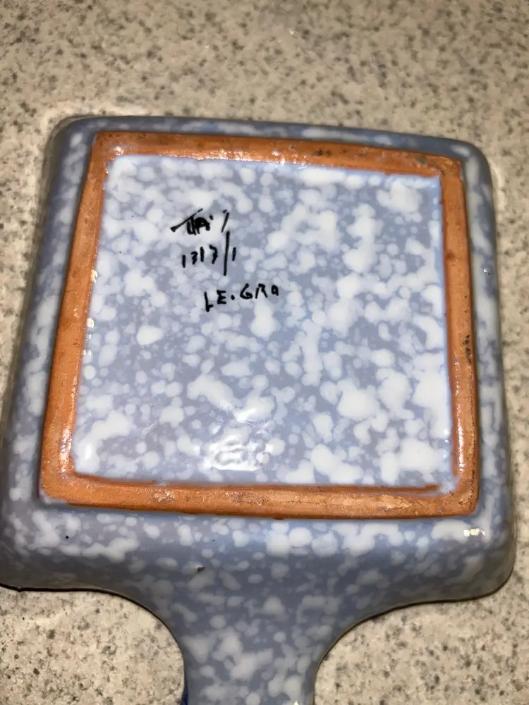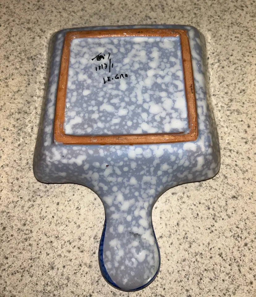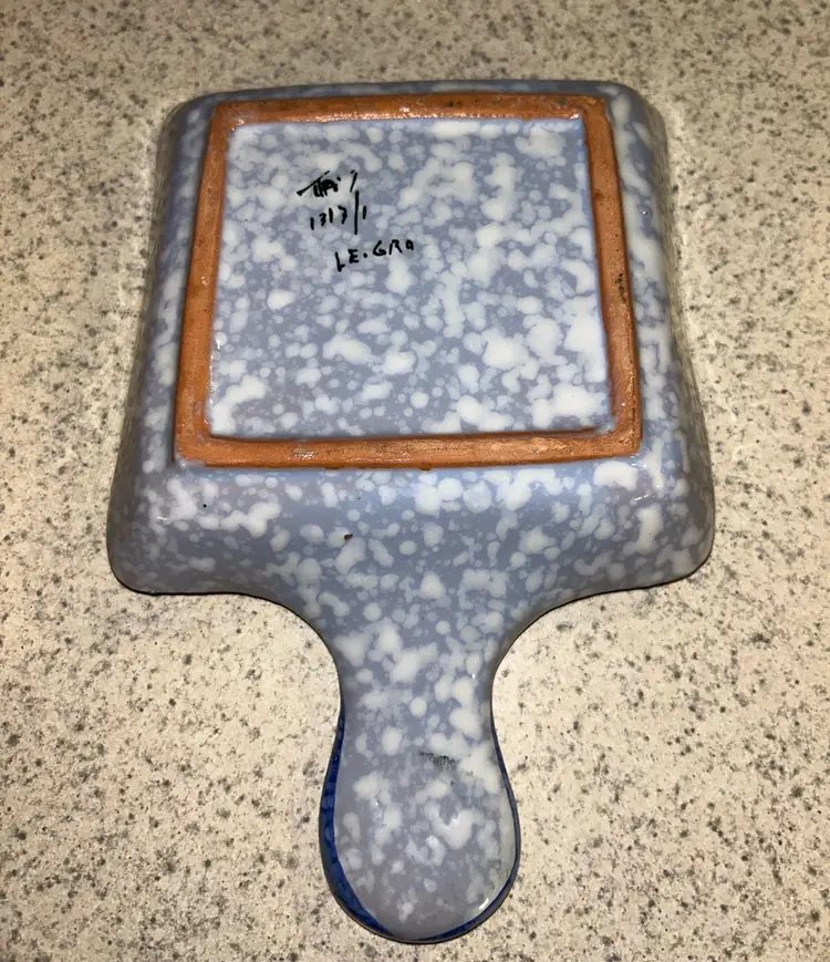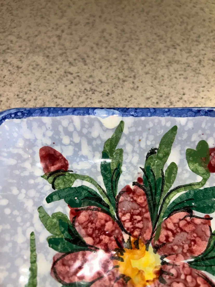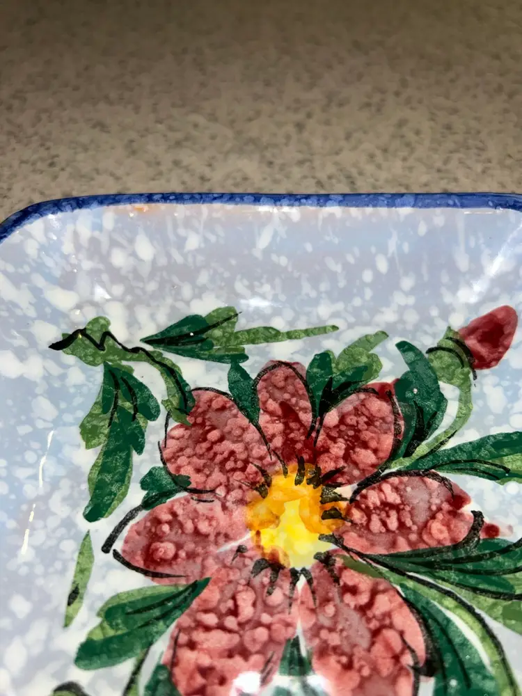 This is a vintage Italian hand-painted ceramic kitchen accessory, likely used as a sponge holder or spoon rest. It features a speckled blue and white background with a large, central red flower and green leaves, bordered by a blue rim. The item has a rustic, folk-art style and appears to be a piece of decorative yet functional kitchenware. Please see photos for condition details and any measurements. Please feel free to ask any question. All items sold in AS IS condition. Thank you 🦋 Monday-Friday shipping. Shipping: USPS, UPS, FedEx