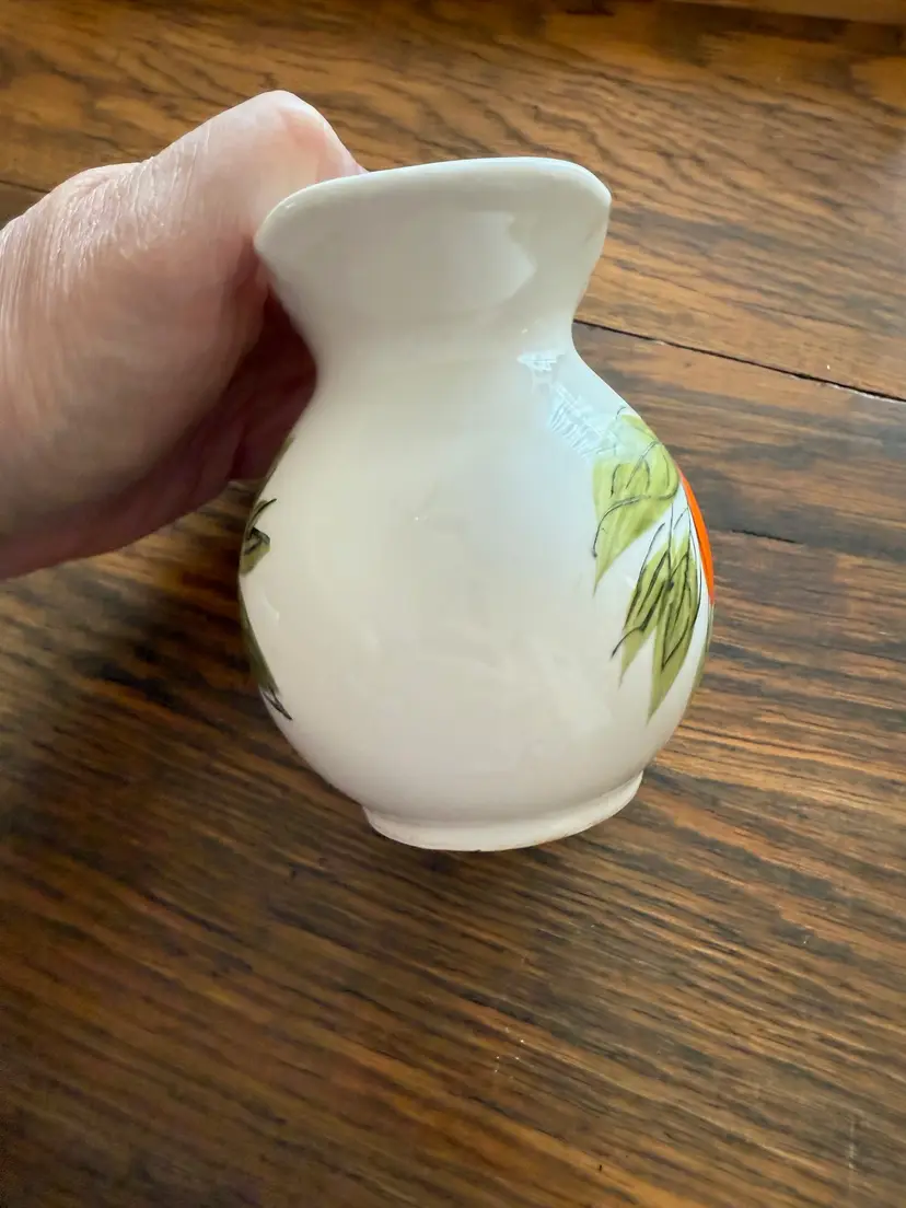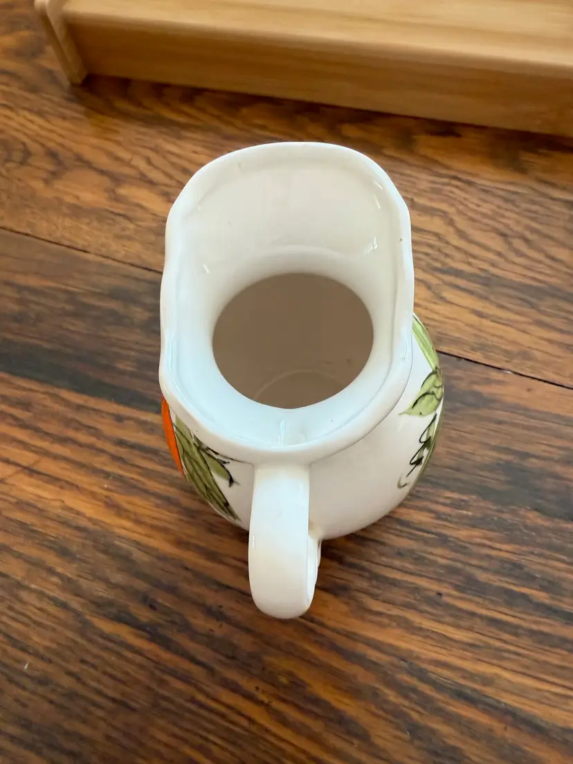 This charming vintage creamer pitcher is hand-painted in Japan, featuring a bold tomato (or persimmon) with leafy green vines on one side and foliage on the other. With its scalloped rim and ornate handle, it adds a sweet rustic touch to any farmhouse or cottagecore-style kitchen.