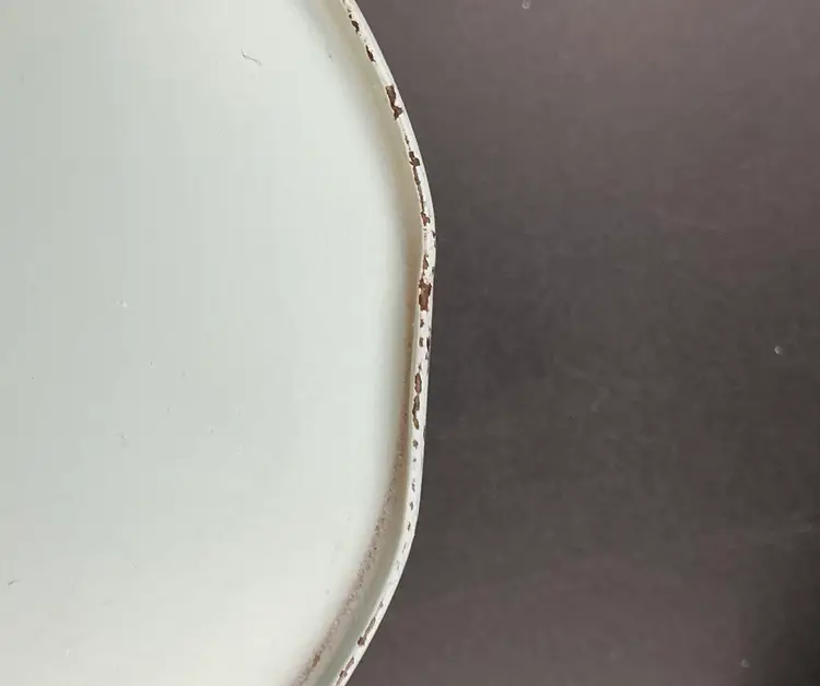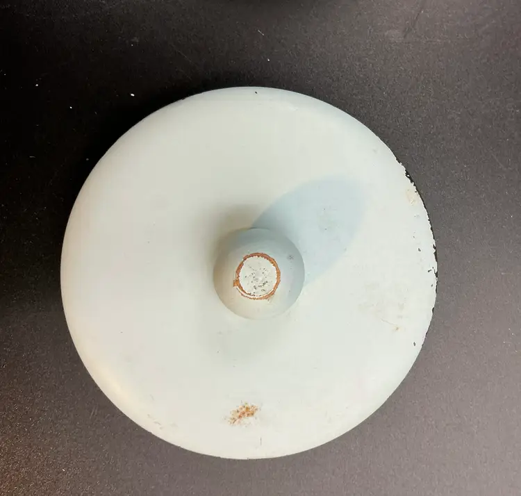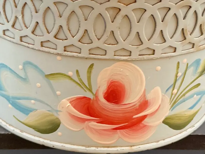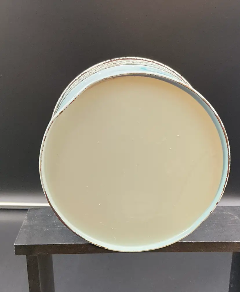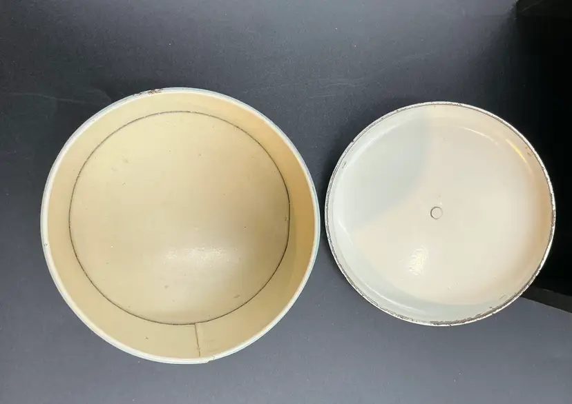 5 inches in diameter. Most likely from the 1940’s. Note small ding on base at backside of tin. Lid shows some paint loss.