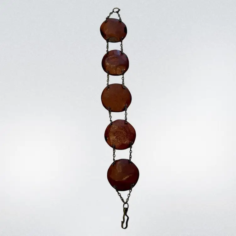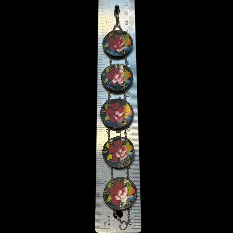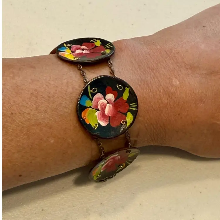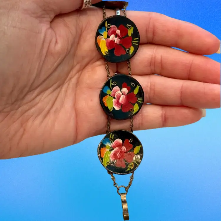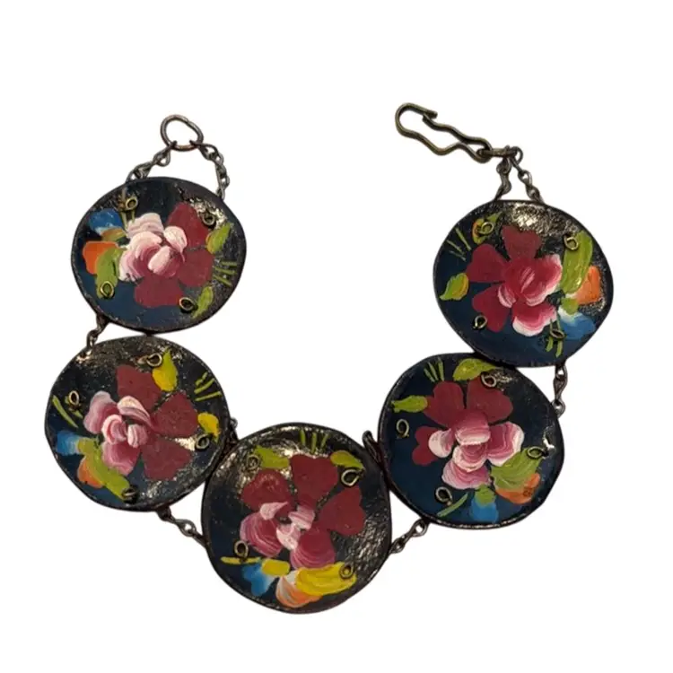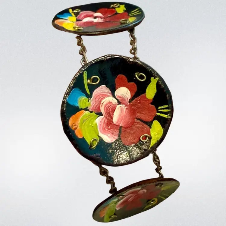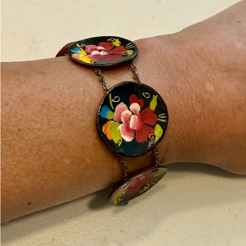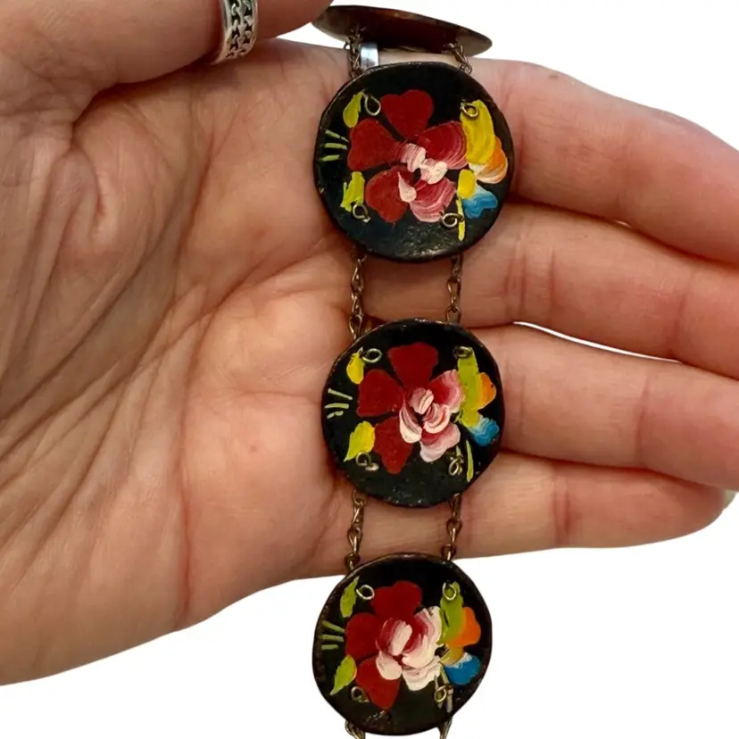 Gorgeous hand painted vintage Mexican folk art bracelet with lightweight discs that may be coconut shell or other lightweight wood. Lovely boho style bracelet measures 7.5” long.
