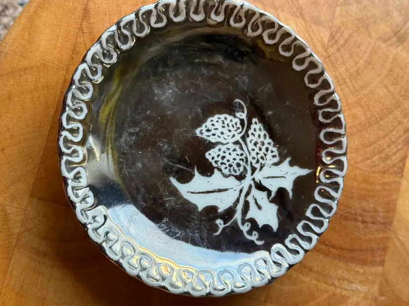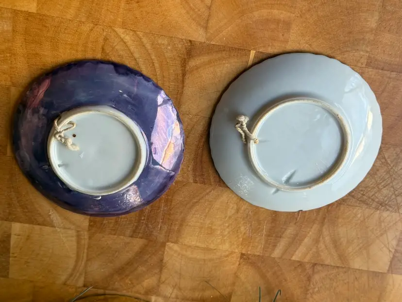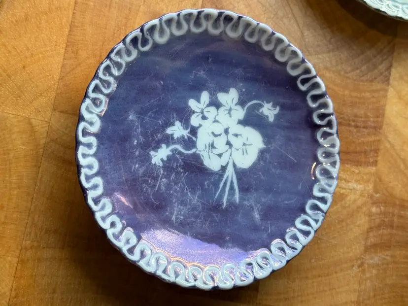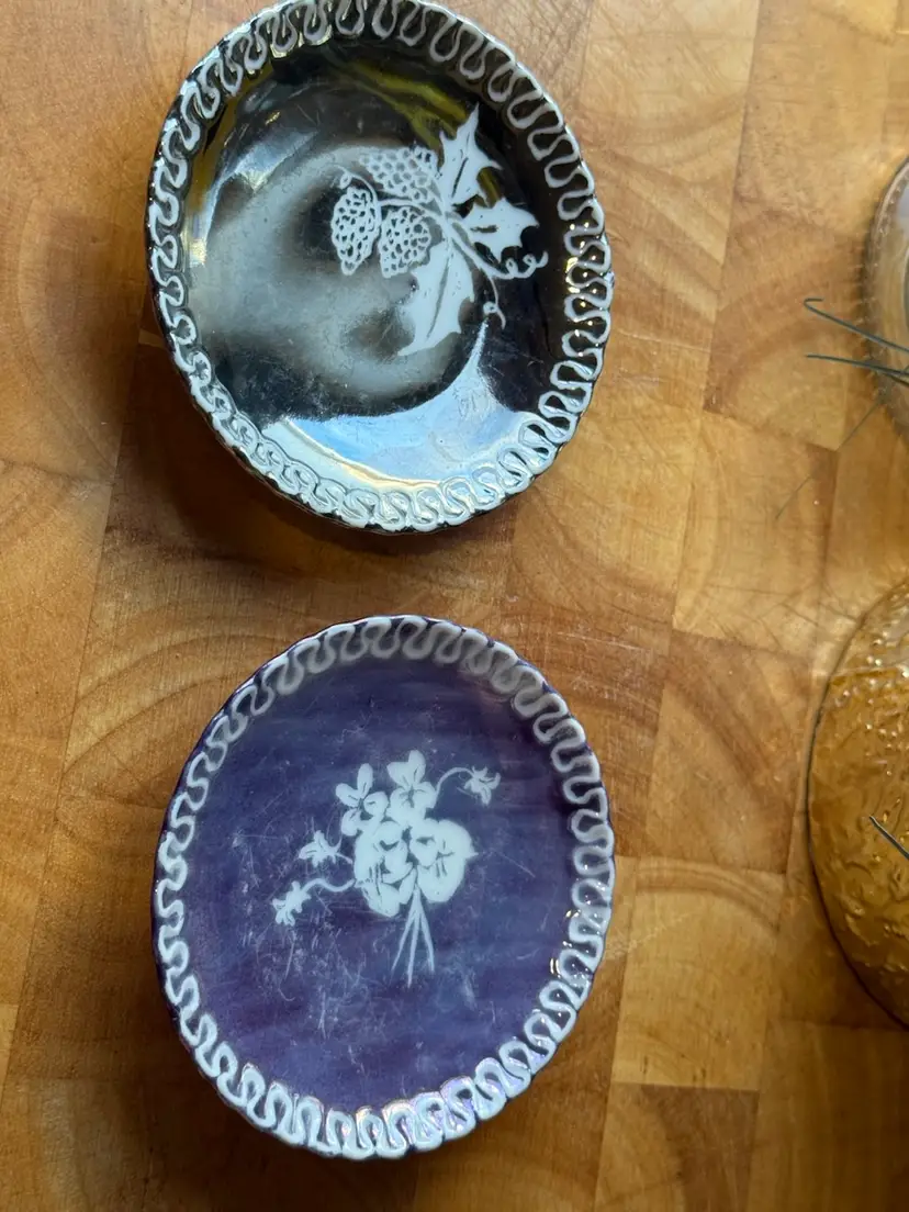 📝 Listing Details • Set of 2 small decorative plates / dishes • Designs: • Purple luster floral plate • Dark berry motif plate • Finish: Iridescent/luster glaze with hand-painted details • Use: Trinket dishes, ring holders, wall decor (both have hangers) • Size: Approx ~4–5 inches • Condition: • No major chips or cracks • Visible surface wear/scratching on purple plate (important to note) • Vintage wear consistent with age