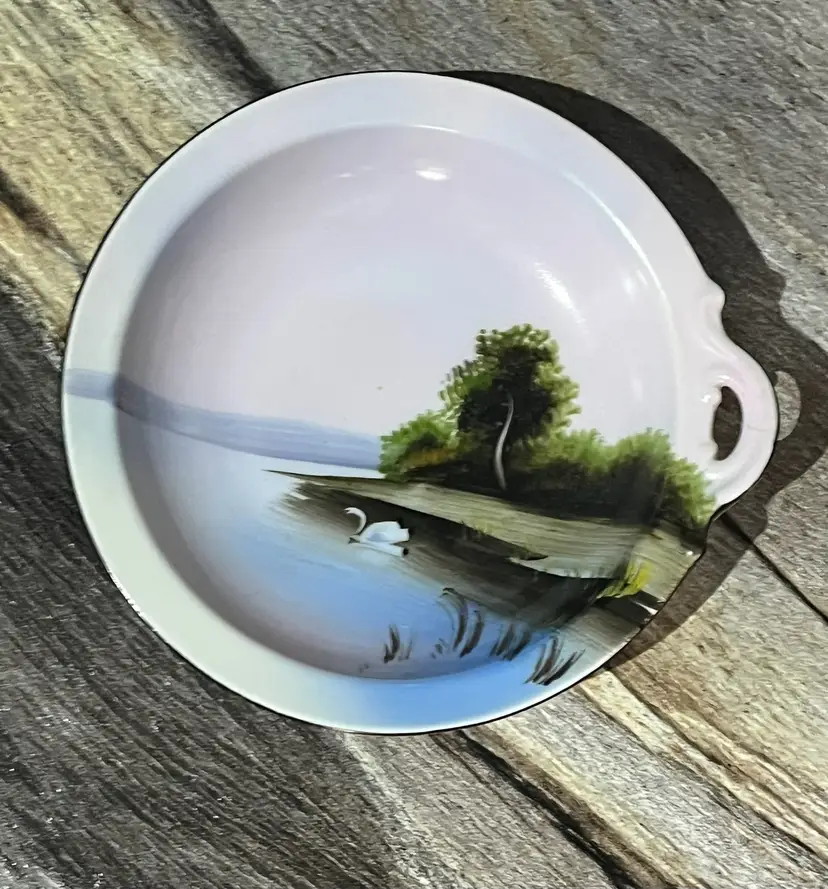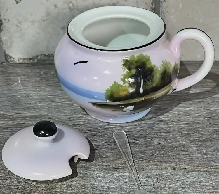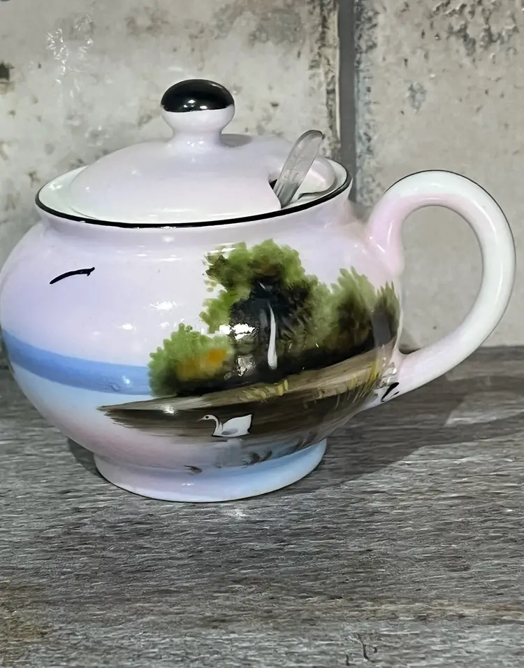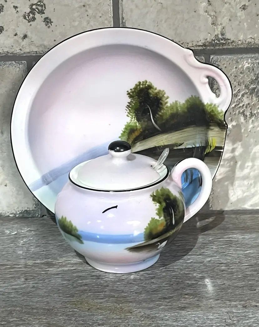 A vintage Noritaki Sugar Bowl and plate. It also includes a spoon. The sugar dish measures approximately 3 inches tall and 4 inches wide including the handle. The plate is approximately 6 inches. Small spoon is included. Free of any nics and such.