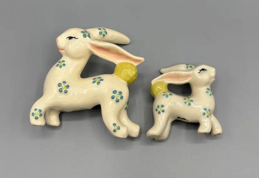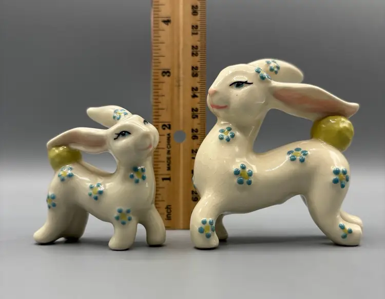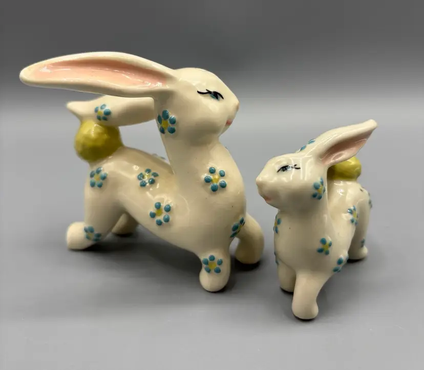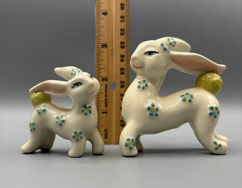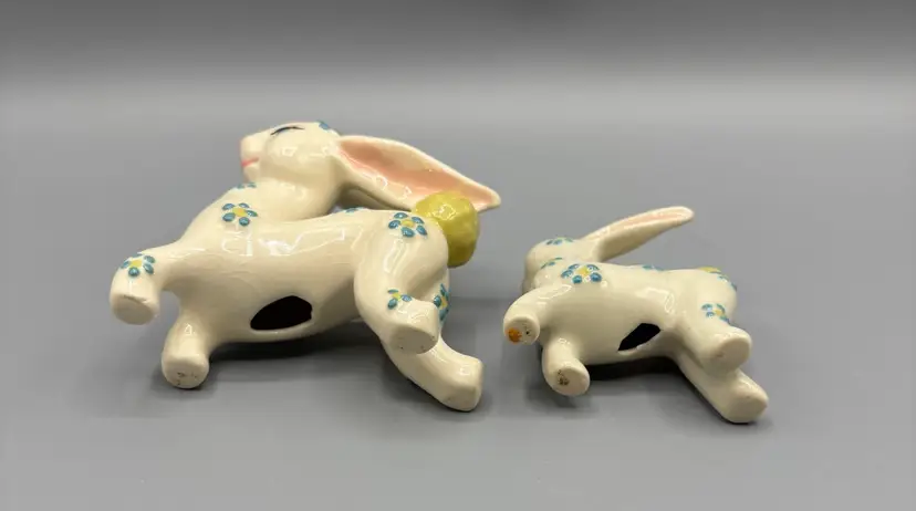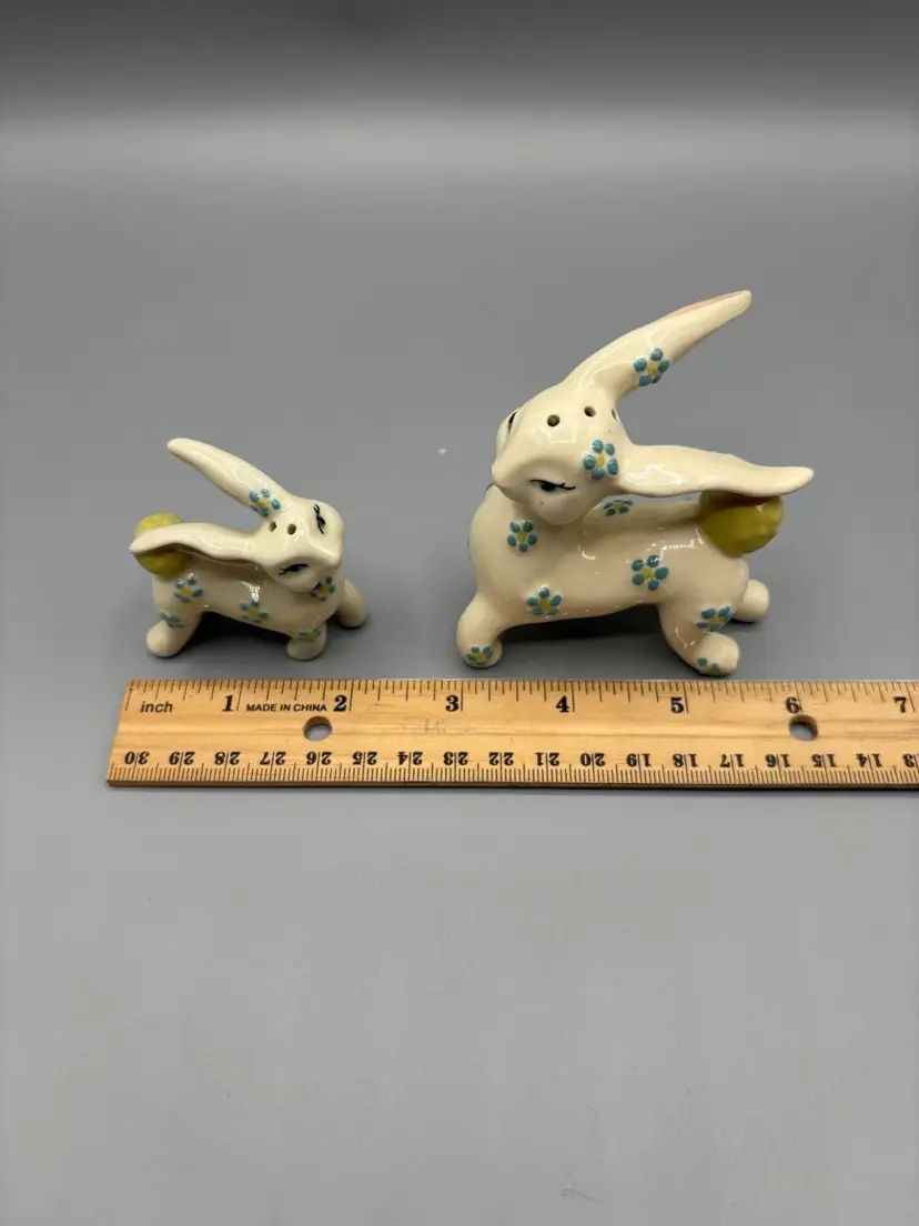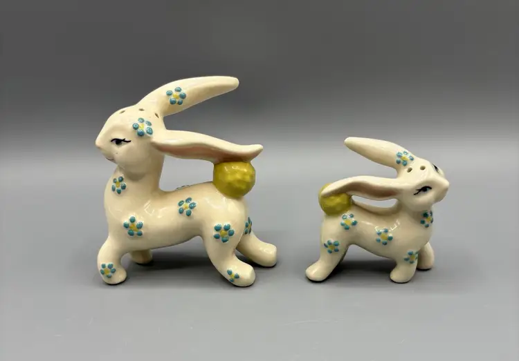 Sweet set of figurines! They do have holes in the heads to be shakers but no stoppers in the bottom. Some crazing but no chips, cracks or repairs.