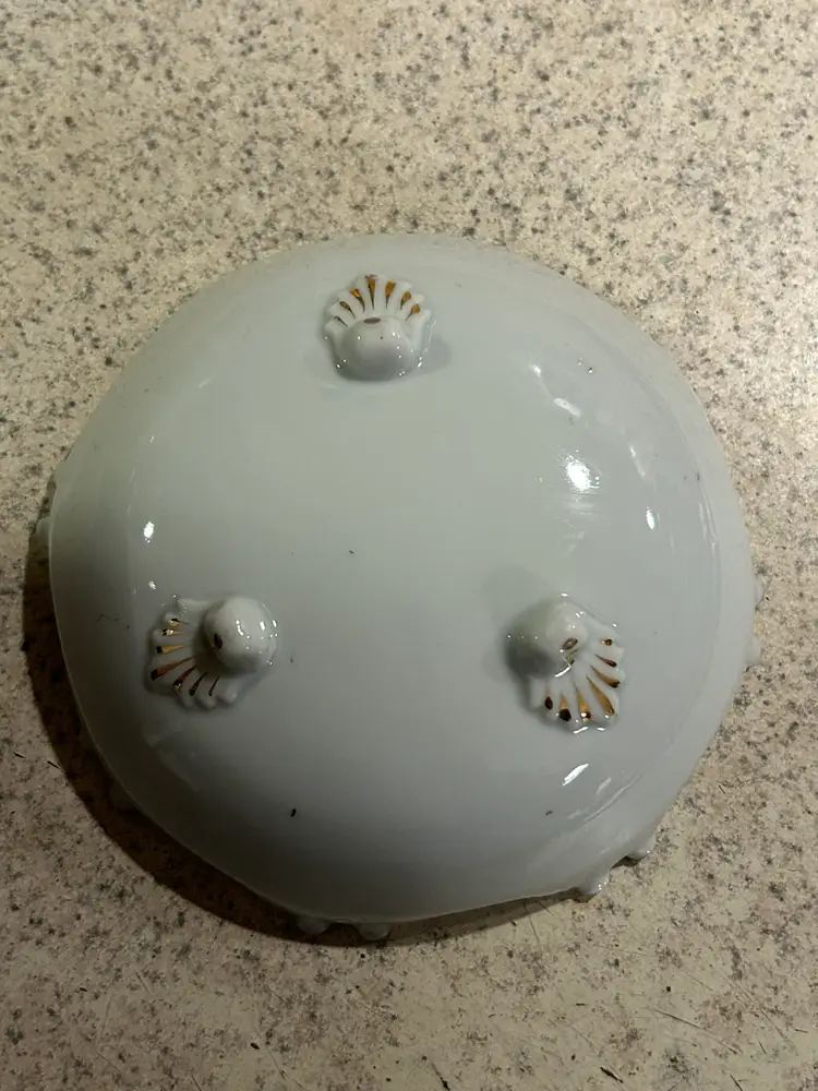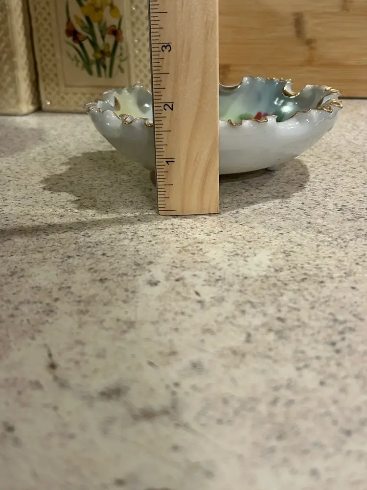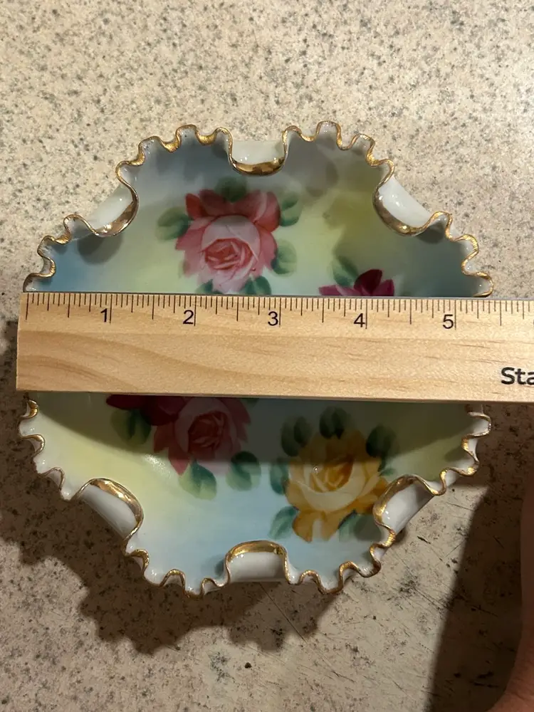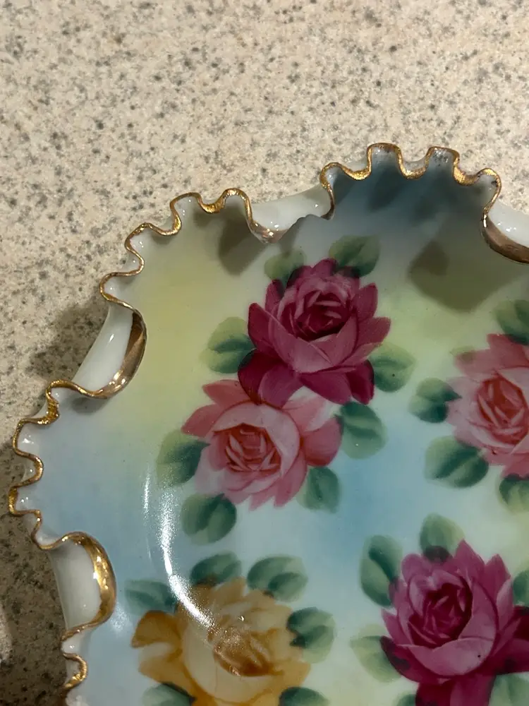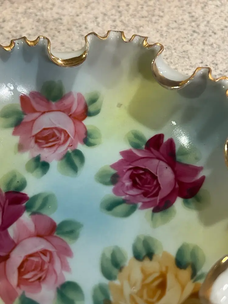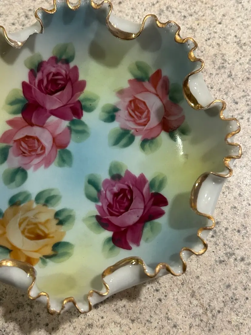This is a small vintage porcelain bowl featuring hand-painted roses and a ruffled, gilded edge. The bowl is supported by three small feet, each adorned with a decorative design.