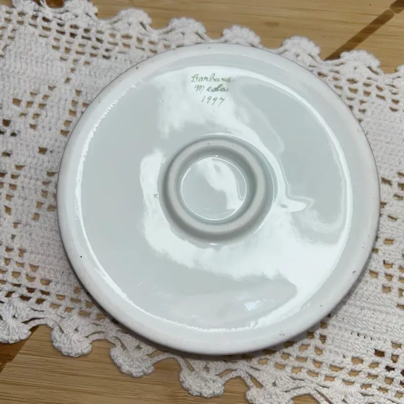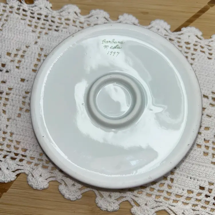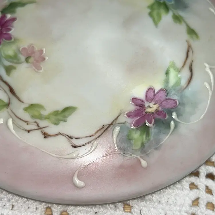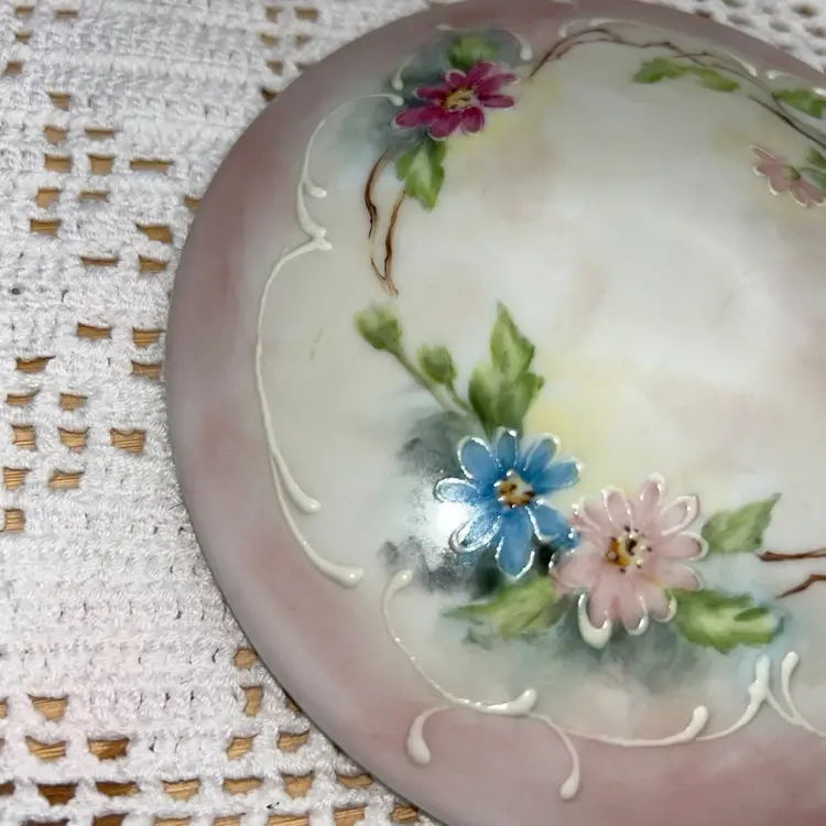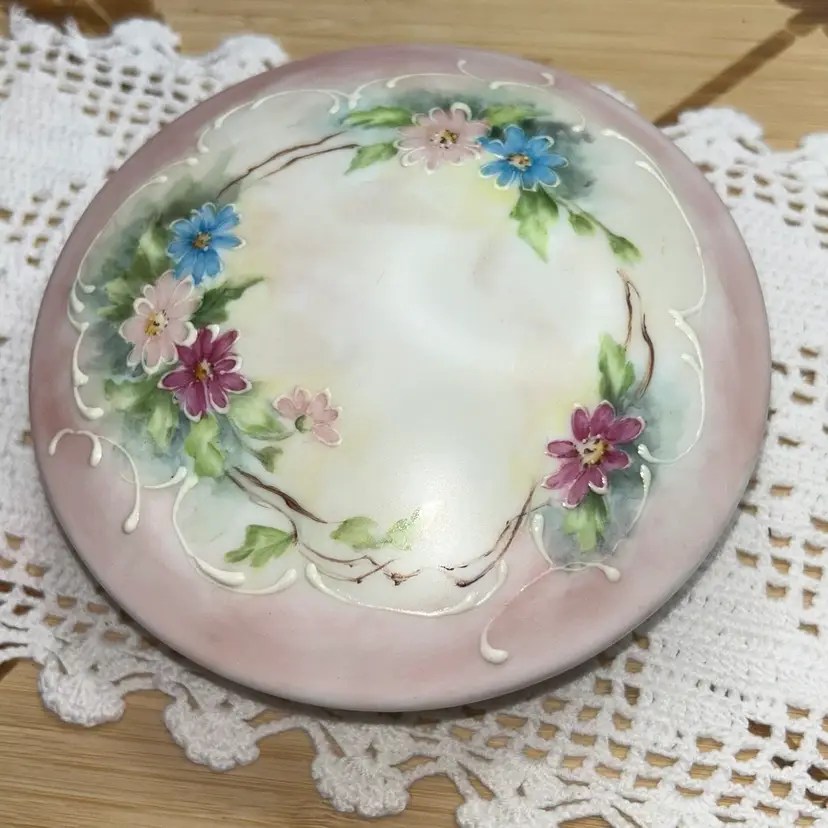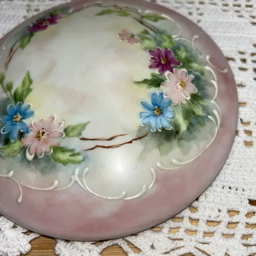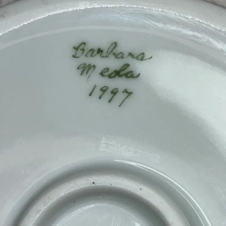 Hand painted and signed by Barbara Meda 1997. Floral design with Moriage outlines for emphasis. 5” diameter, 1.25” to top of box. 1. 75” to top of dome on lid. Excellent condition. No chips or cracks.