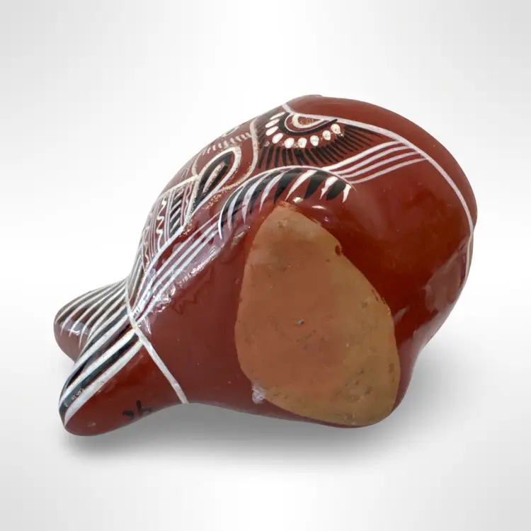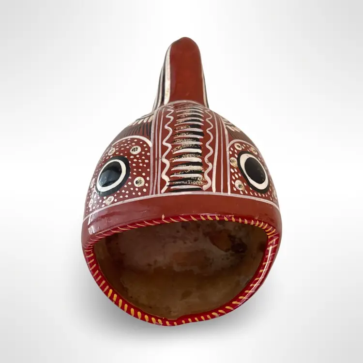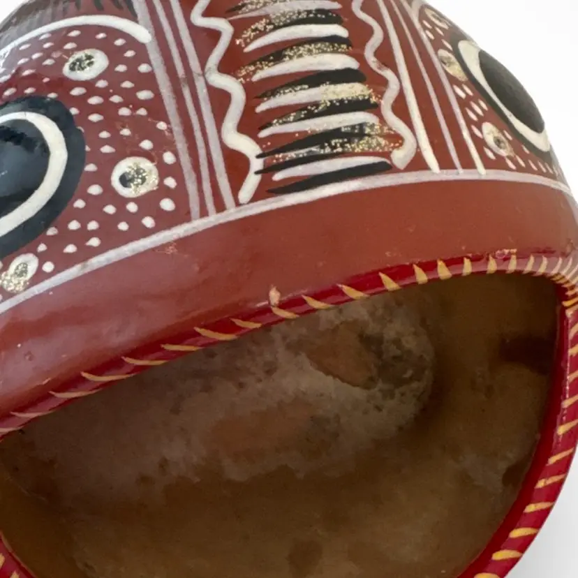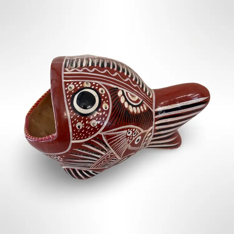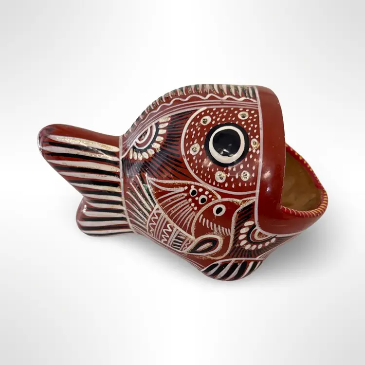 Great hand painted terra cotta pottery wide mouth fish sponge holder. Brown glaze with black, white, and gold glitter painted design. In good condition , with one small glaze chip on the mouth (see photos). Measures approximately 6.5” W x 3.5” H