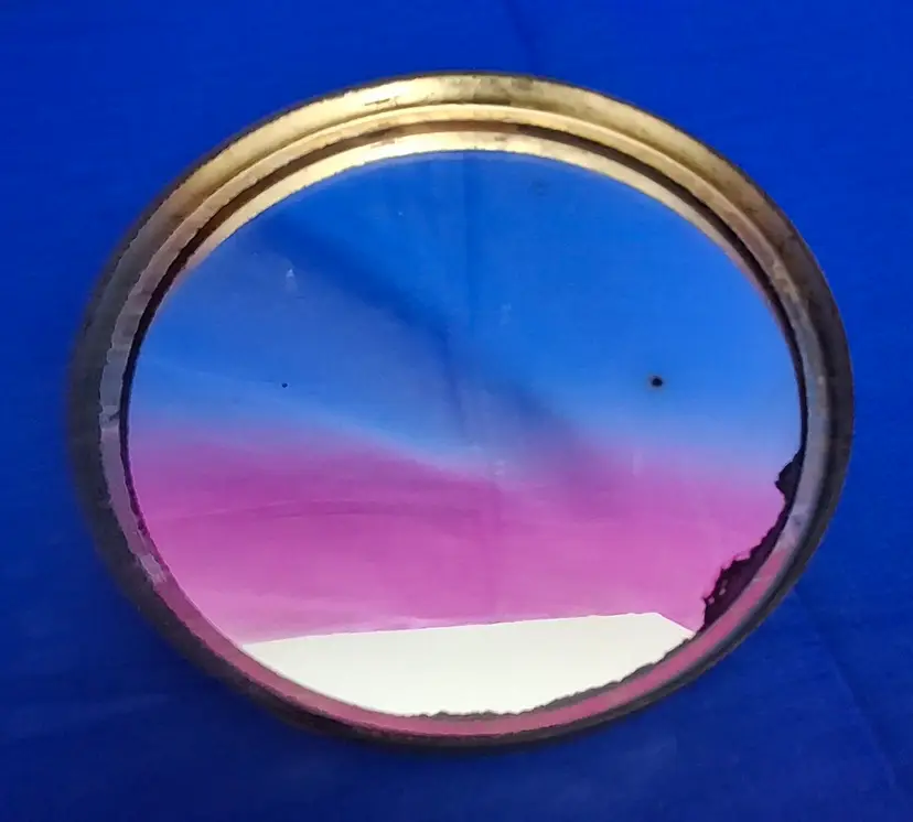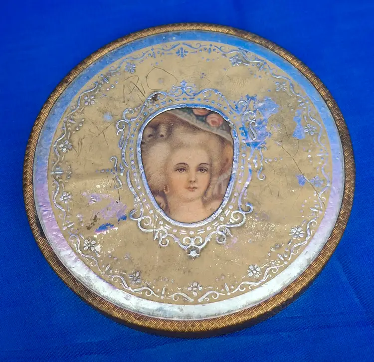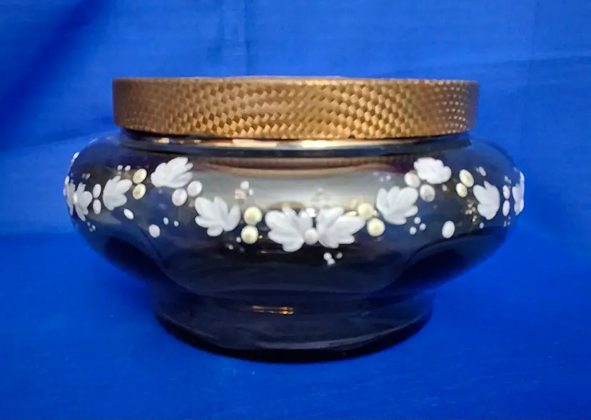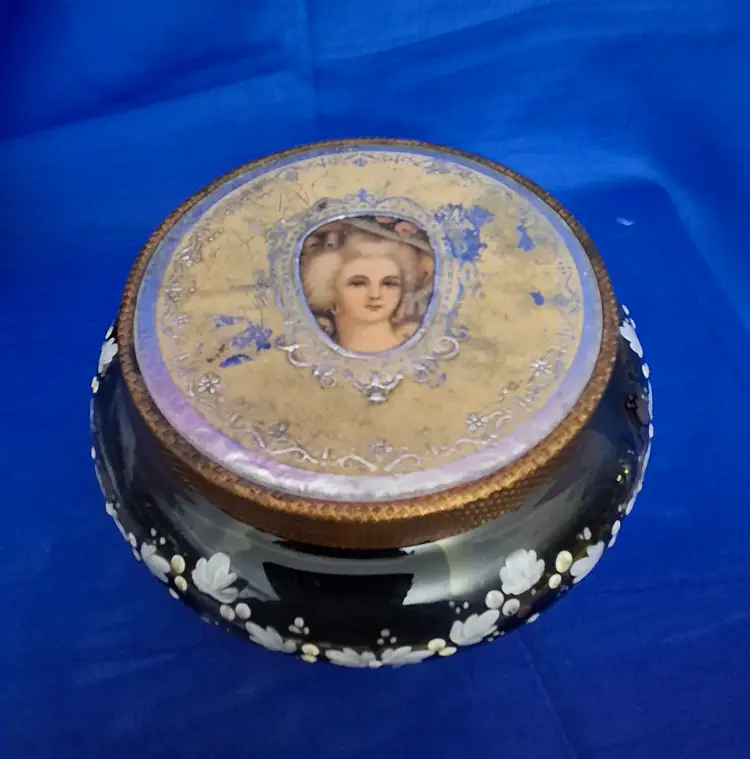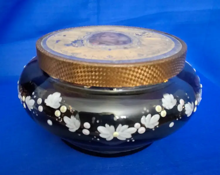 Vintage Hand-Painted Powder Jar with Portrait Lid is 5" wide x 2 3/4" tall. This beautiful amber glass jar is hand-painted a swag of white flowers all the way around the paneled surface. There are a few very small chips on the inside rim. The bottom is nicely polished. The lid has a foil papered frame with a lady's portrait in the center. The edge is a fine basketweave pattern and underneath it has a mirror with slight wear to the silvering. No chips, cracks, or repairs. Please view the pictures and feel free to ask questions. Thank you for visiting my shop.