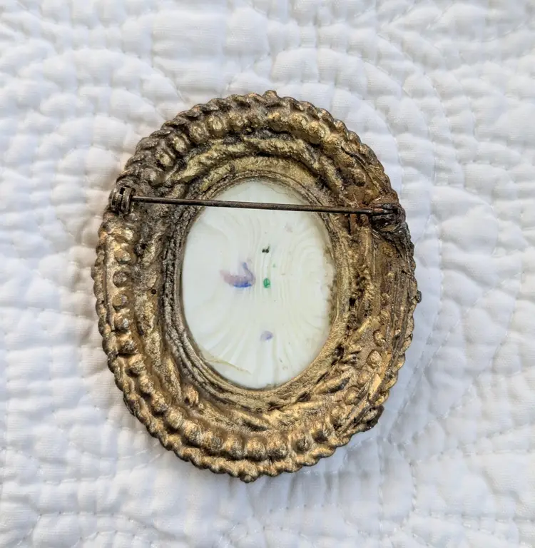 This brooch is 2-1/4" long. A couple of the prong tips are missing, though this is barely noticeable. Unmarked