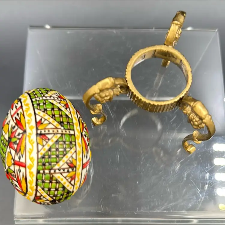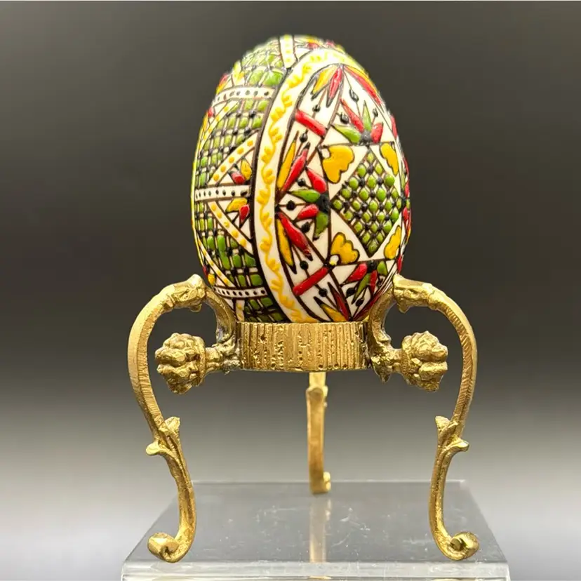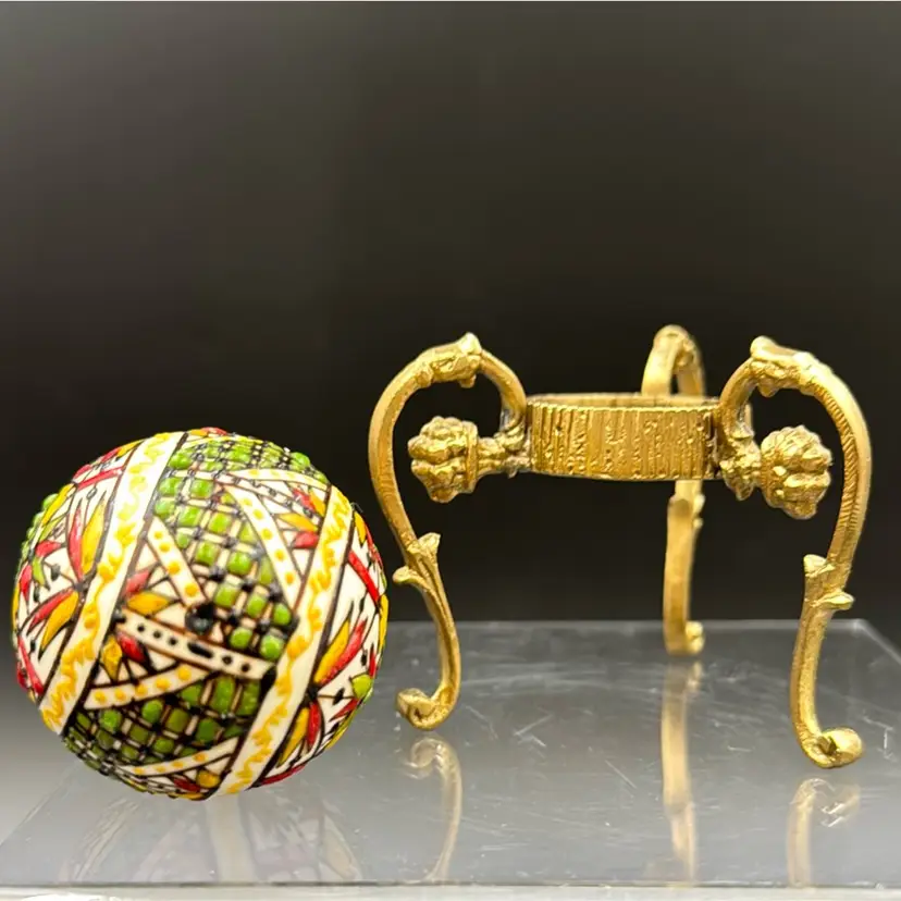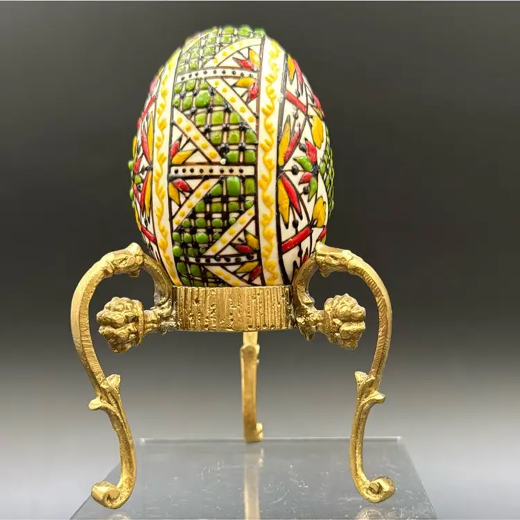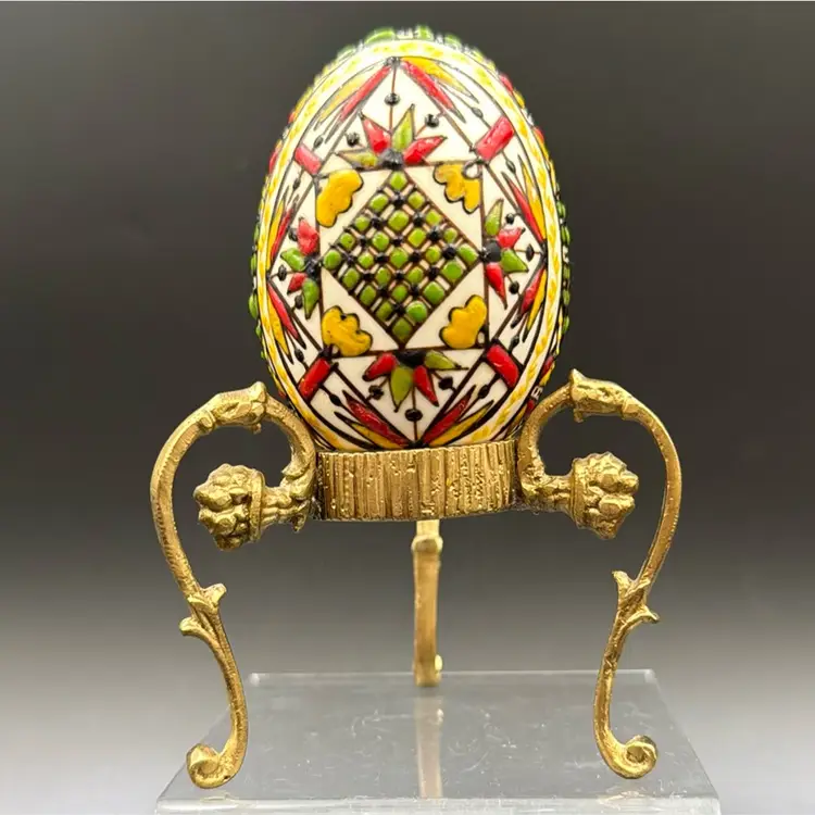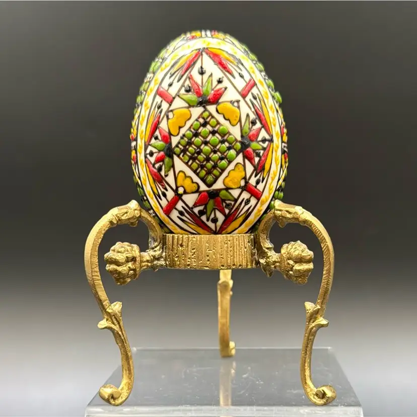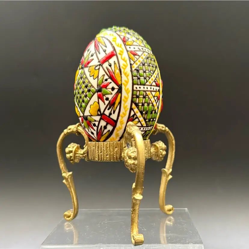 3”T 21/2”W no chips, cracks or breaks and wonderful condition very well done art on the egg. It’s a beautiful piece comes with ornate Stan no makers mark measurements are only for the egg. Stan 2”T 21/“W