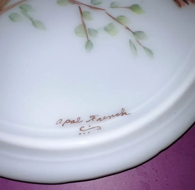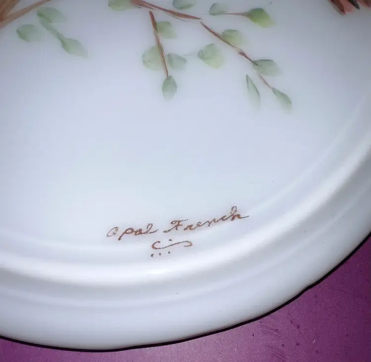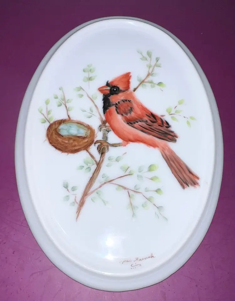 Beautiful oval shaped porcelain trivet hand painted with a red cardinal. Artist signed “Opal French”. 7 1/2” by 5”