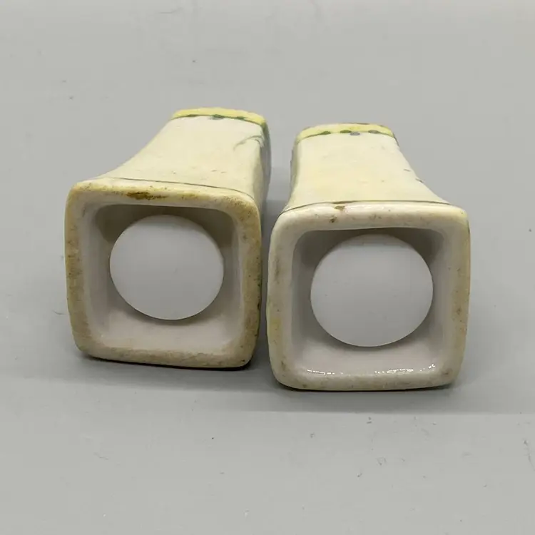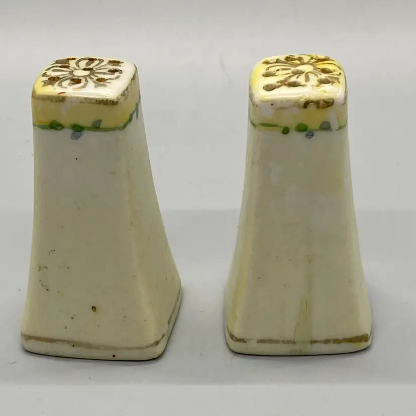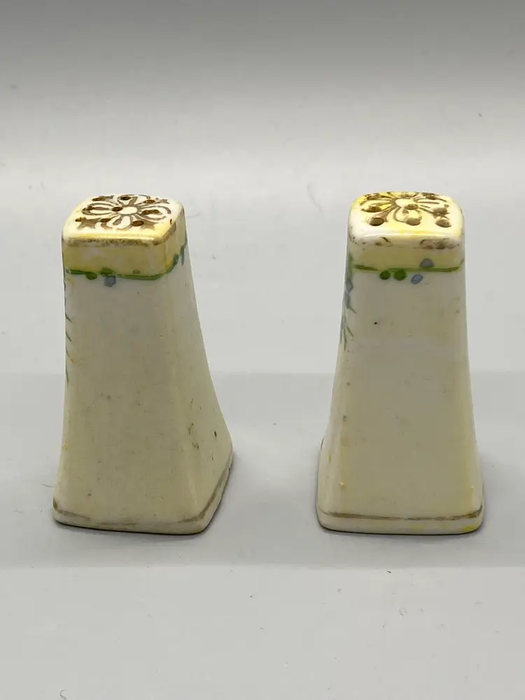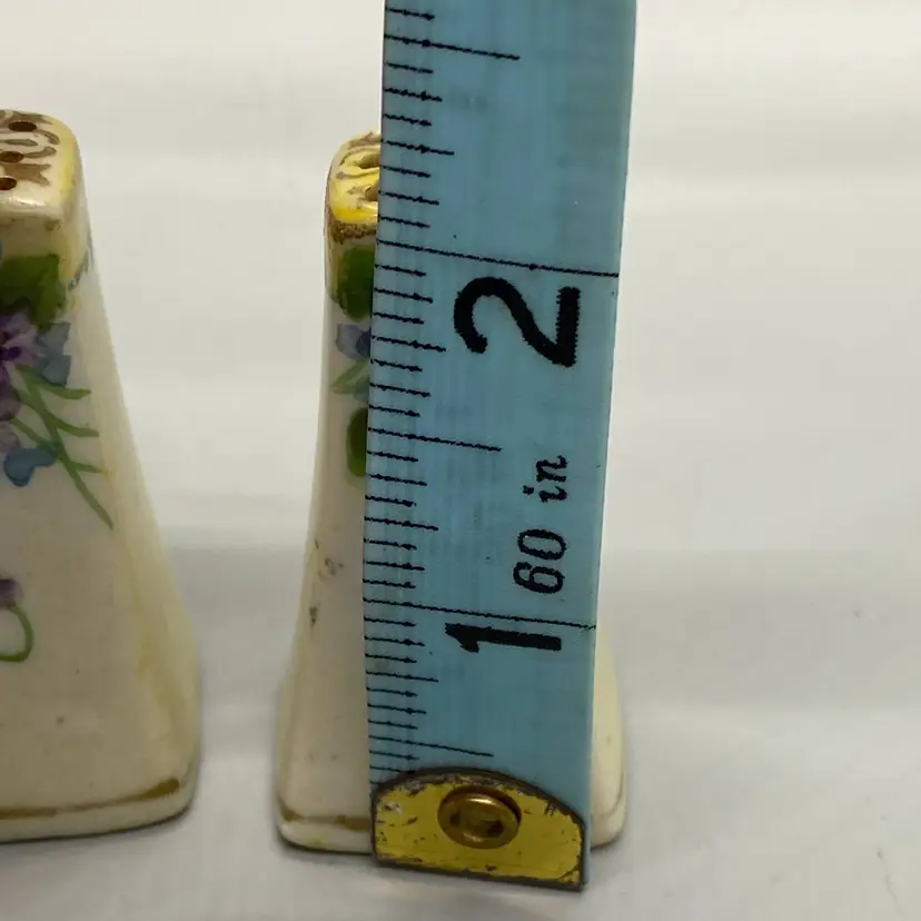 Vintage Porcelain salt & pepper hand painted purple violets & gold accents new replacement plugs 2.25" tall no chips, cracks, or repairs some noticeable wear on gold gilding