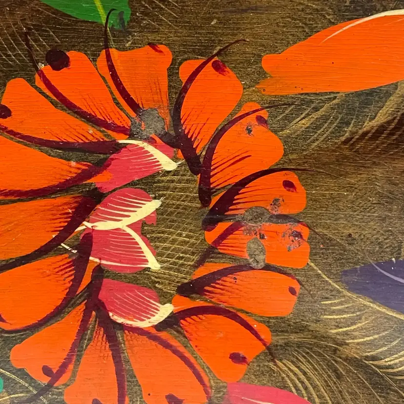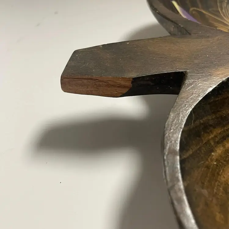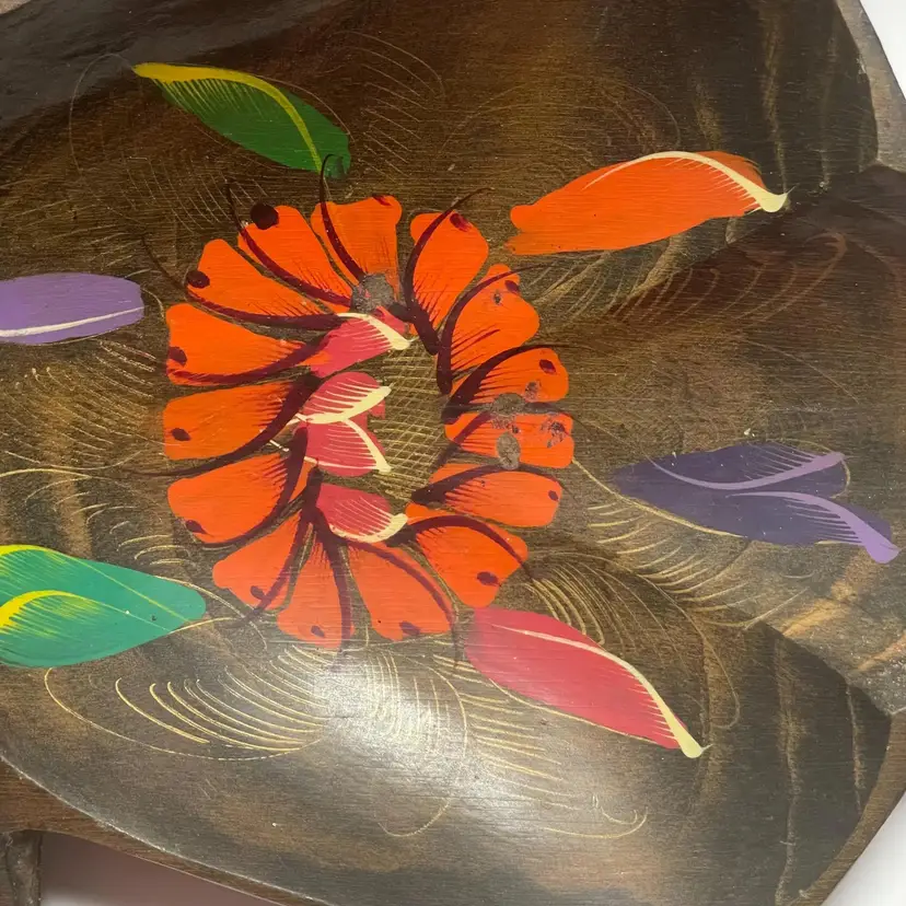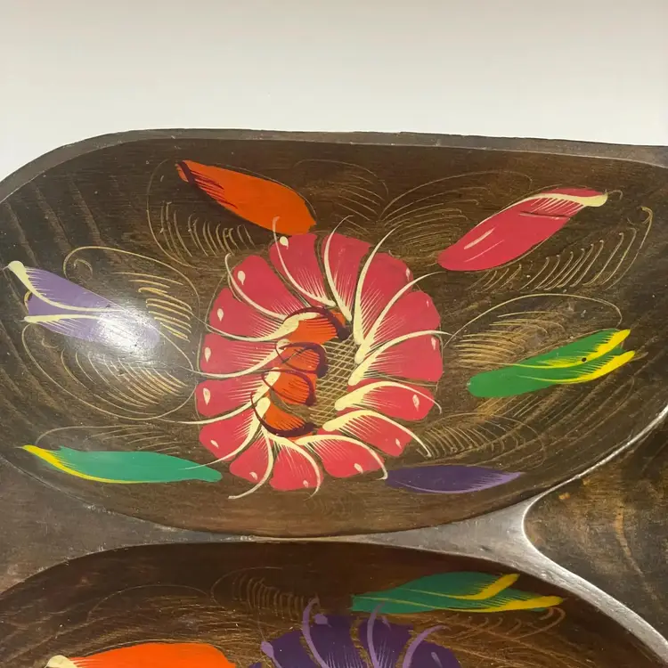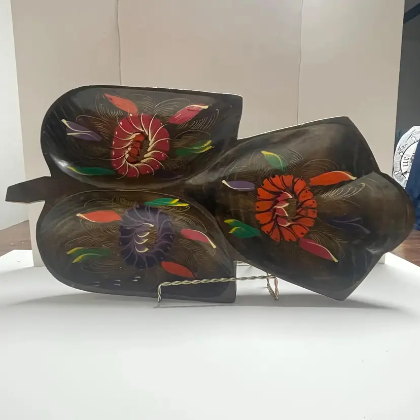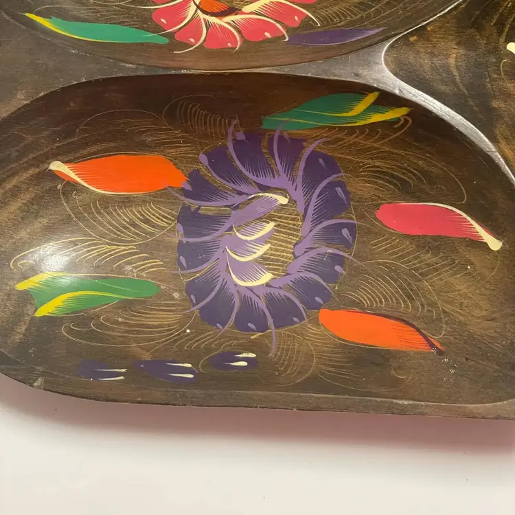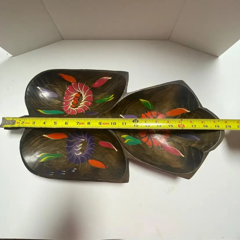 This is a beautiful divided, hand painted teak leaf-shaped platter with 3 sections. It is approx. 20 inches long and approx. 10 inches wide at the widest point. There are some chips in the paint (see close up photos), mild wear around the edges of the dish consistent with age and use of product, and a small chip in the wood on the leaf stem handle (picture provided).