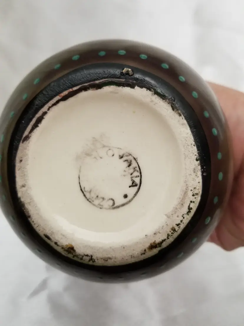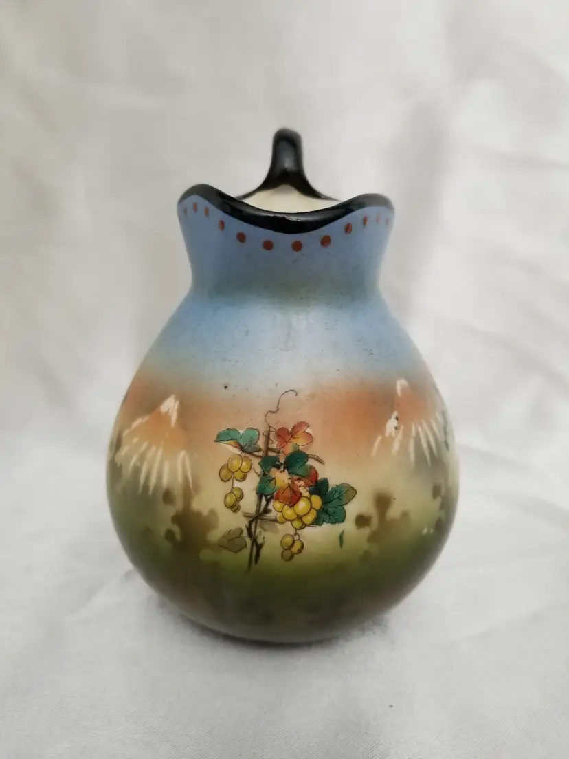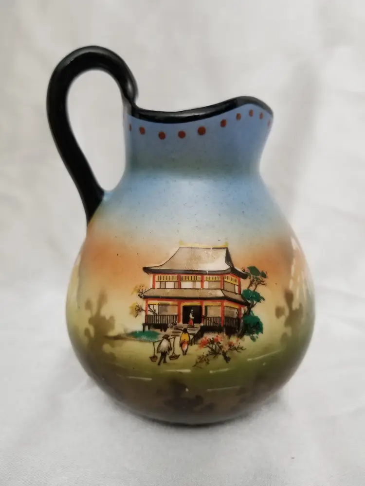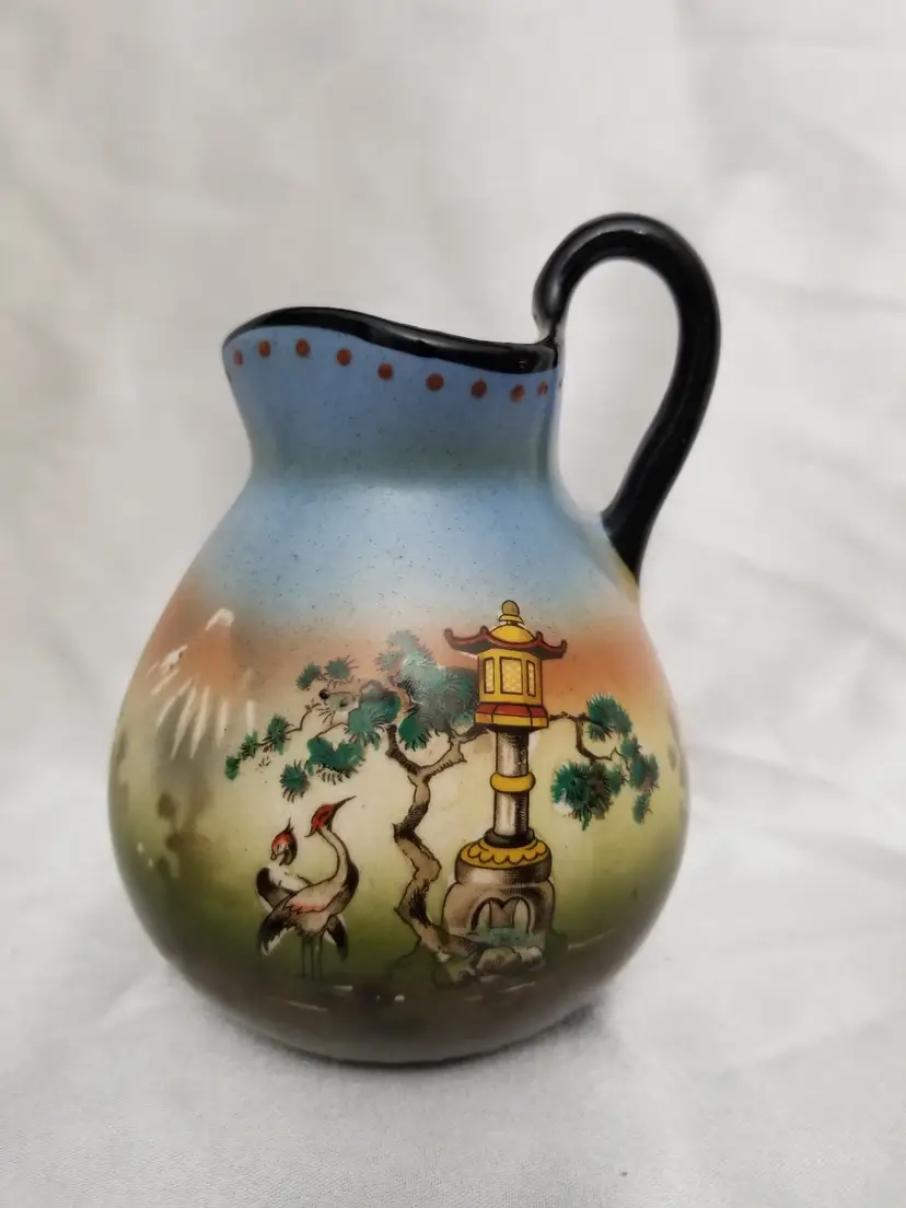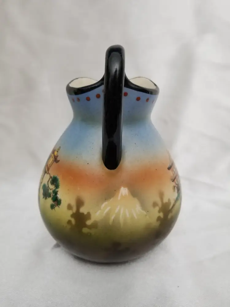 The Vintage Hand-Painted Transferware Pitcher hailing from Czechoslovakia is a charming ceramic piece that showcases intricate Japanese-inspired designs. It depicts serene geisha scenes on both sides, one featuring a majestic pagoda nestled in a mountain landscape and the other presenting a pagoda lantern, a bonsai tree, and graceful cranes. The background of the artwork boasts a delightful gradient color scheme, shifting from a soft blue hue at the top to a warm blend of orange and green towards the bottom. The pitcher is adorned with elegant black handles and matching trim, adding a touch of sophistication to its overall look. Crafted with care and attention to detail, this 4 1/2 inches wide and 5 1/2 inches tall ceramic item is a testament to the rich artisanal tradition of its origin. Its unique aesthetic appeal and cultural motifs make it an excellent addition to any home decor or collection of antique dishware. Don't miss the opportunity to own a piece of history and artistry by checking out the detailed photographs provided. If you have any further inquiries, please do not hesitate to contact me for more information.