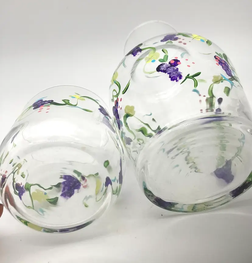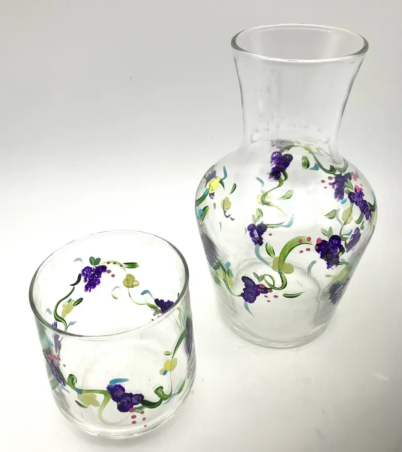 Measures 7” tall by 4” diameter. Carafe is 6.5” tall and glass is 3.25” tall. Painting still in great condition. Age unclear. Not signed.