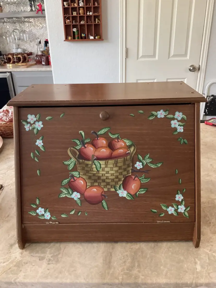 This item is a vintage hand-painted wooden bread box. Design: Features a painted basket of apples surrounded by small white and blue flowers. Material: Constructed from wood with a walnut-toned finish. Function: Designed as a storage bin for kitchen essentials. Style: Rustic farmhouse or country apple style.