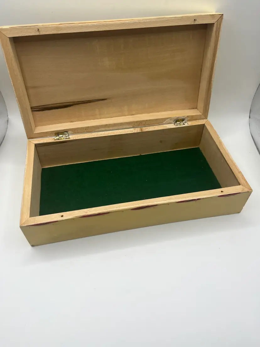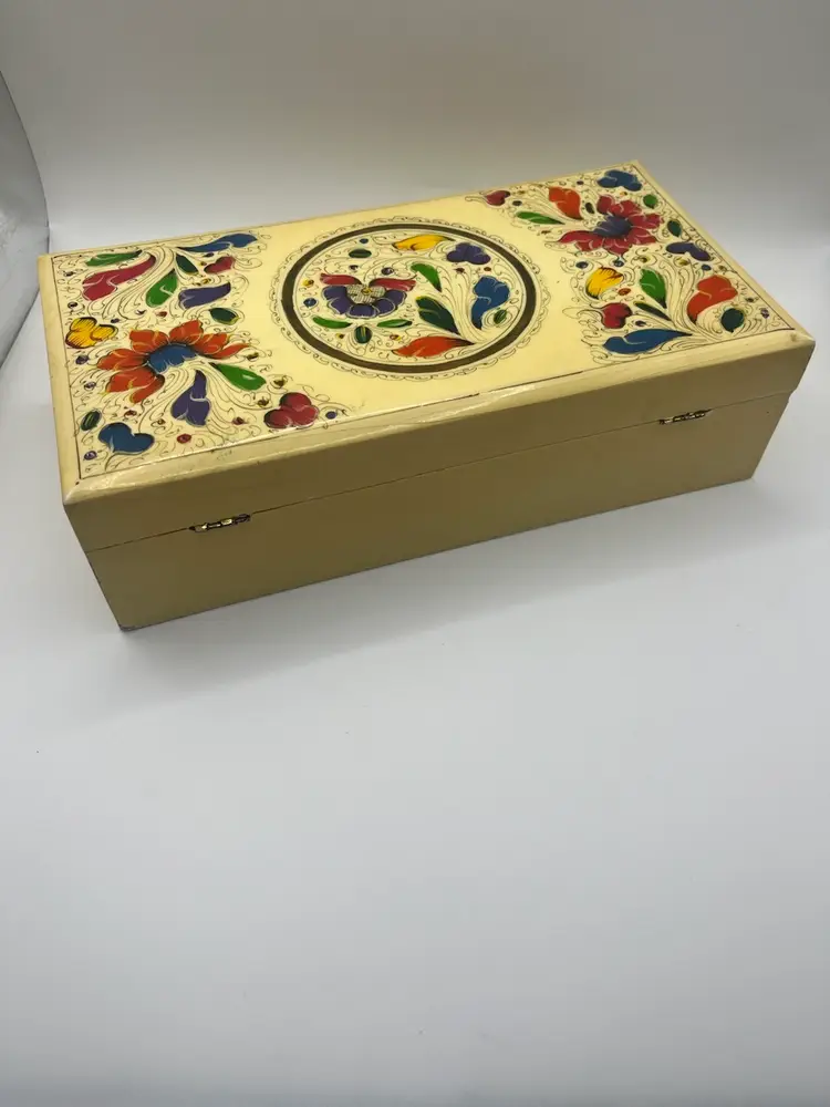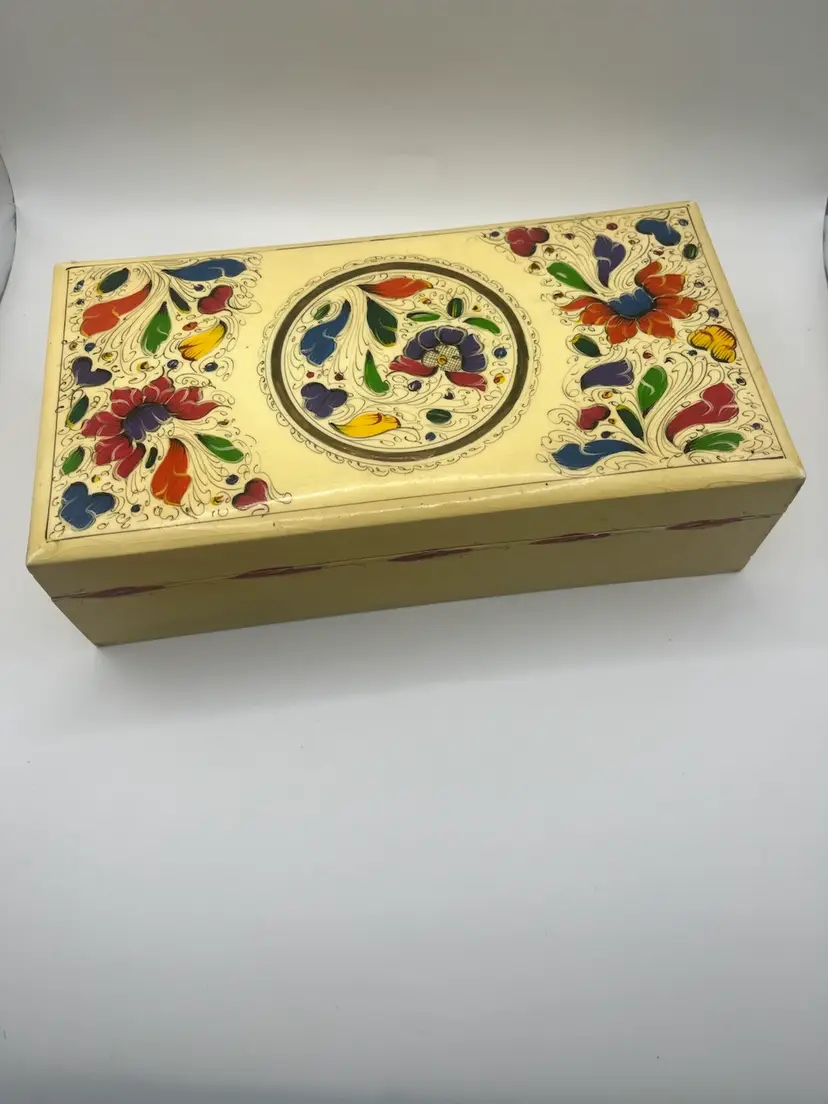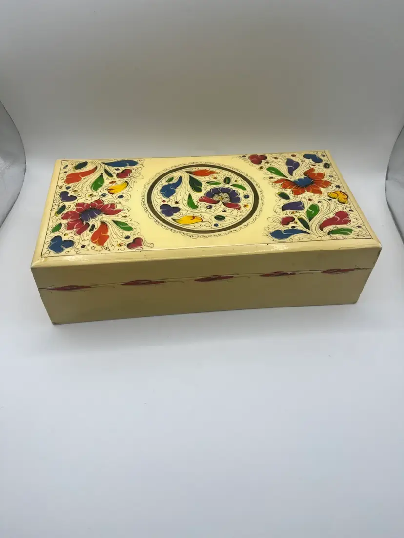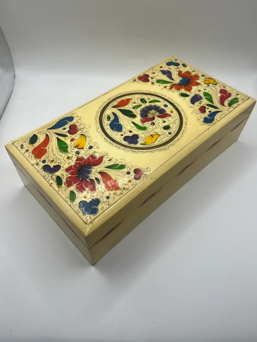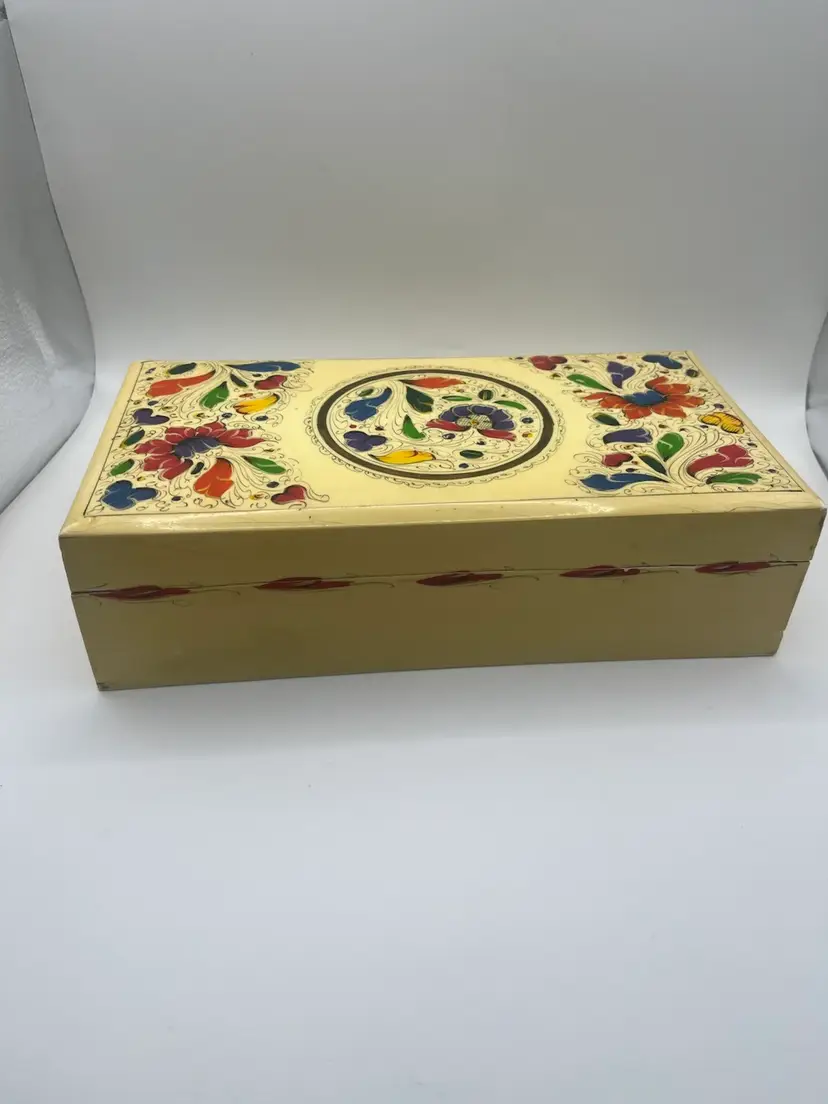 Pretty vintage hand painted box. Measures 9 7/8” x 5” x 2 3/4” Wear consistent with age.