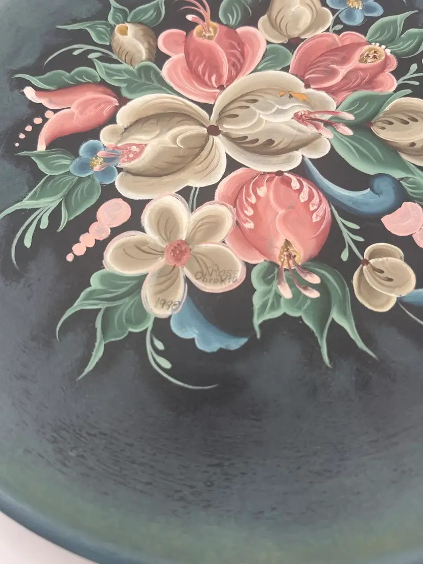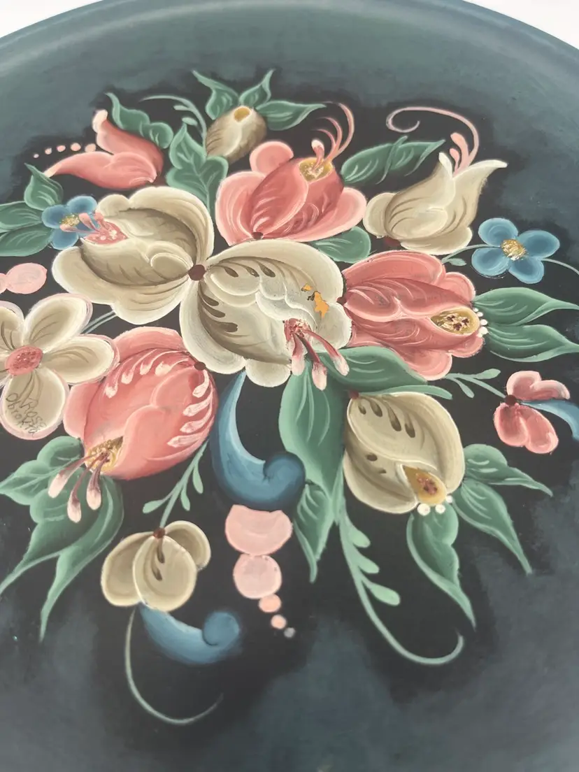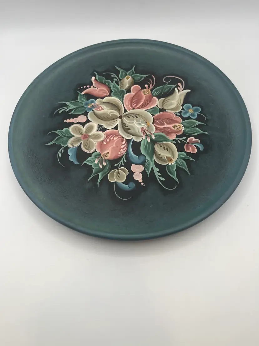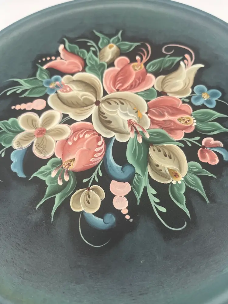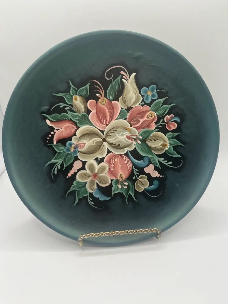 This is a vintage, hand-painted wooden plate, likely of German origin. It is decorated using a style similar to Norwegian rosemaling, characterized by floral design. Beautiful color and detail. Ready to hang. 9”