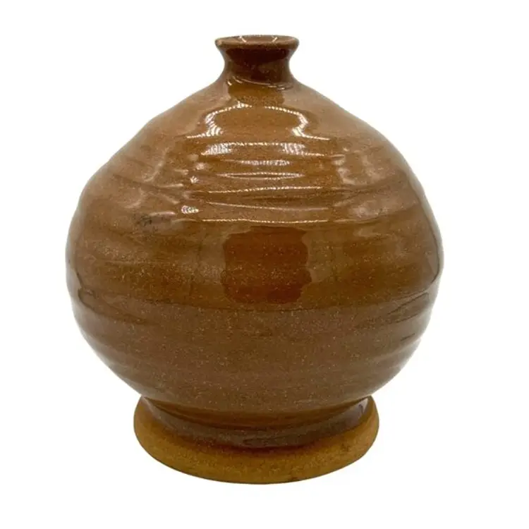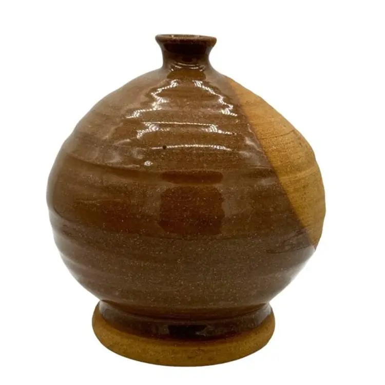 VINTAGE HAND THROWN BROWN GLAZED ROUND BUD VASE SIGNED R.N. 1991