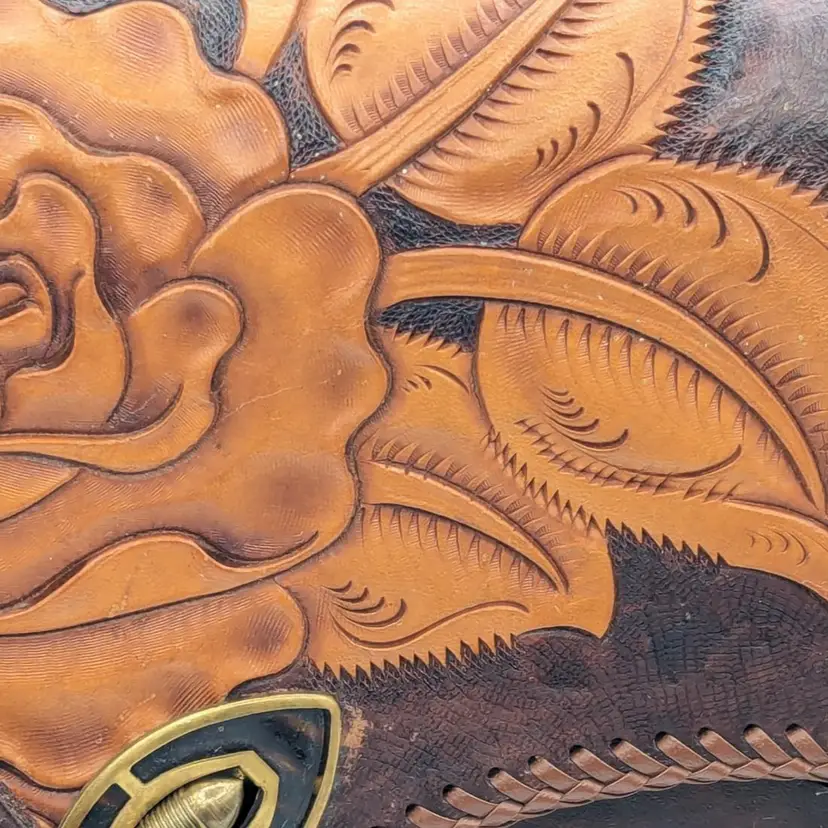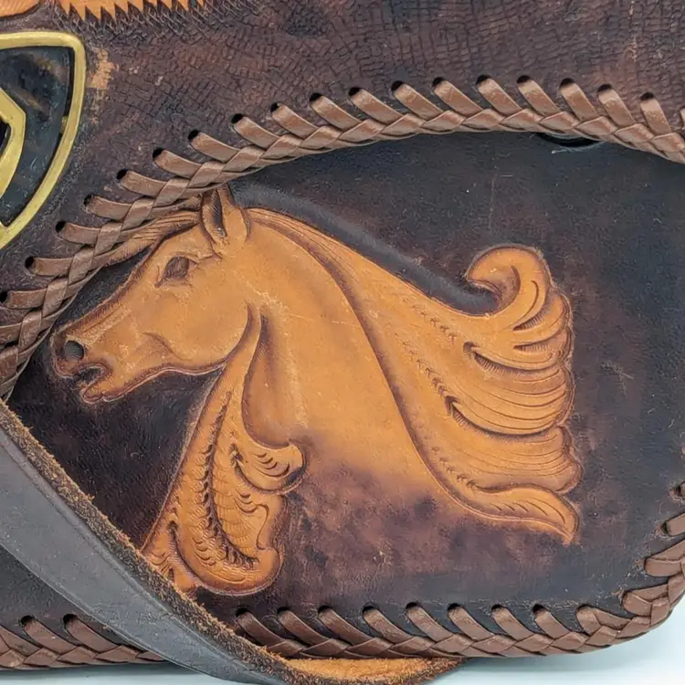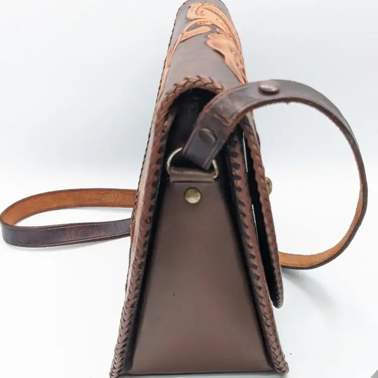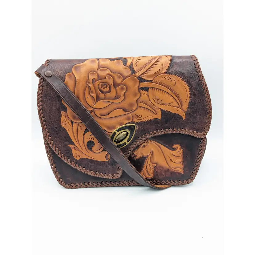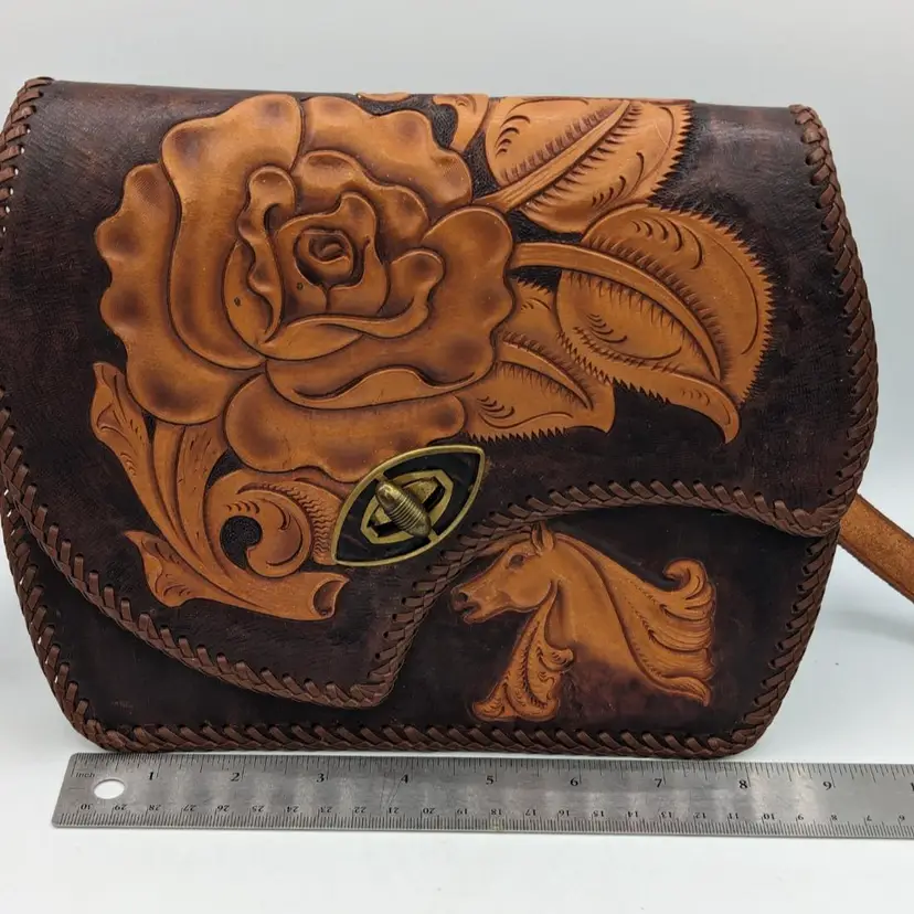 Vintage hand tooled leather purse, with suede and small zipper pocket inside. Large rose design with a miniature horse head at bottom. Measurements of the bag are in the photos, strap drop is approximately 16 in. Toggle closure, detachable shoulder strap. excellent vintage condition. a few stitches on the interior seam are loose, but otherwise absolutely gorgeous. unique and you won't see another one like this.