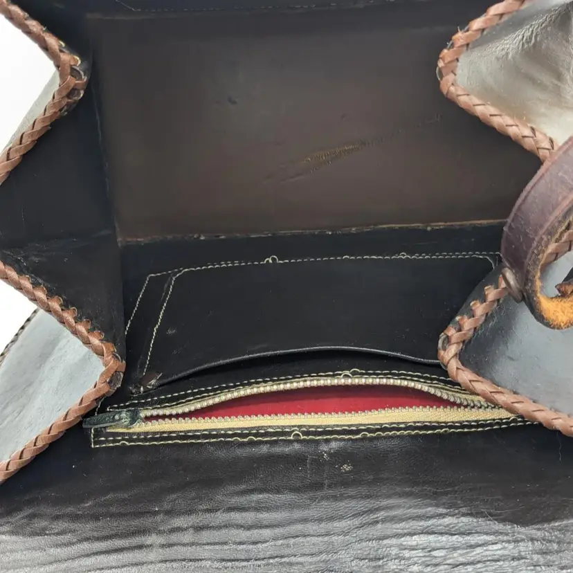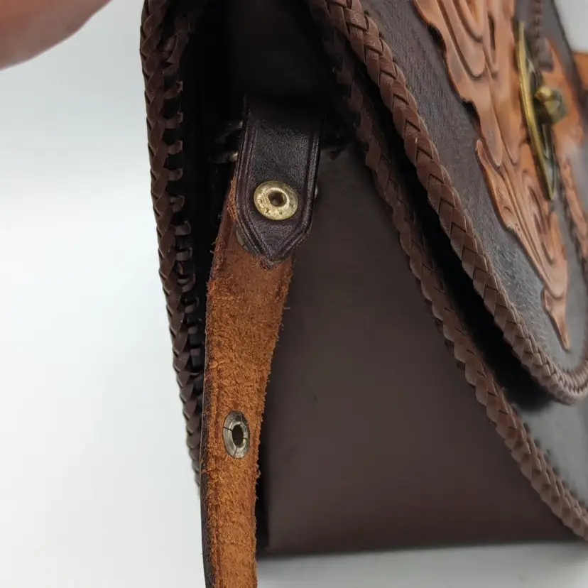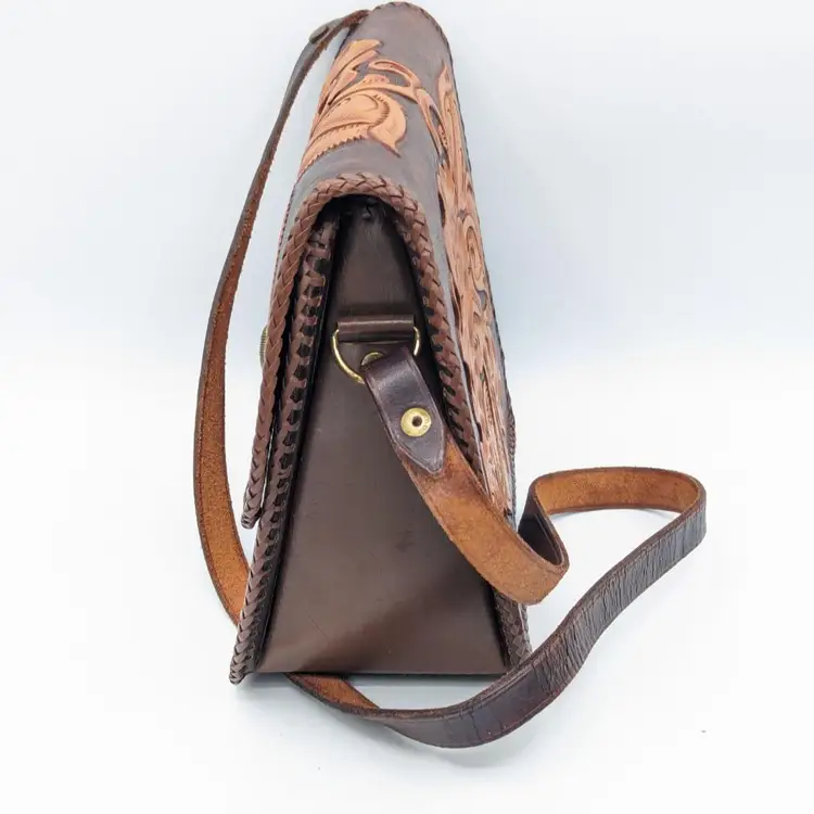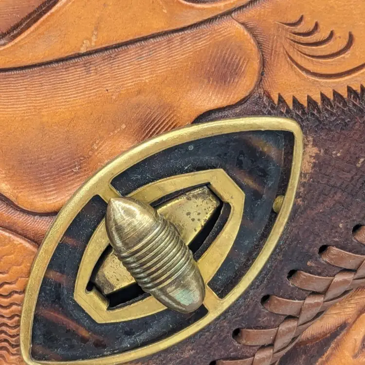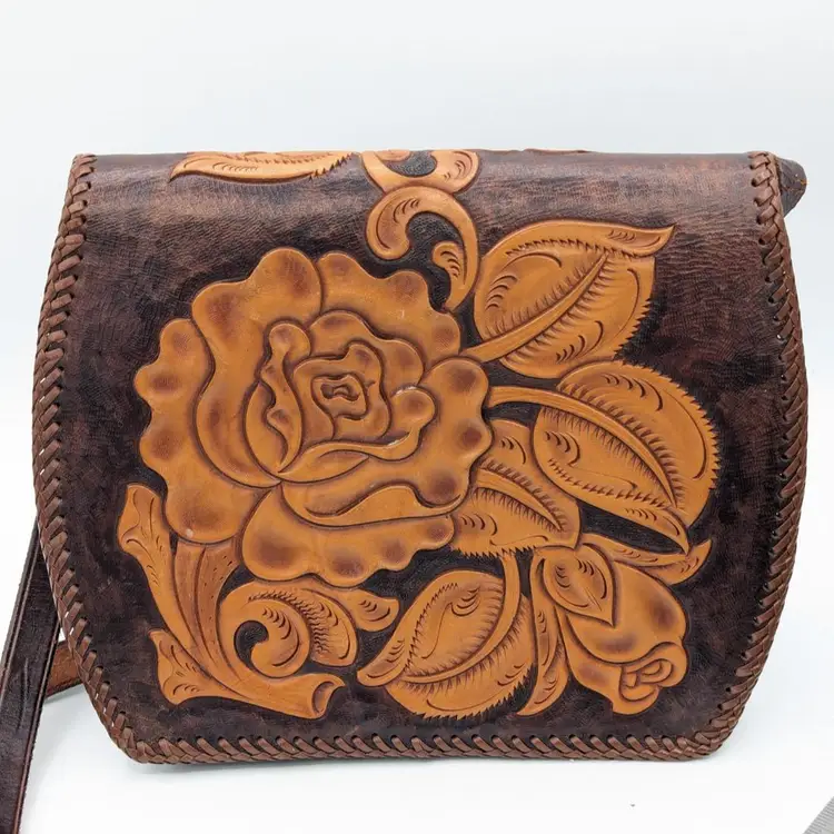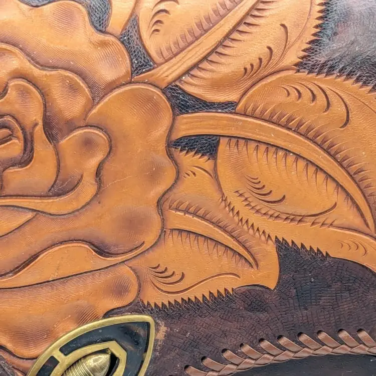 Vintage hand tooled leather purse, with suede and small zipper pocket inside. Large rose design with a miniature horse head at bottom. Measurements of the bag are in the photos, strap drop is approximately 16 in. Toggle closure, detachable shoulder strap. excellent vintage condition. a few stitches on the interior seam are loose, but otherwise absolutely gorgeous. unique and you won't see another one like this.