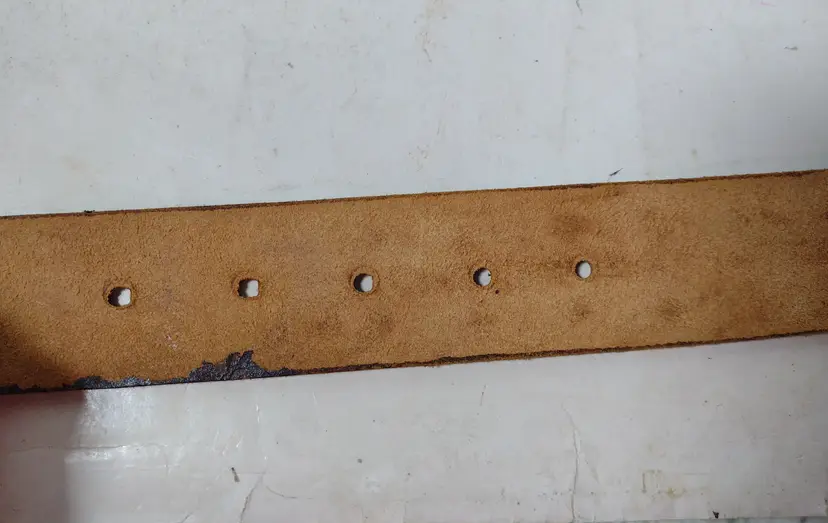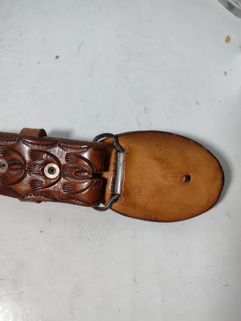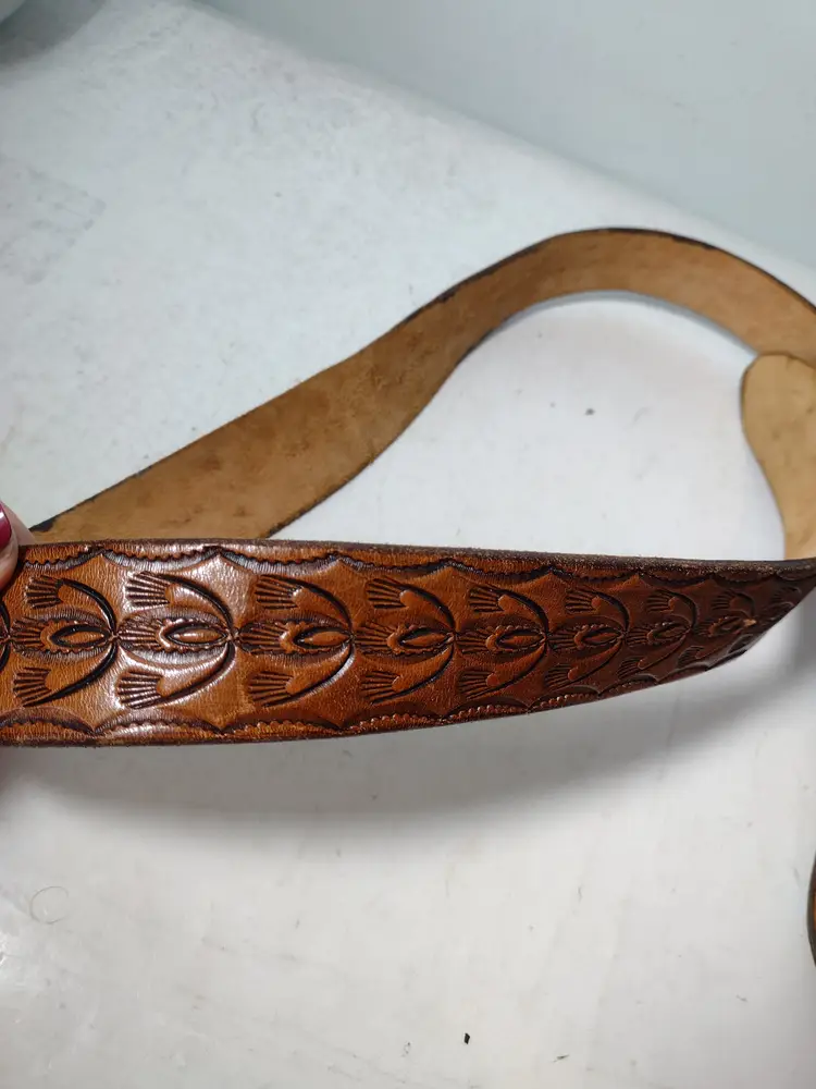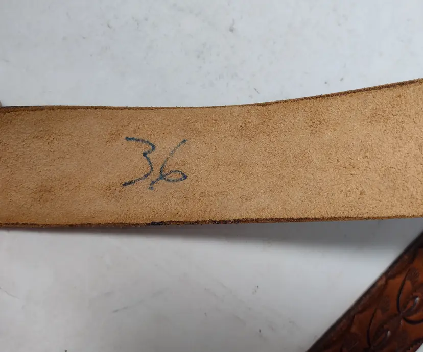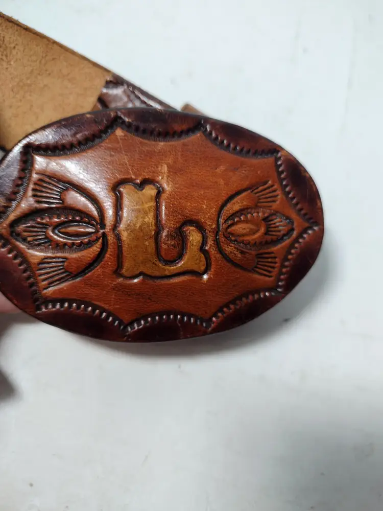 This is a very nice handmade leather belt with a great design etched in and a letter L on the buckle. End to end belt without buckle measures 40.5" x 1.5" wide.