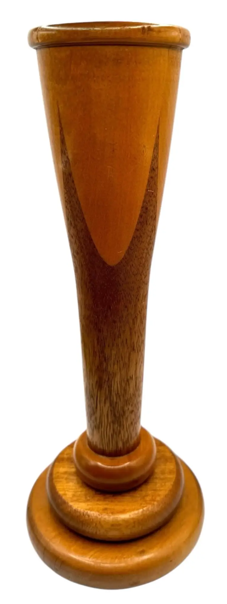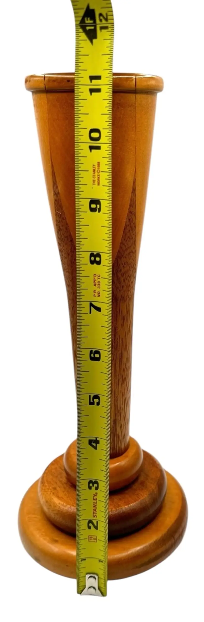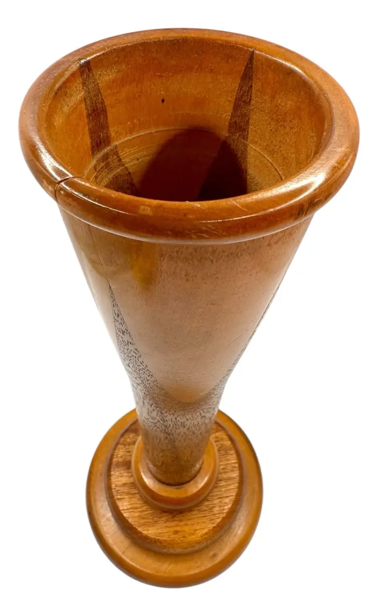 Handcrafted wood vase with inlaid pieces in a crown-like shape.