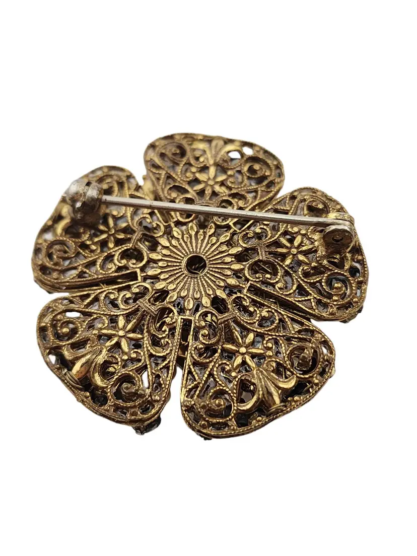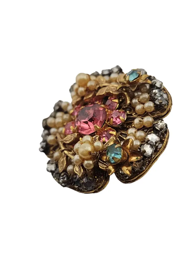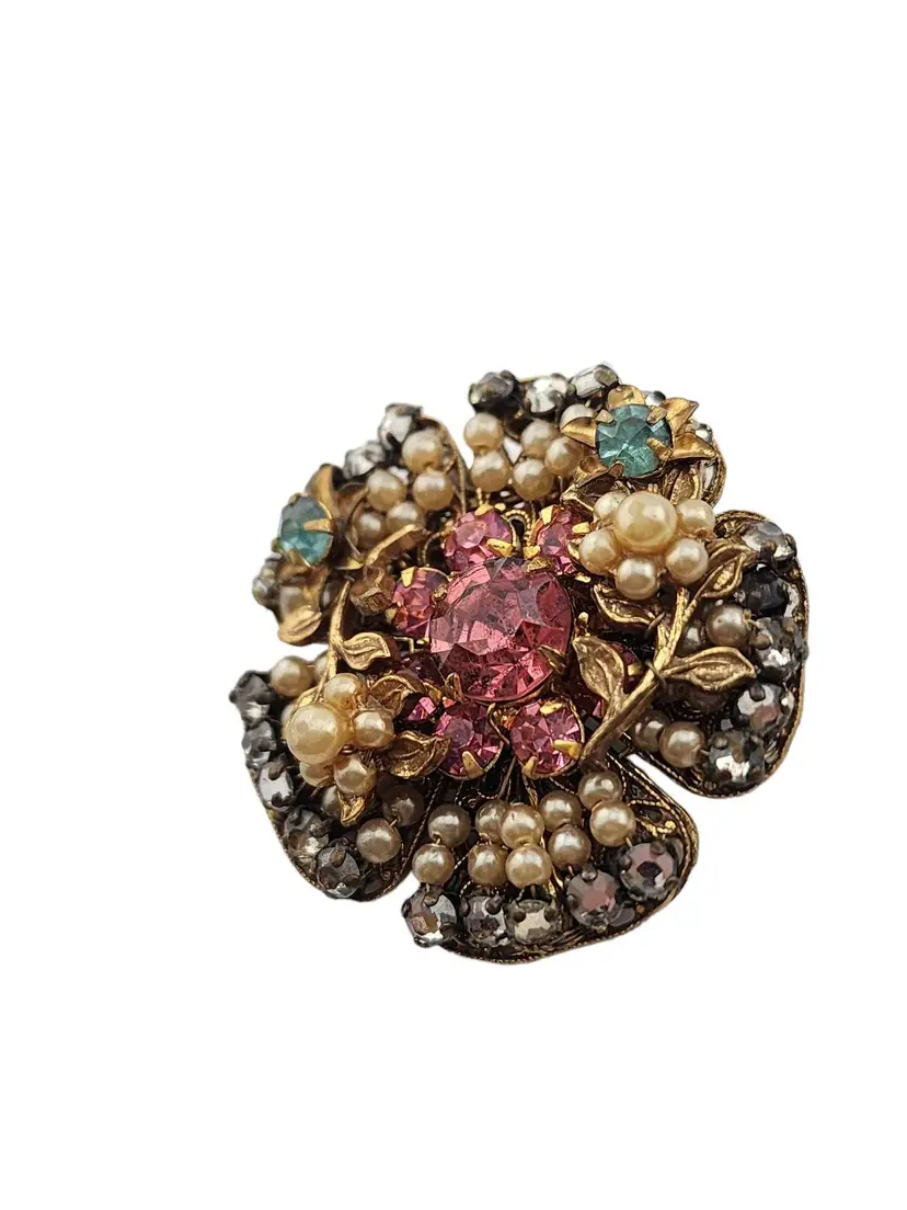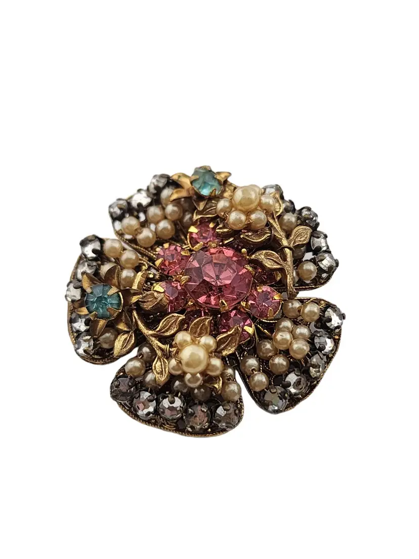 Vintage Hand-Wired Pearl and Rhinestone Brass Brooch (A3327)
