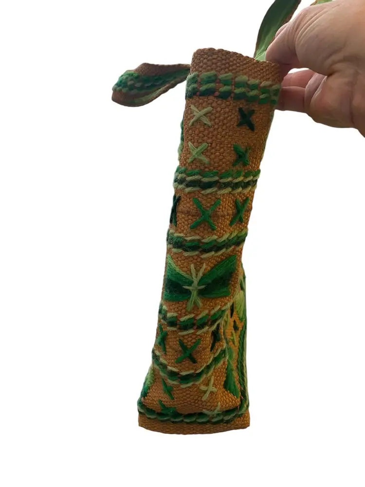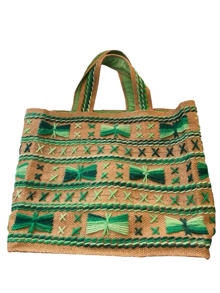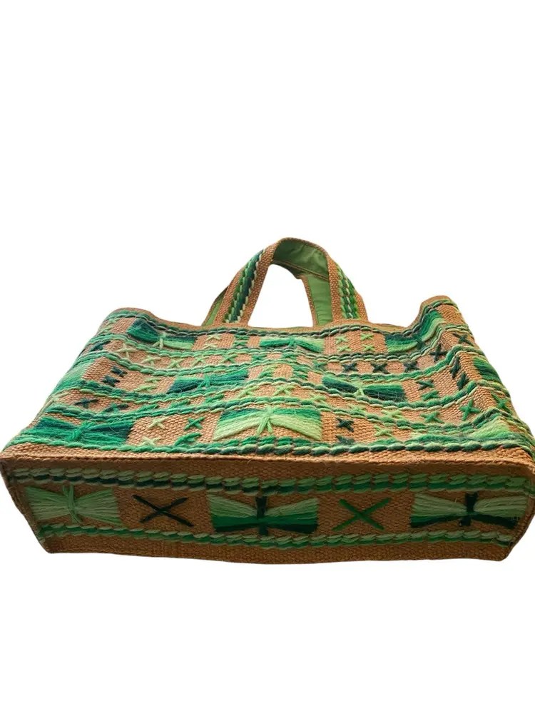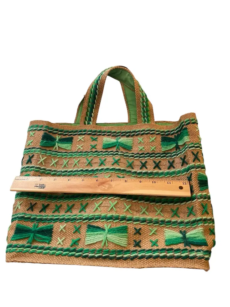 Vintage Handbag Woven Green Purse Crewelwork Design Ombre Green Yarn Burlap Rectangle Satchel Wide Handle Avocado Green Interior 1970’s butterflies